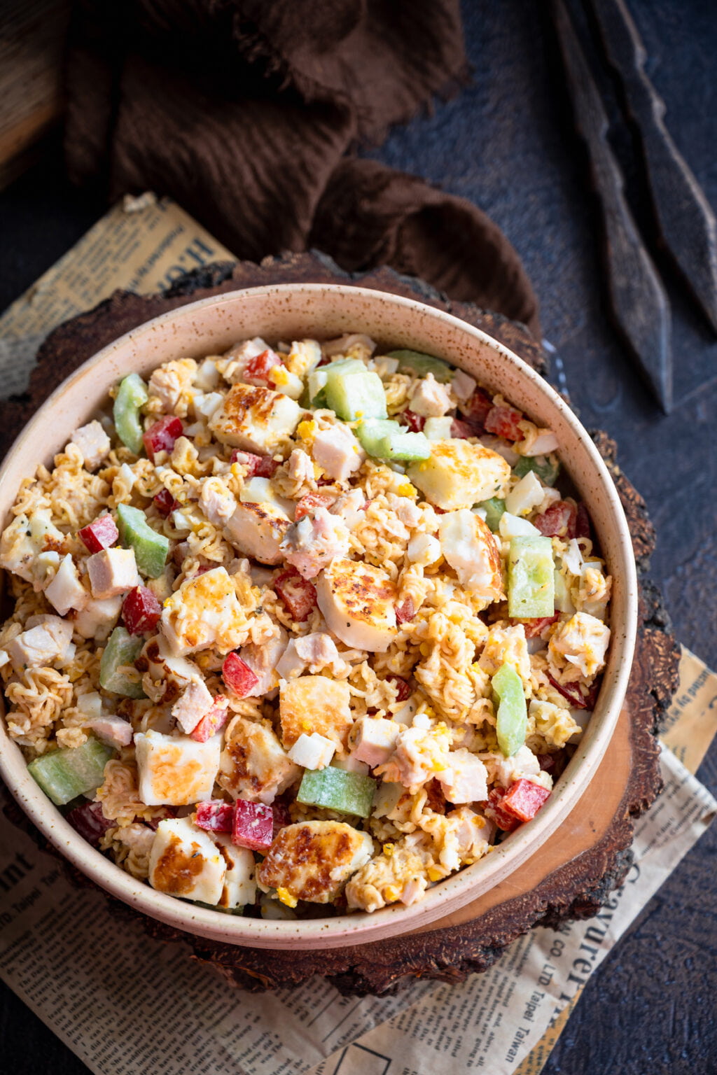 Makaron z zupek chińskich kruszymy do miski, łączymy z majonezem. Odstawiamy, by makaron nieco napęczniał (suchy makaron połączony z majonezem finalnie nie wyjdzie jakoś mocno miękki, jeśli chcesz, możesz też makaron zalać około 1,5 – 2 szklankami wrzątku, odstawić na 3-5 minut, a następnie odcedzić. Wówczas możesz użyć do sałatki mniejszej ilości majonezu. Dodajemy go na końcu, mieszając ze wszystkimi składnikami).