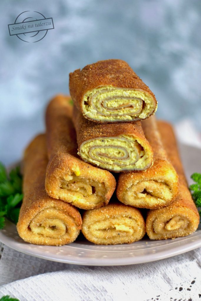 Na naleśniki wykładamy nadzienie (niezbyt grubą warstwę). Zwijamy jak na krokiety. Panierujemy w jajku i bułce tartej i podsmażamy na niewielkiej ilości klarowanego masła.