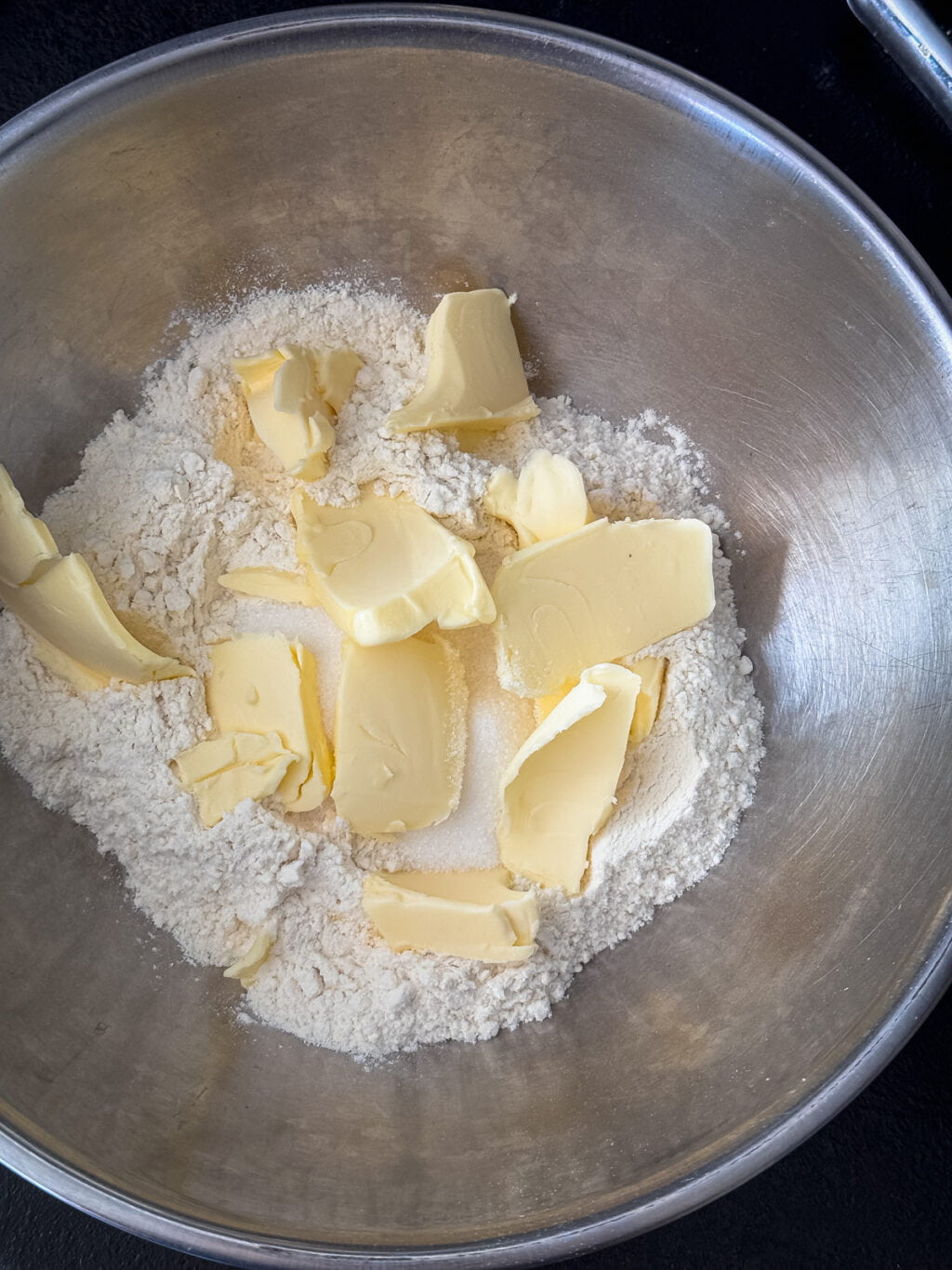 W misce umieszczamy: mąkę, cukier, proszek do pieczenia oraz pokrojone w kostkę masło. Składniki rozcieramy między palcami, aż do powstania kruszonki.