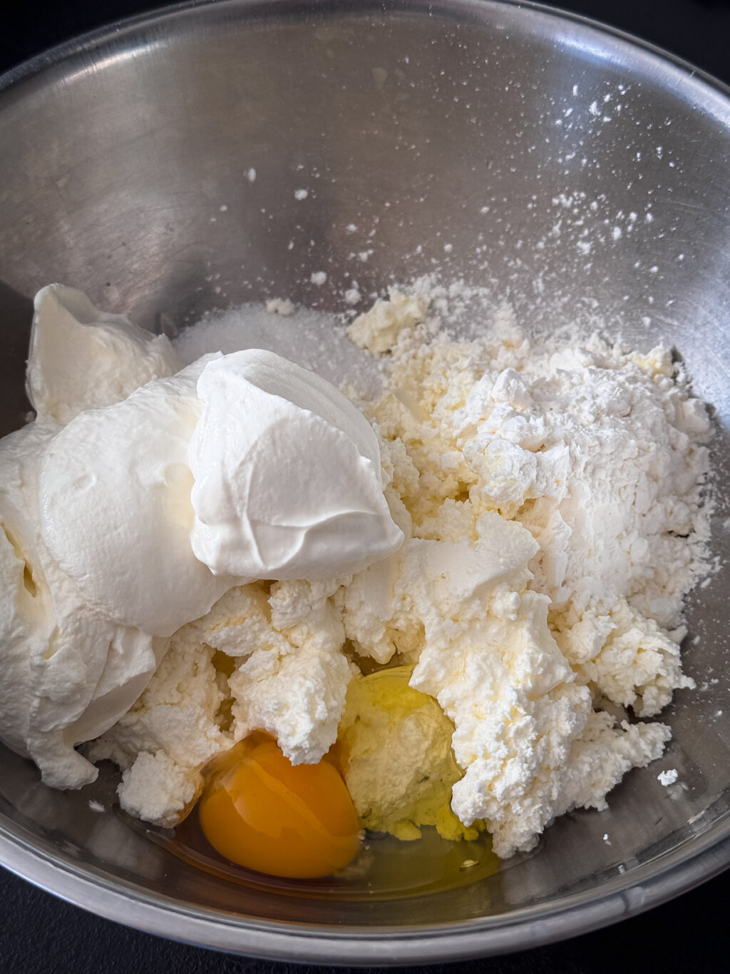 W misce umieszczamy: twaróg, cukier, jajko, kwaśną śmietanę oraz proszek budyniowy.