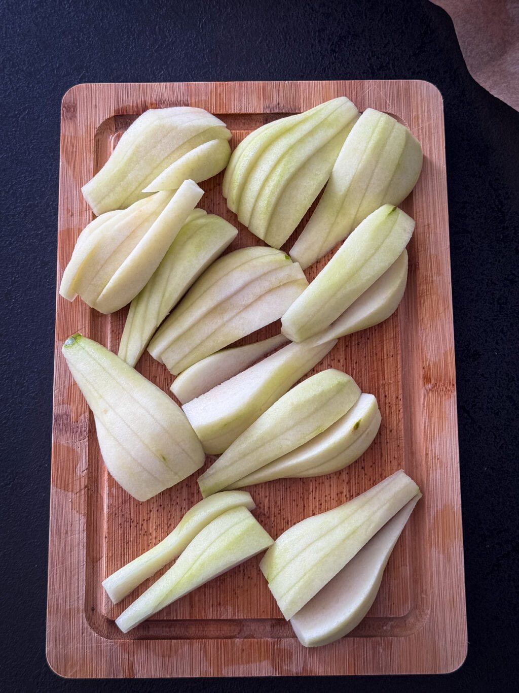 Gruszki obieramy, usuwamy gniazda nasienne, kroimy na ćwiartki, a następnie na cienkie plasterki. Można skropić je sokiem z cytryny, by nie ciemniały.