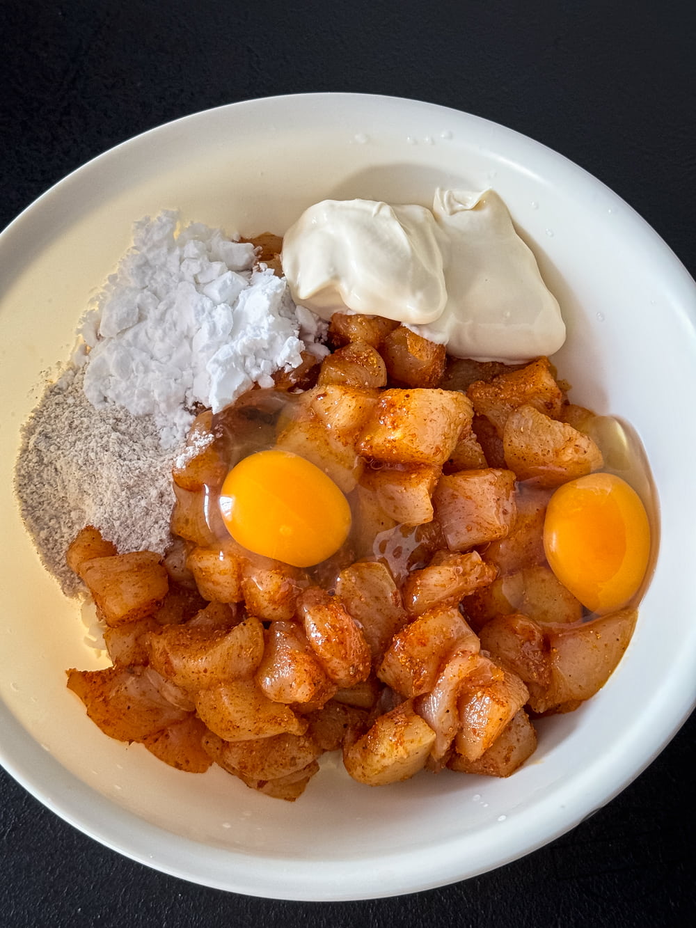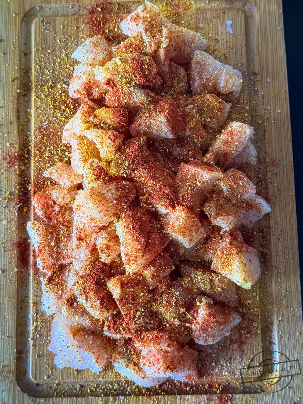 Mięso kroimy w drobną kostkę, oprószamy solą, pieprzem, curry oraz mieloną papryką słodką i ostrą. Mieszamy.