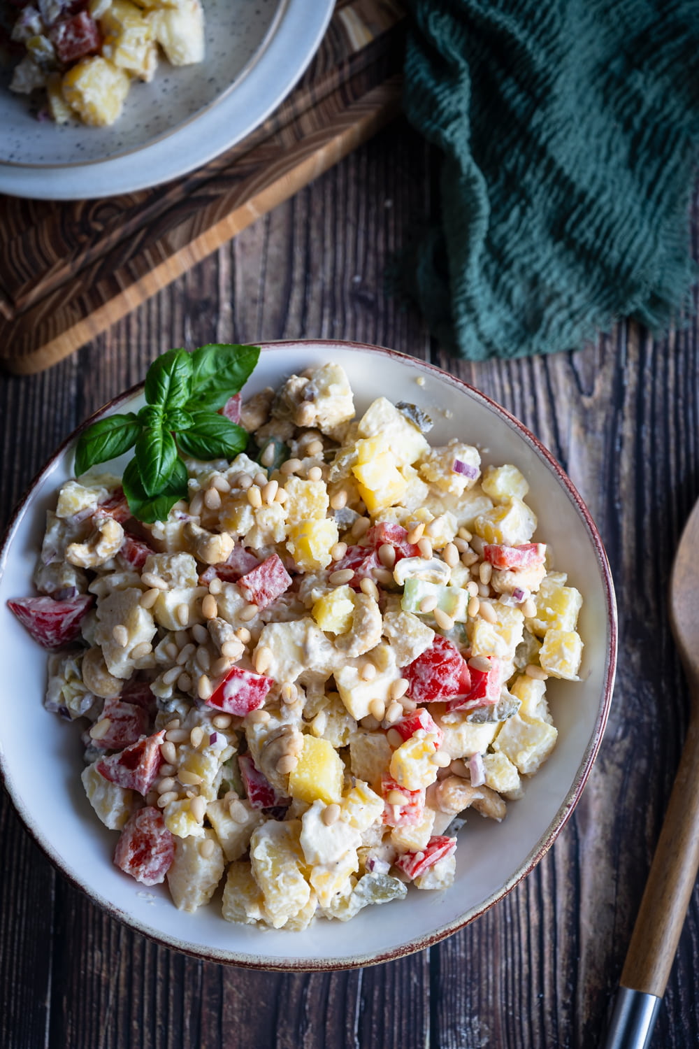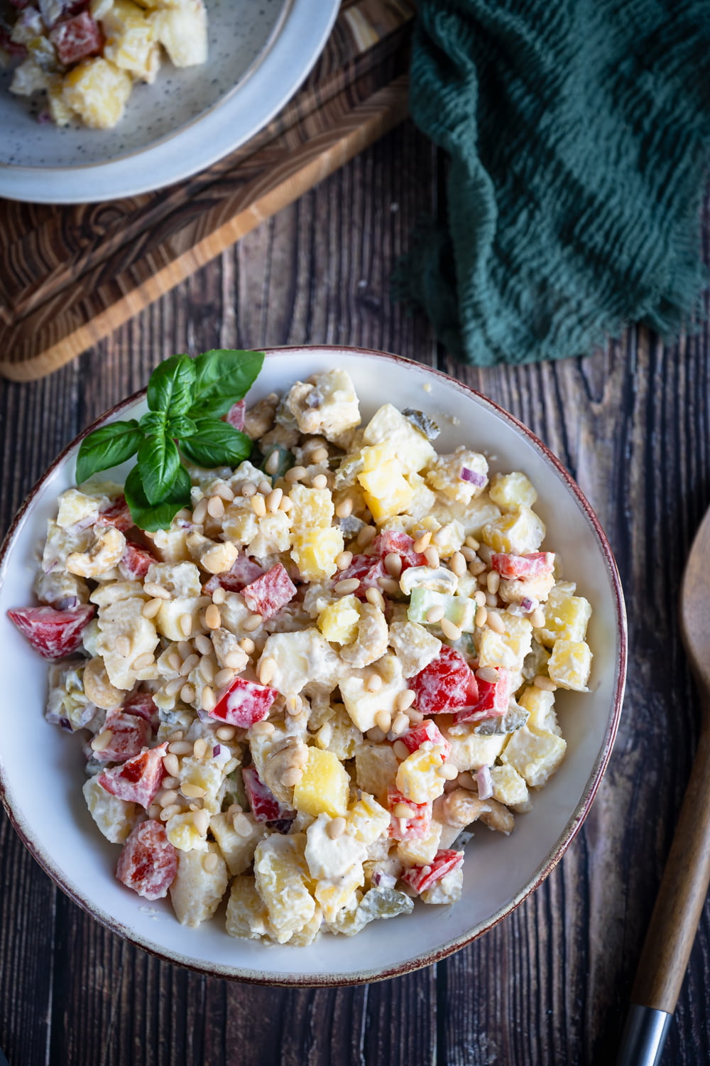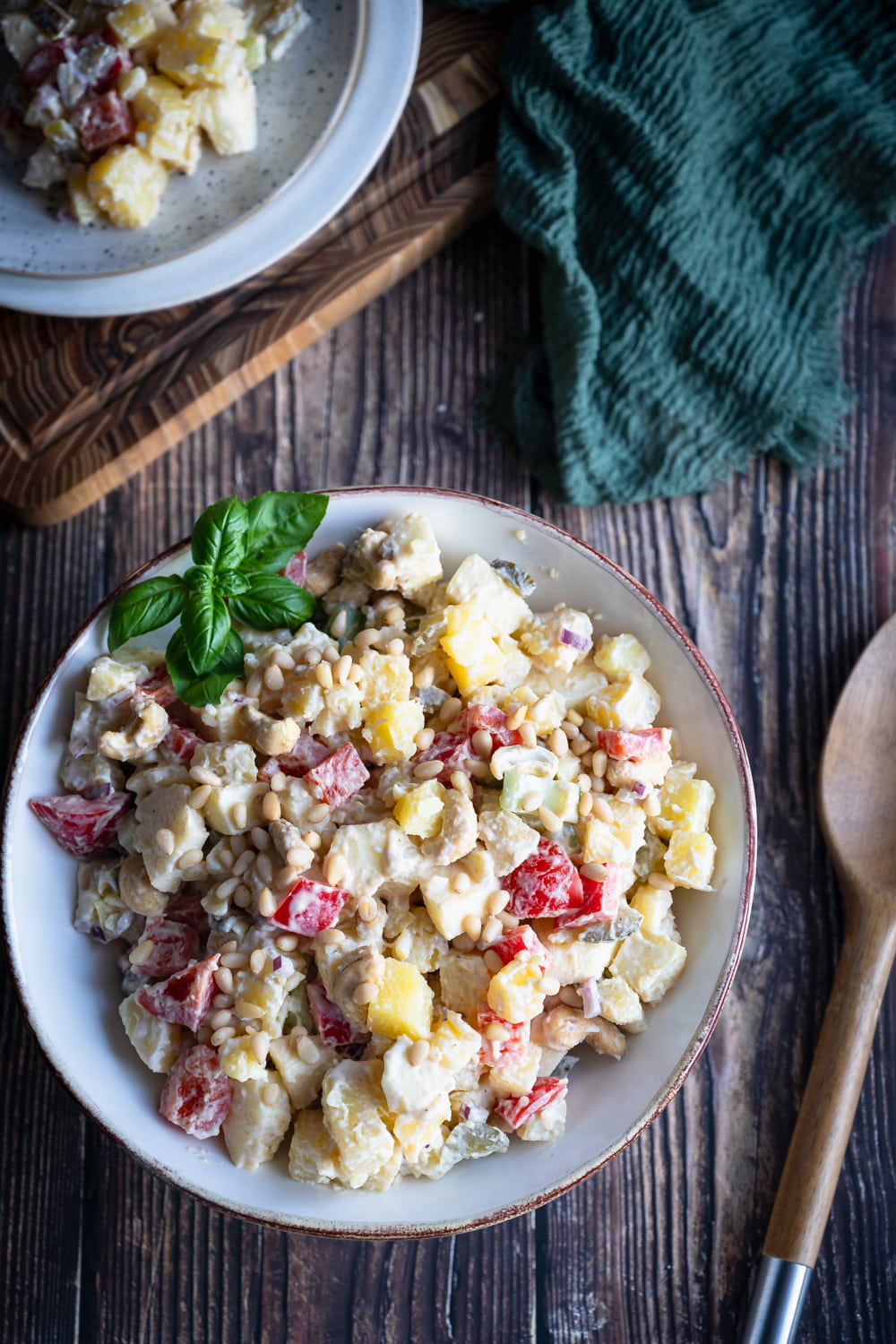 Czasem wystarczy kilka składników, by stworzyć coś naprawdę wyjątkowego. Ta sałatka ziemniaczana z jabłkiem i orzeszkami jest tego doskonałym przykładem. Jest prosta, ale z charakterem. Klasyczne ziemniaki łączą się tu z chrupiącym jabłkiem, papryką i dwoma rodzajami ogórków: świeżym i konserwowym. Całość uzupełniają orzeszki piniowe oraz nerkowce, które dodają sałatce ciekawej tekstury.