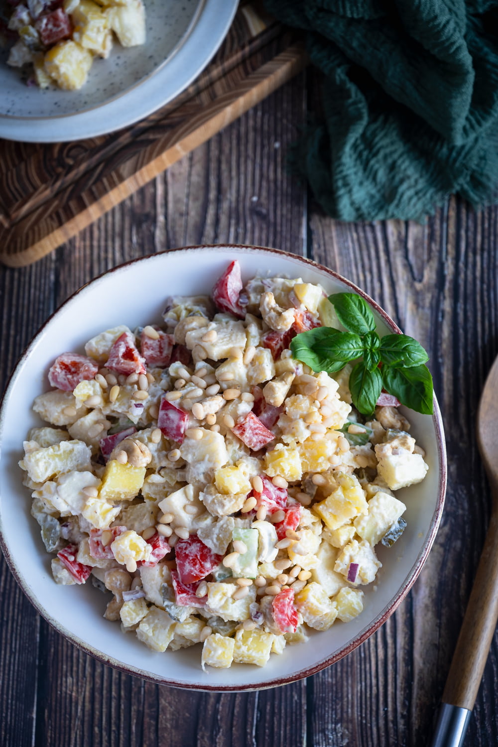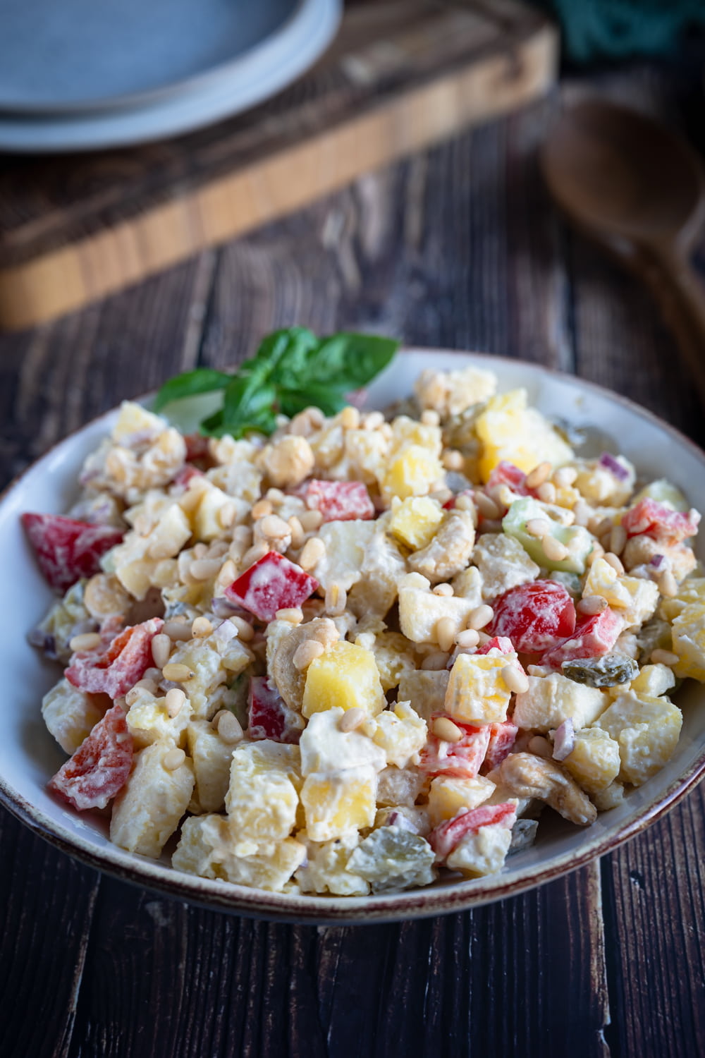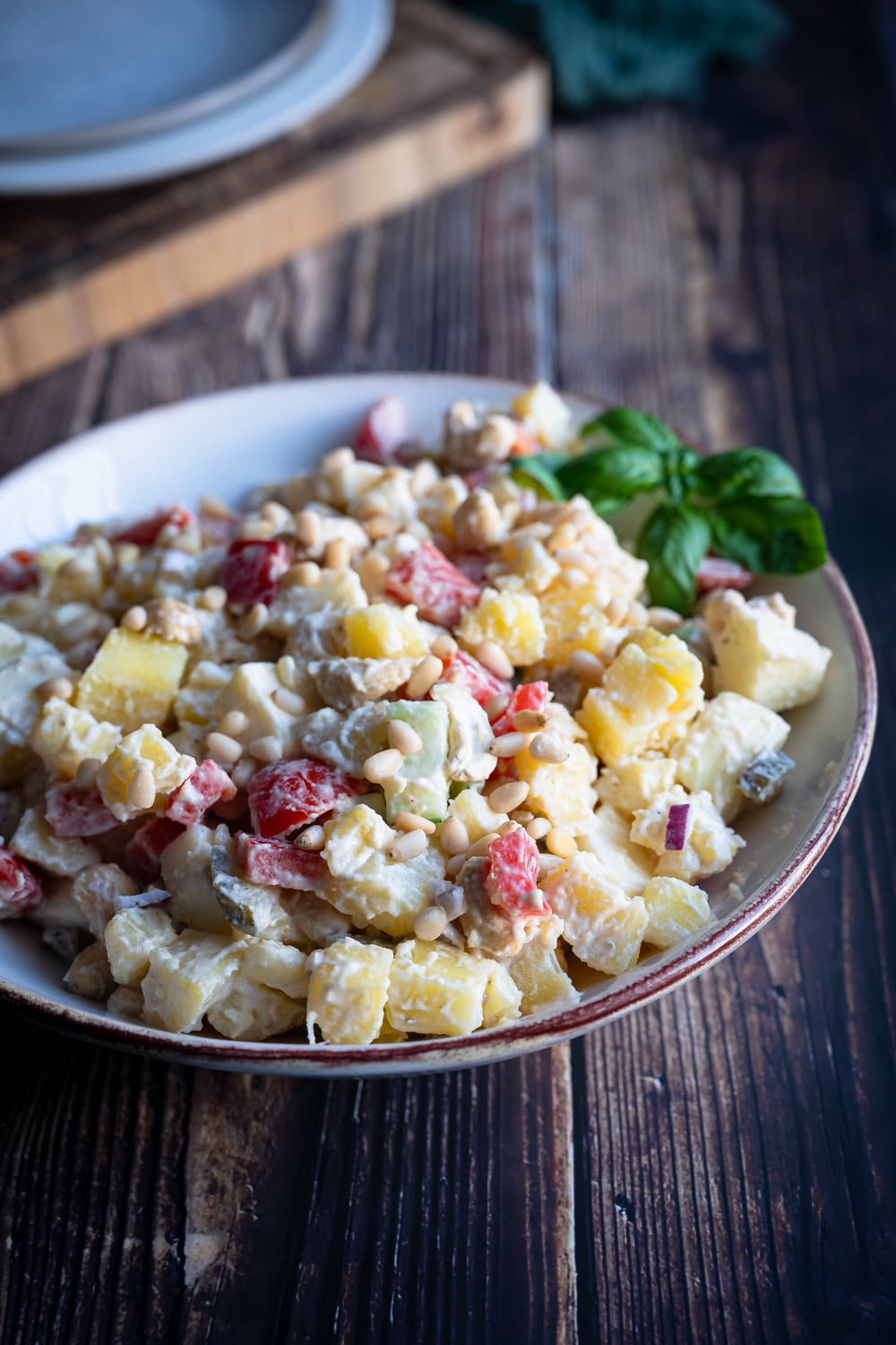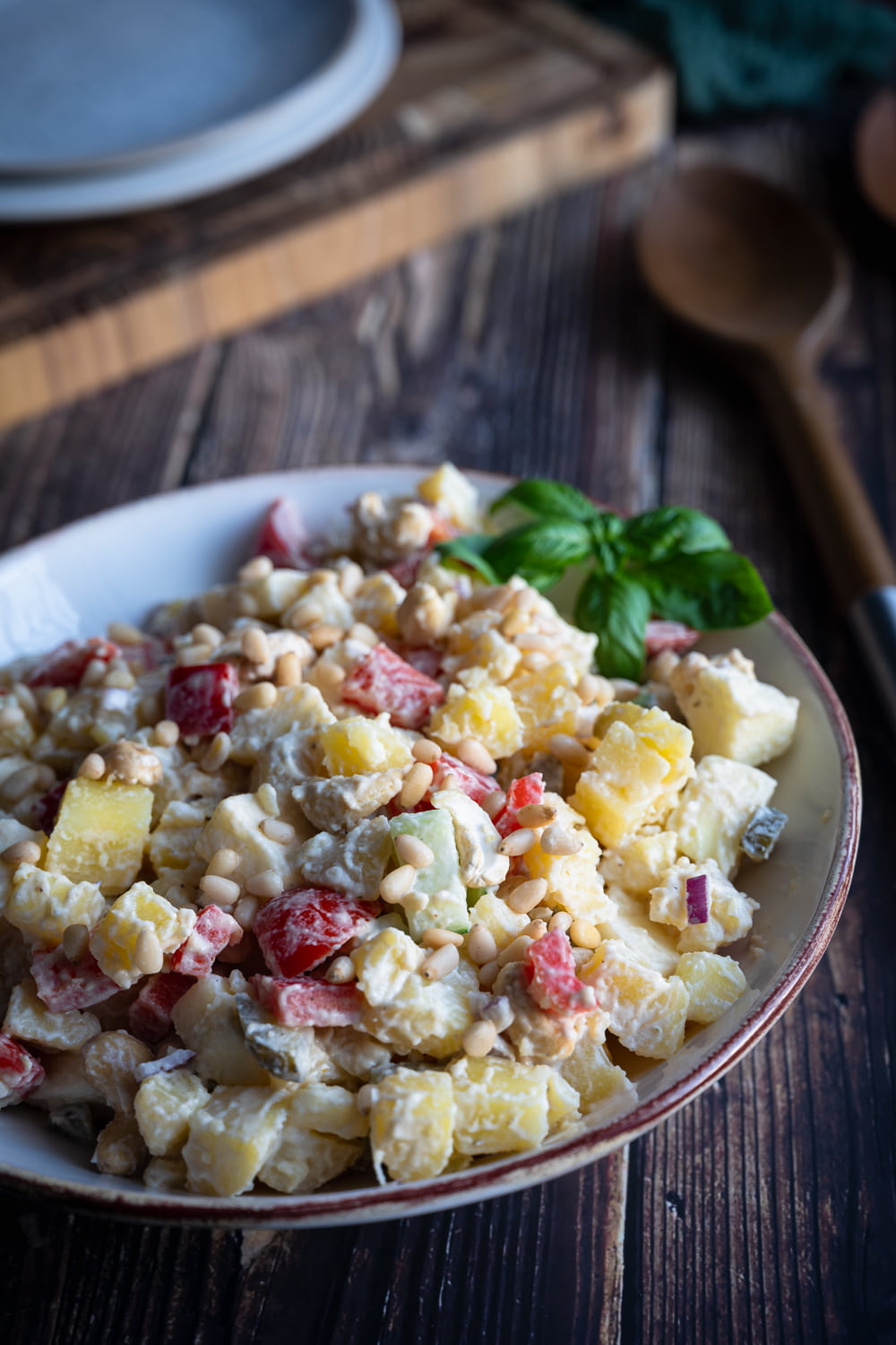 Czasem wystarczy kilka składników, by stworzyć coś naprawdę wyjątkowego. Ta sałatka ziemniaczana z jabłkiem i orzeszkami jest tego doskonałym przykładem. Jest prosta, ale z charakterem. Klasyczne ziemniaki łączą się tu z chrupiącym jabłkiem, papryką i dwoma rodzajami ogórków: świeżym i konserwowym. Całość uzupełniają orzeszki piniowe oraz nerkowce, które dodają sałatce ciekawej tekstury.