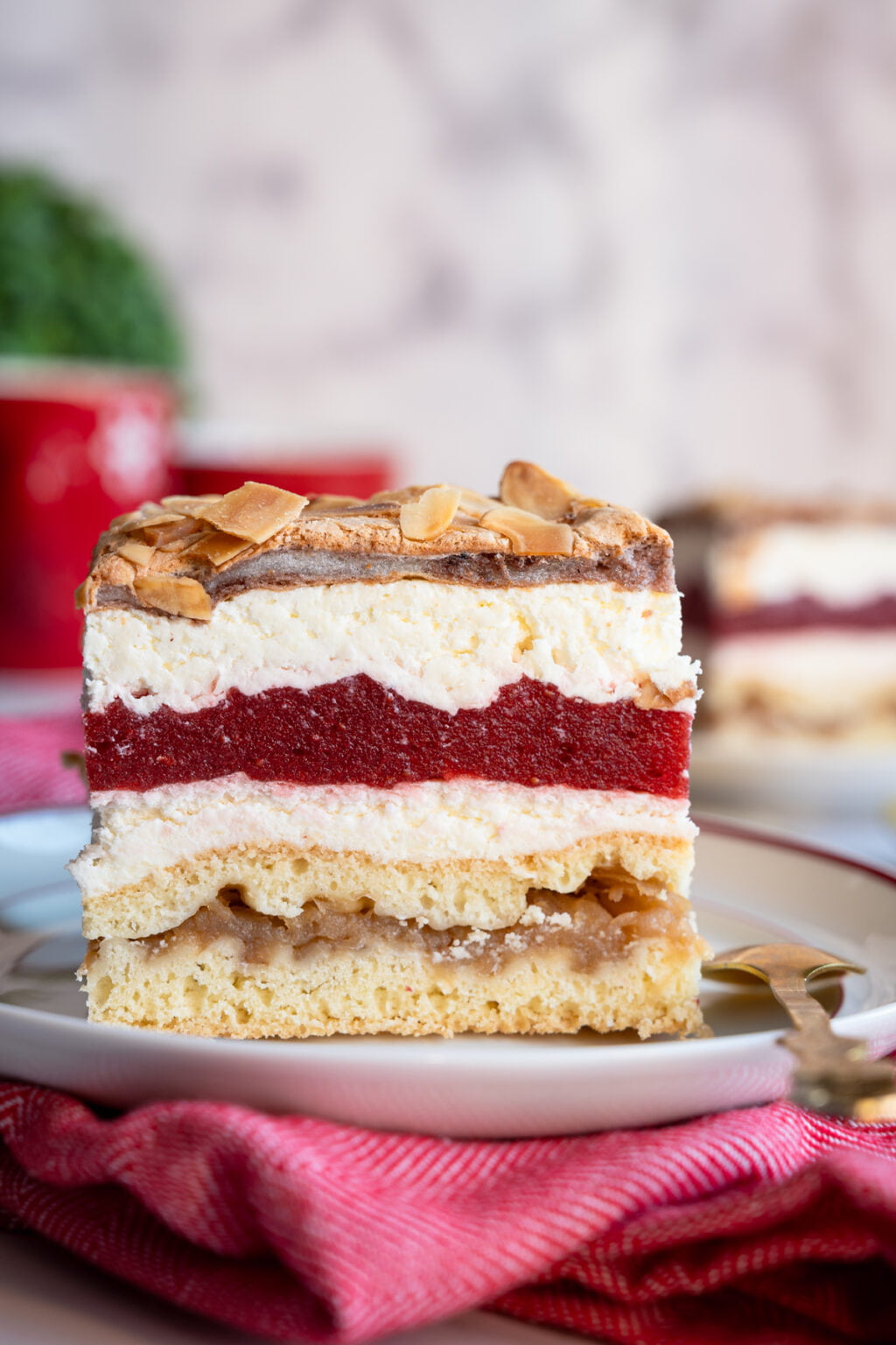 Na kruche ciasto z jabłkami wykładamy połowę masy śmietanowej. Wykładamy tężejącą masę truskawkową. Dajemy pozostałą masę śmietanową (najłatwiej rozprowadzić i wyrównać ją szpatułką do kremów). Na wierzch dajemy przygotowaną bezę.