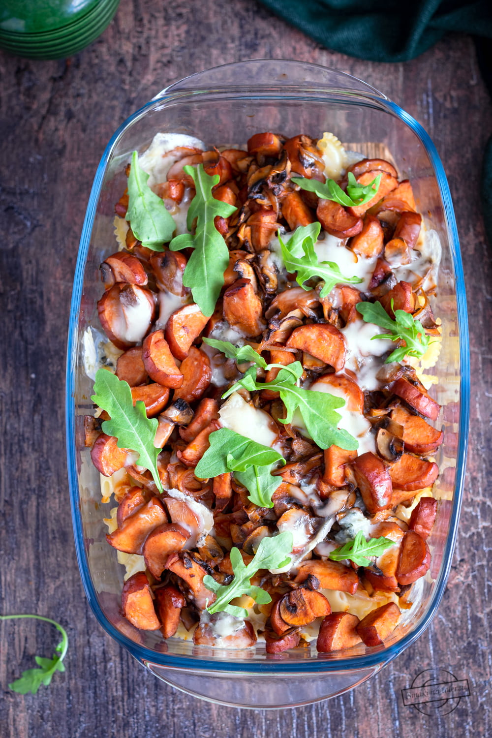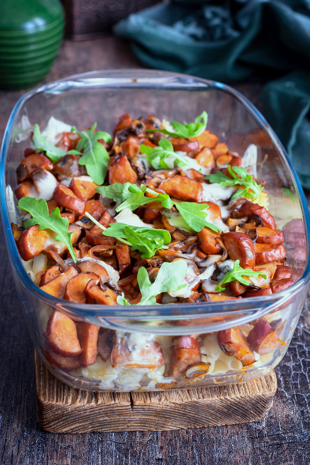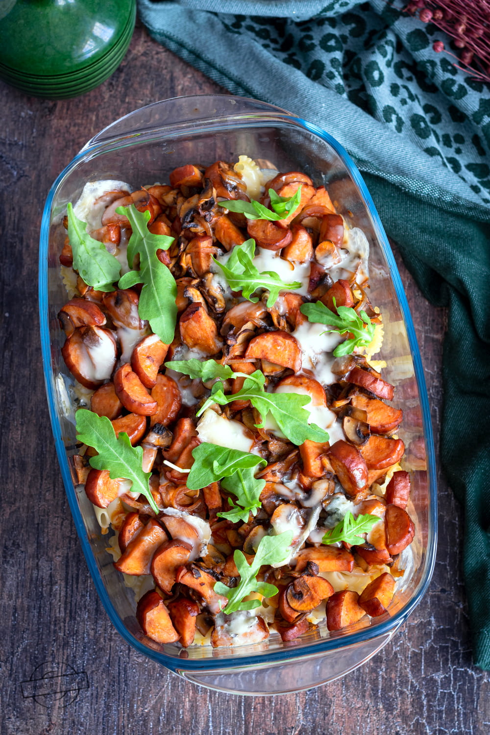Zapiekanka makaronowa z kiełbasą, pieczarkami i gorgonzolą