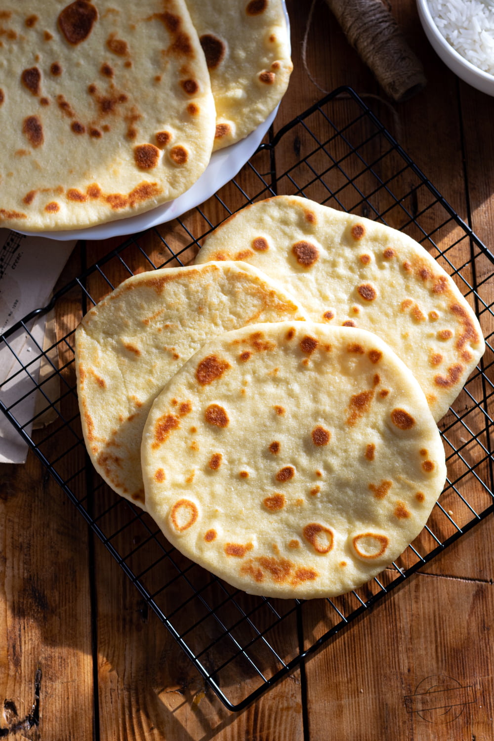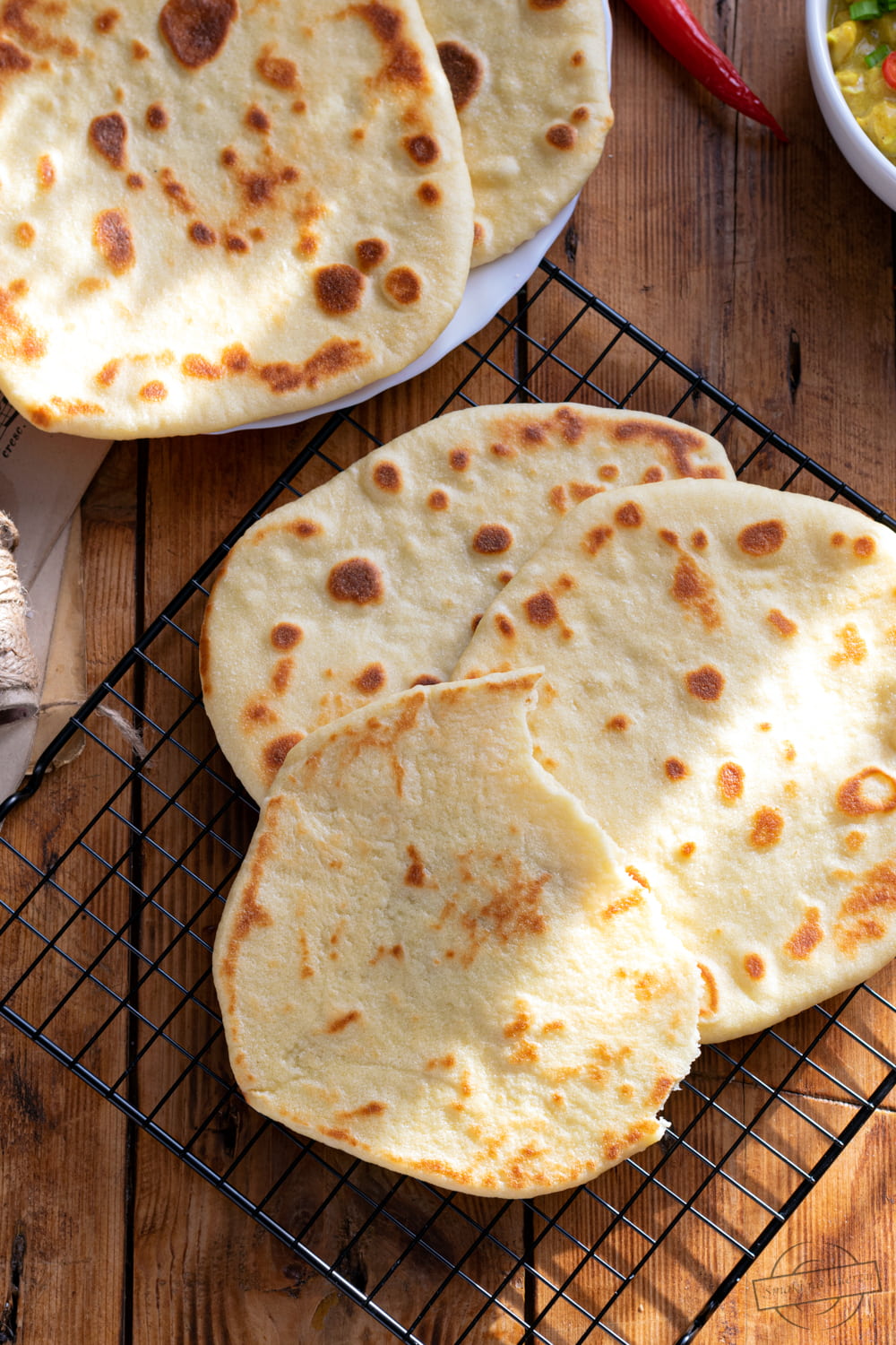 UWAGA! *Z chlebkami najlepiej pracować pojedynczo, czyli najpierw wałkujemy jeden placek, przenosimy go na patelnię i dopiero po odwróceniu go na drugą stronę, szykujemy kolejny chlebek. W tym czasie pozostałe ciasto trzymamy w misce, przykryte ściereczką, aby nie obsychało.