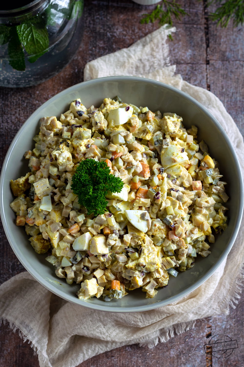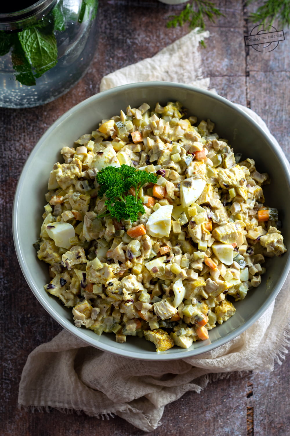 Choć sałatka z kurczakiem, marynowanymi pieczarkami i marchewką wizualnie nie robi najlepszego wrażenia (winne są tu głównie marynowane pieczarki i ich bury kolor😉), to smak rekompensuje wszystko. Jest sycąca, aromatyczna i doskonale sprawdzi się jako dodatek do smażonej w cieście piwnym ryby. Równie dobrze będzie się komponować podana ze świeżym pieczywem czy solo.