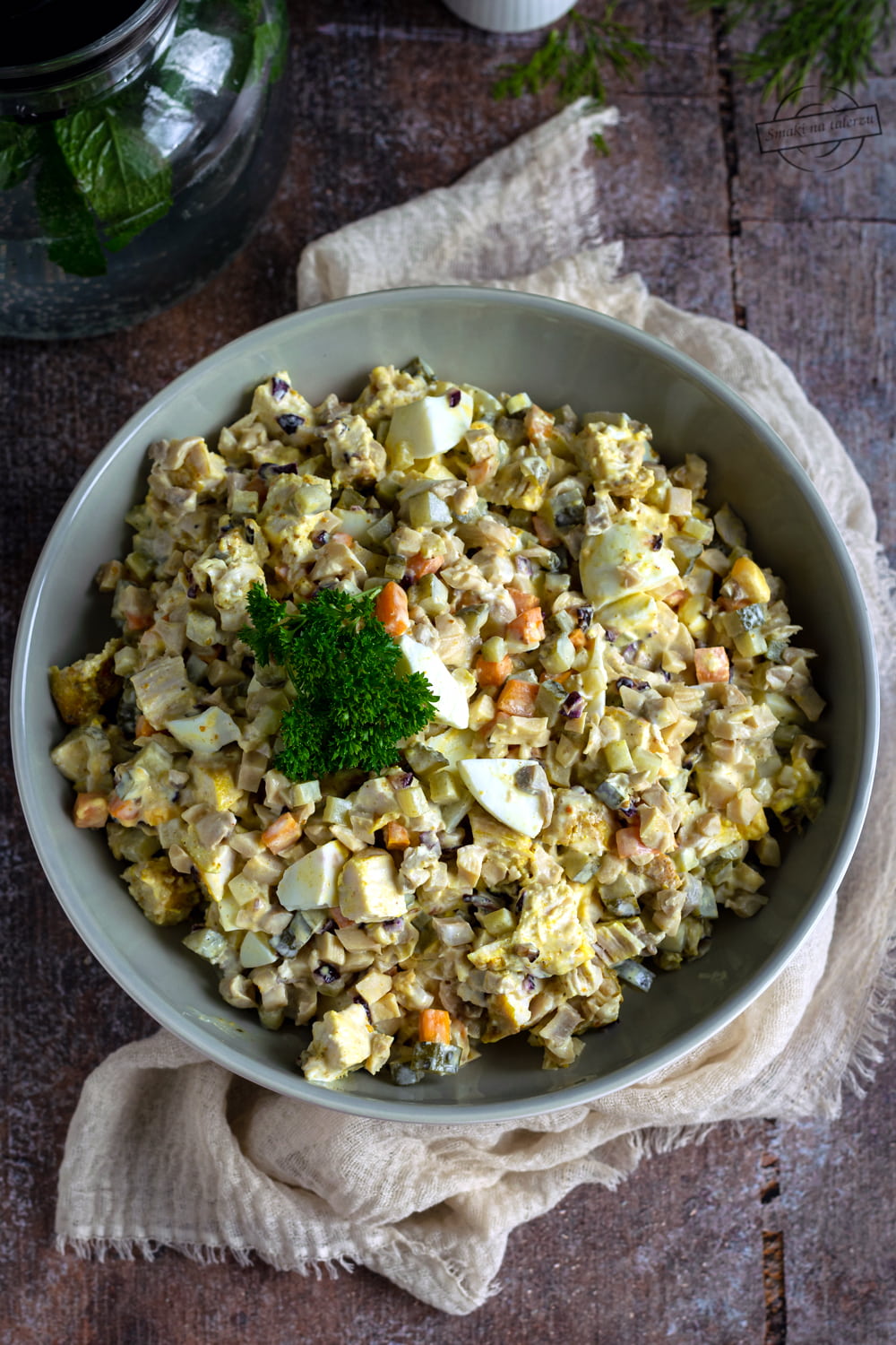 Wszystkie składniki umieszczamy w misce, dodajemy majonez, doprawiamy solą oraz pieprzem do smaku. Odstawiamy do schłodzenia.