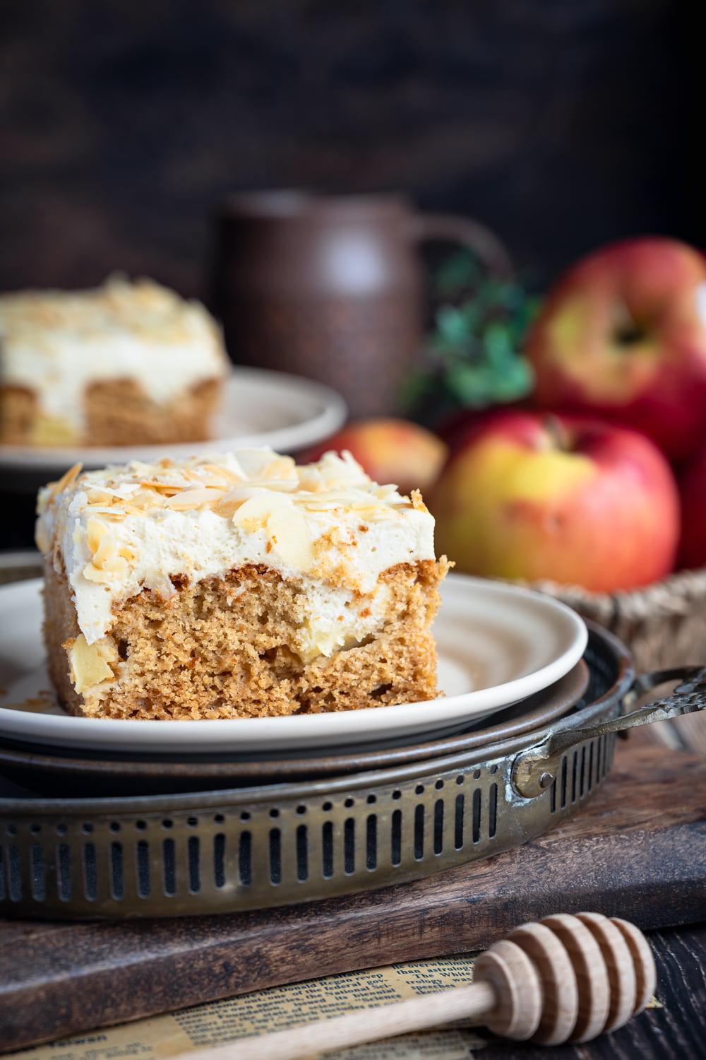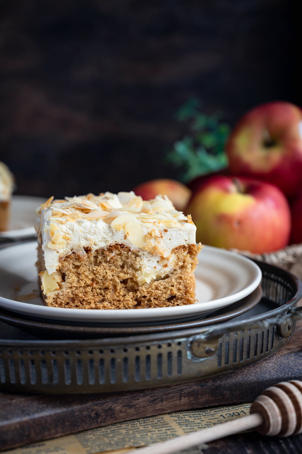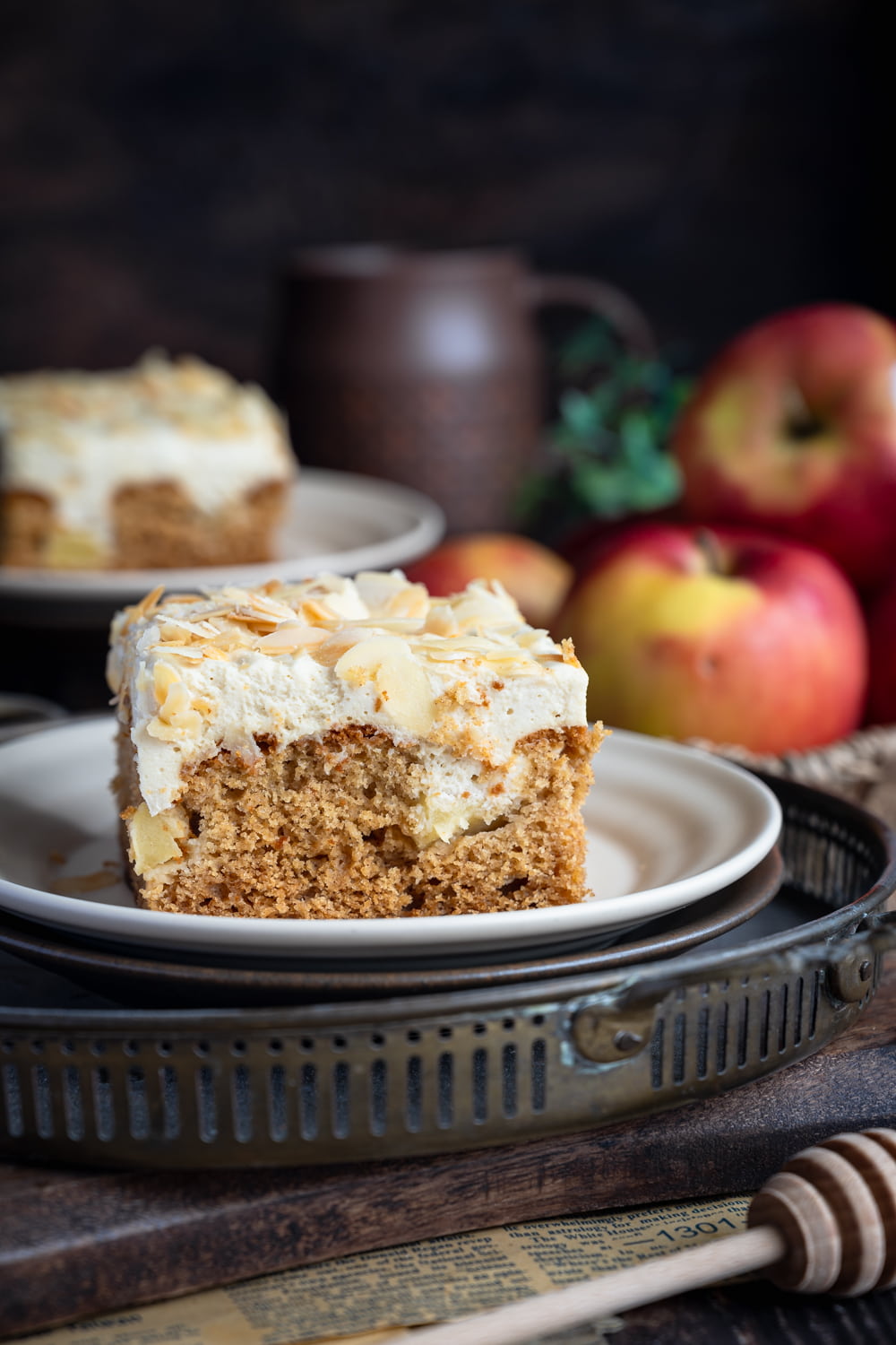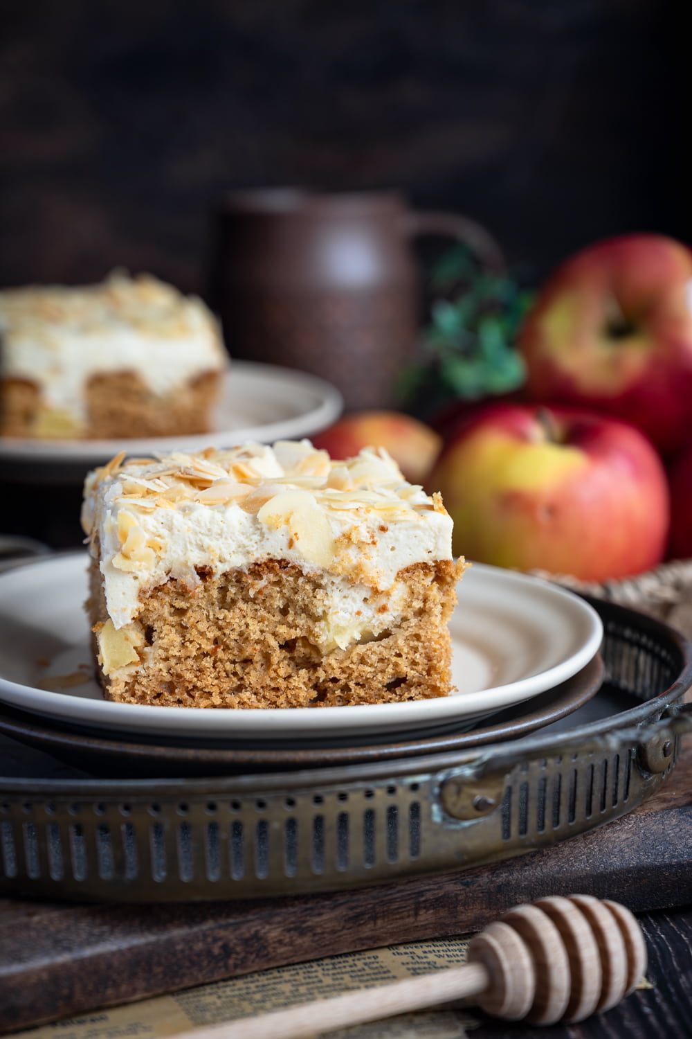 Krem z dodatkiem białej czekolady ma aksamitną konsystencję i pięknie dopełnia smak miodowego ciasta. Mimo obecności chałwy i czekolady deser nie jest przesłodzony. Dodatek jabłek w cieście nadaje mu lekkości i przyjemnej wilgotności.