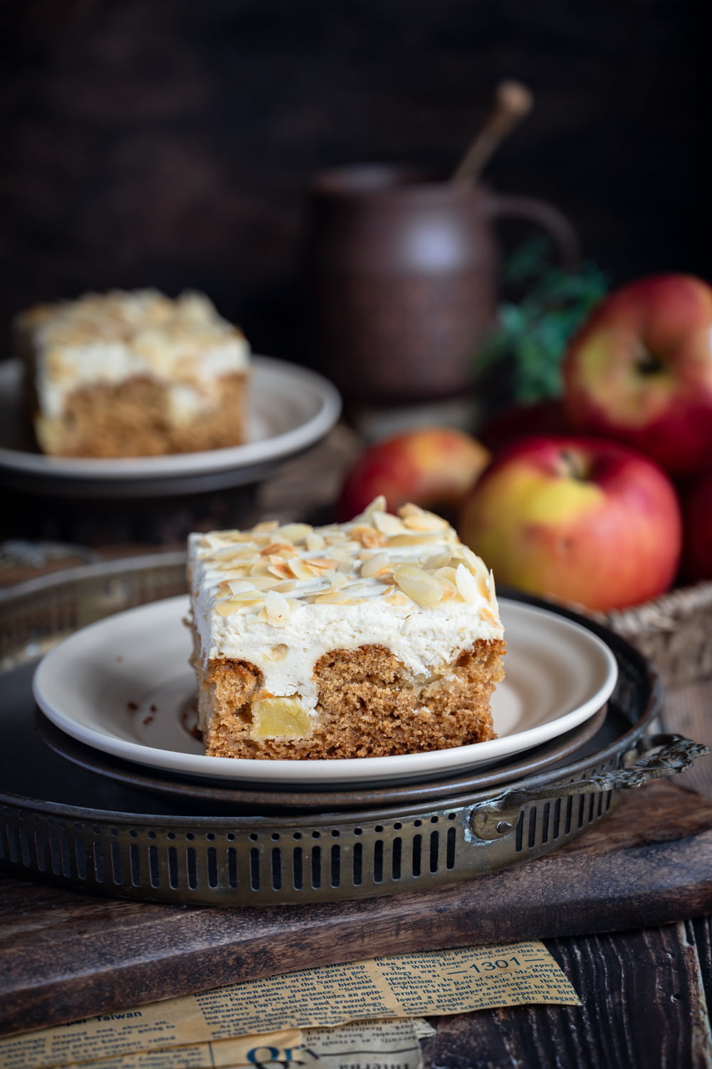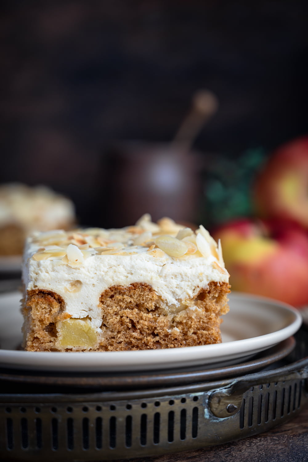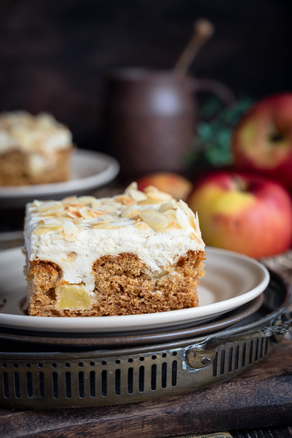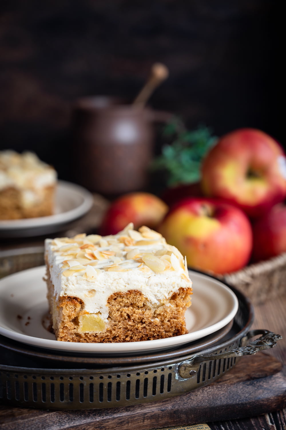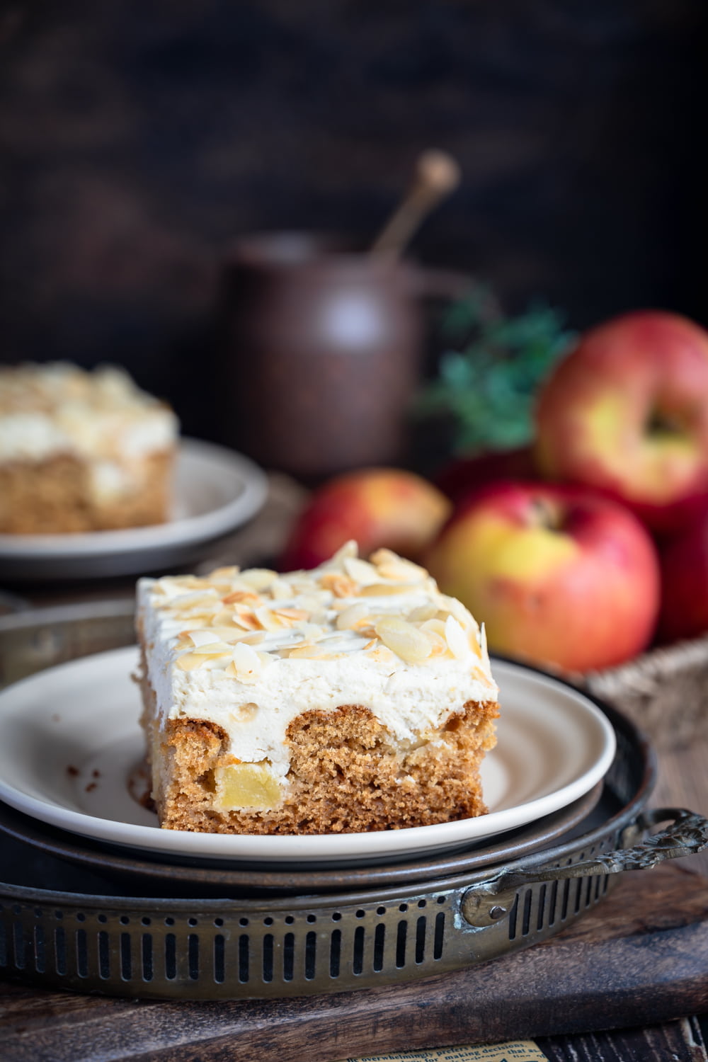 Krem z dodatkiem białej czekolady ma aksamitną konsystencję i pięknie dopełnia smak miodowego ciasta. Mimo obecności chałwy i czekolady deser nie jest przesłodzony. Dodatek jabłek w cieście nadaje mu lekkości i przyjemnej wilgotności.