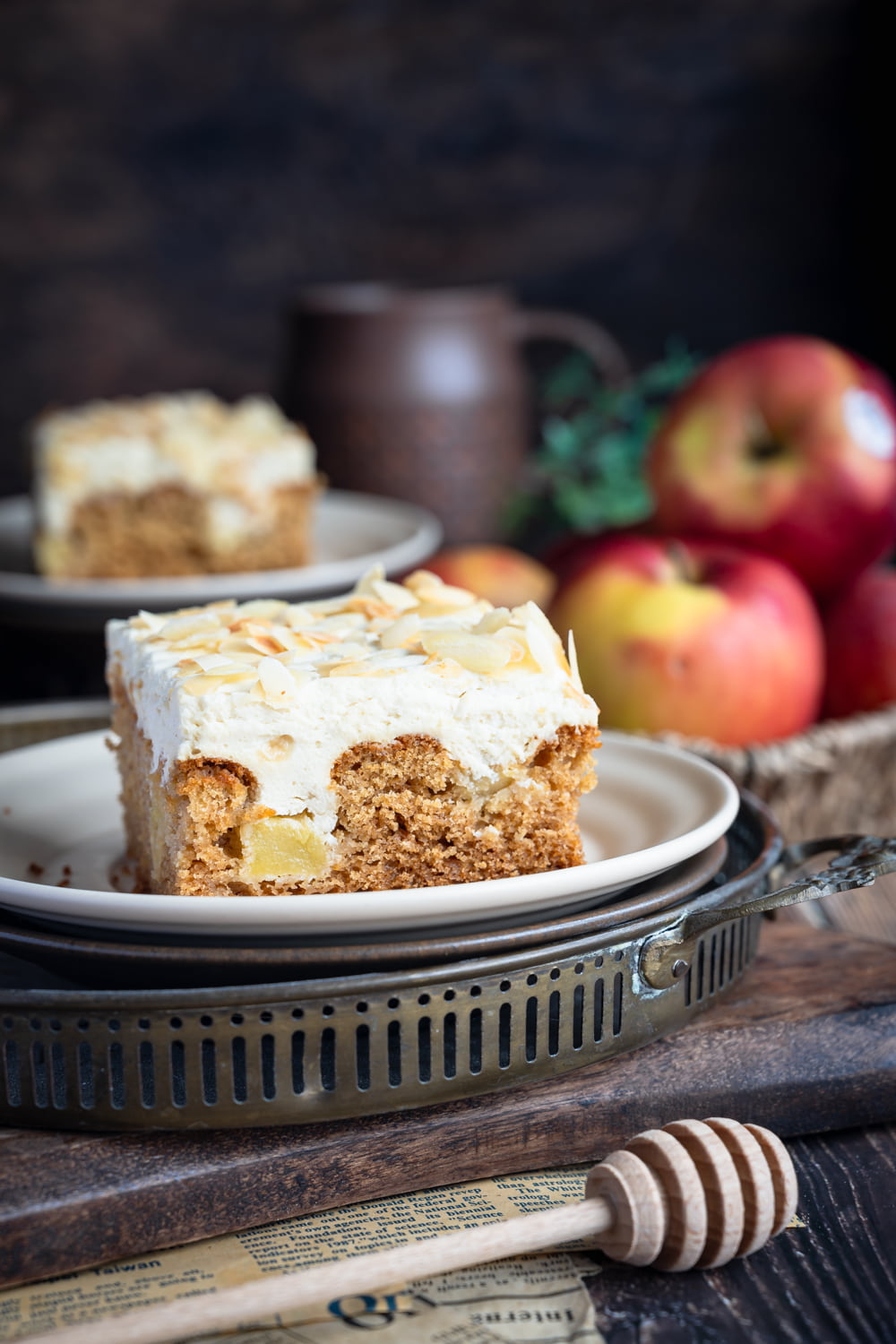 Ciasto miodowe z jabłkami i kremem chałwowym to prawdziwa uczta dla miłośników domowych słodkości. Połączenie miękkiego, delikatnie miodowego spodu z kawałkami jabłek i kremem śmietanowo-chałwowym z dodatkiem białej czekolady tworzą połączenie, które zachwyca prostotą i smakiem. Subtelne, kremowe, a przy tym wyjątkowo aromatyczne, takie właśnie powinno być idealne domowe ciasto.