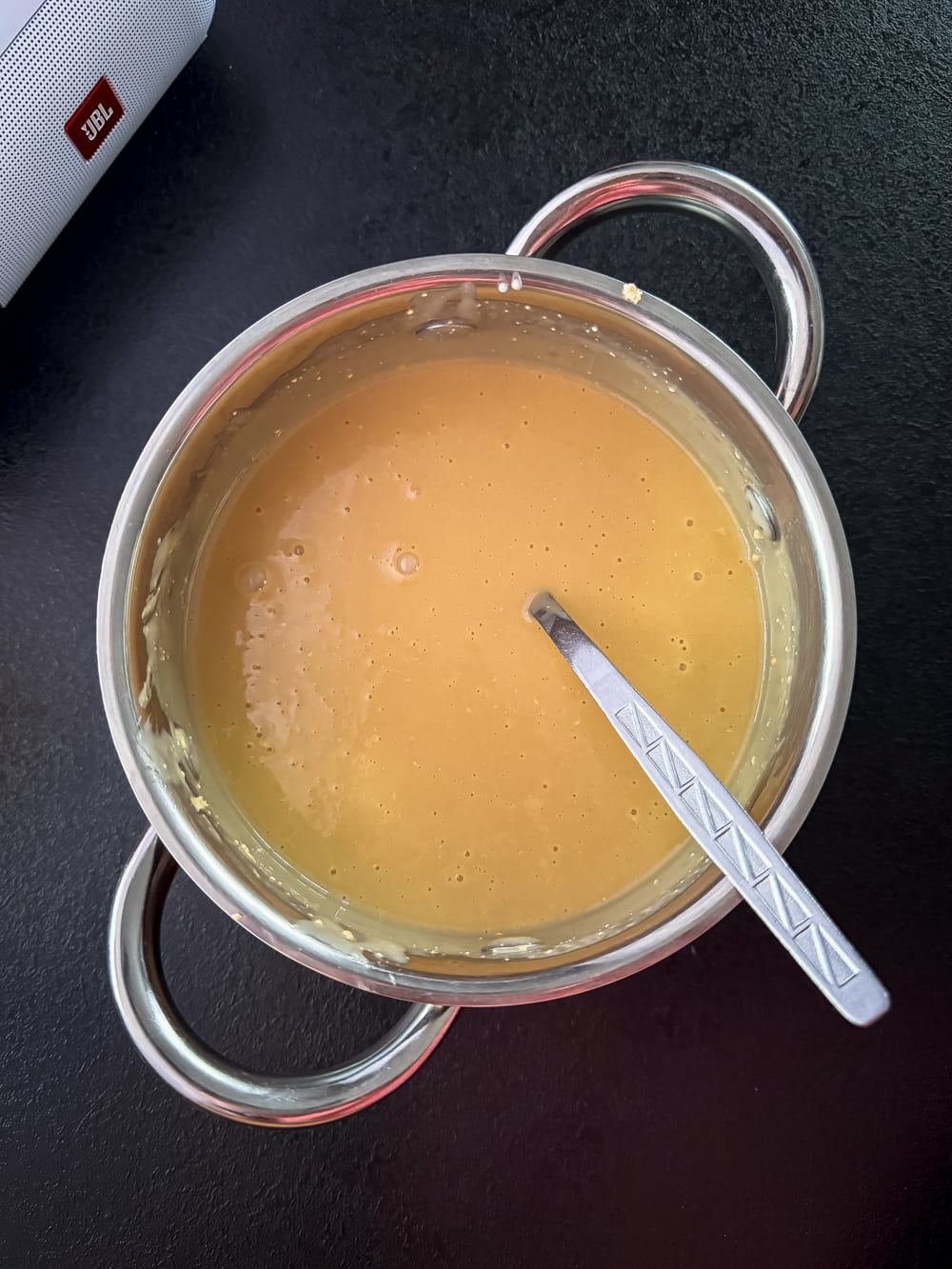 Całość mieszamy do uzyskania jednolitej masy. Odstawiamy do schłodzenia.