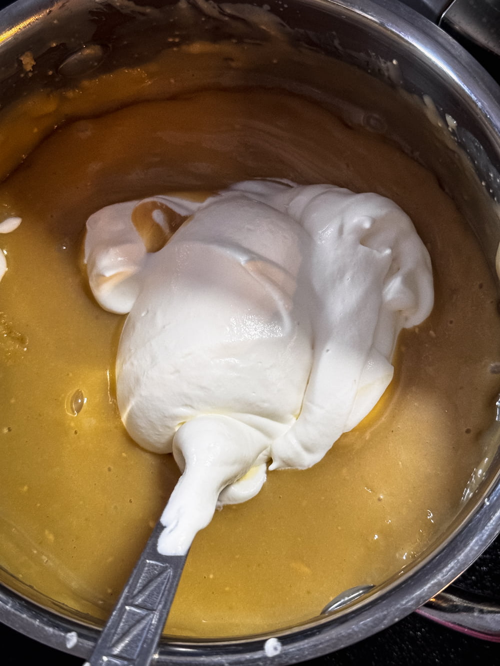 Gdy masa czekoladowo-chałwowa nieco przestygnie i zacznie delikatnie tężeć (powinna być letnia i lekko tężejąca), ubijamy na sztywno pozostałą, schłodzoną śmietankę (330 g). Obie masy łączymy ze sobą, delikatnie mieszając.