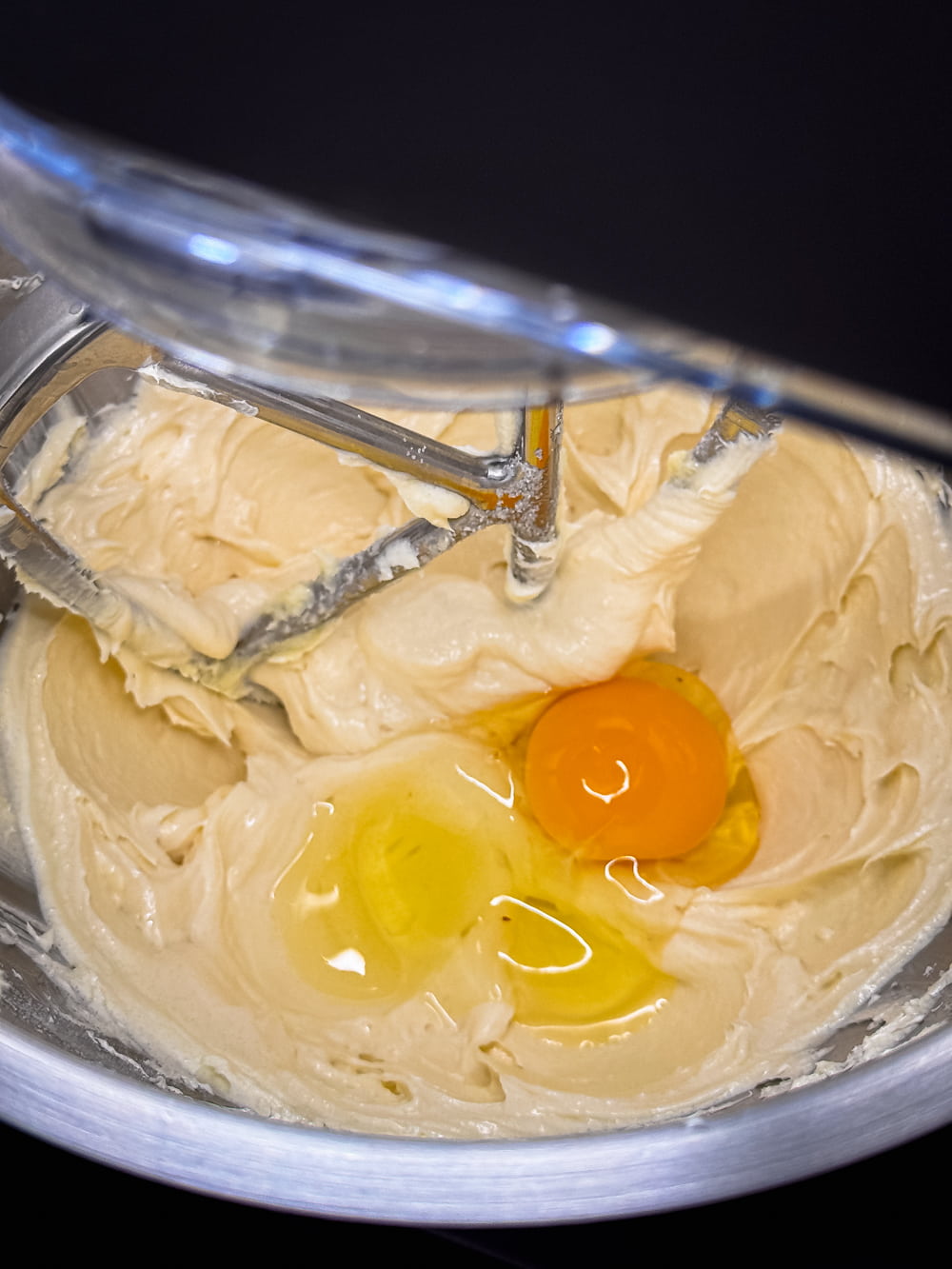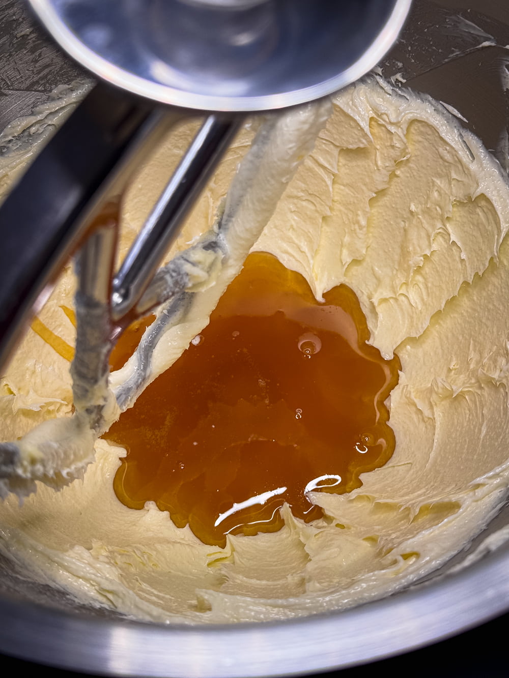 Następnie dodajemy po 1 jajku, za każdym razem miksujemy przez chwilę (na tym etapie masa może wyglądać na zwarzoną, to normalne przy dużej zawartości tłuszczu i miodu. Po dodaniu mąki wszystko się wyrówna).