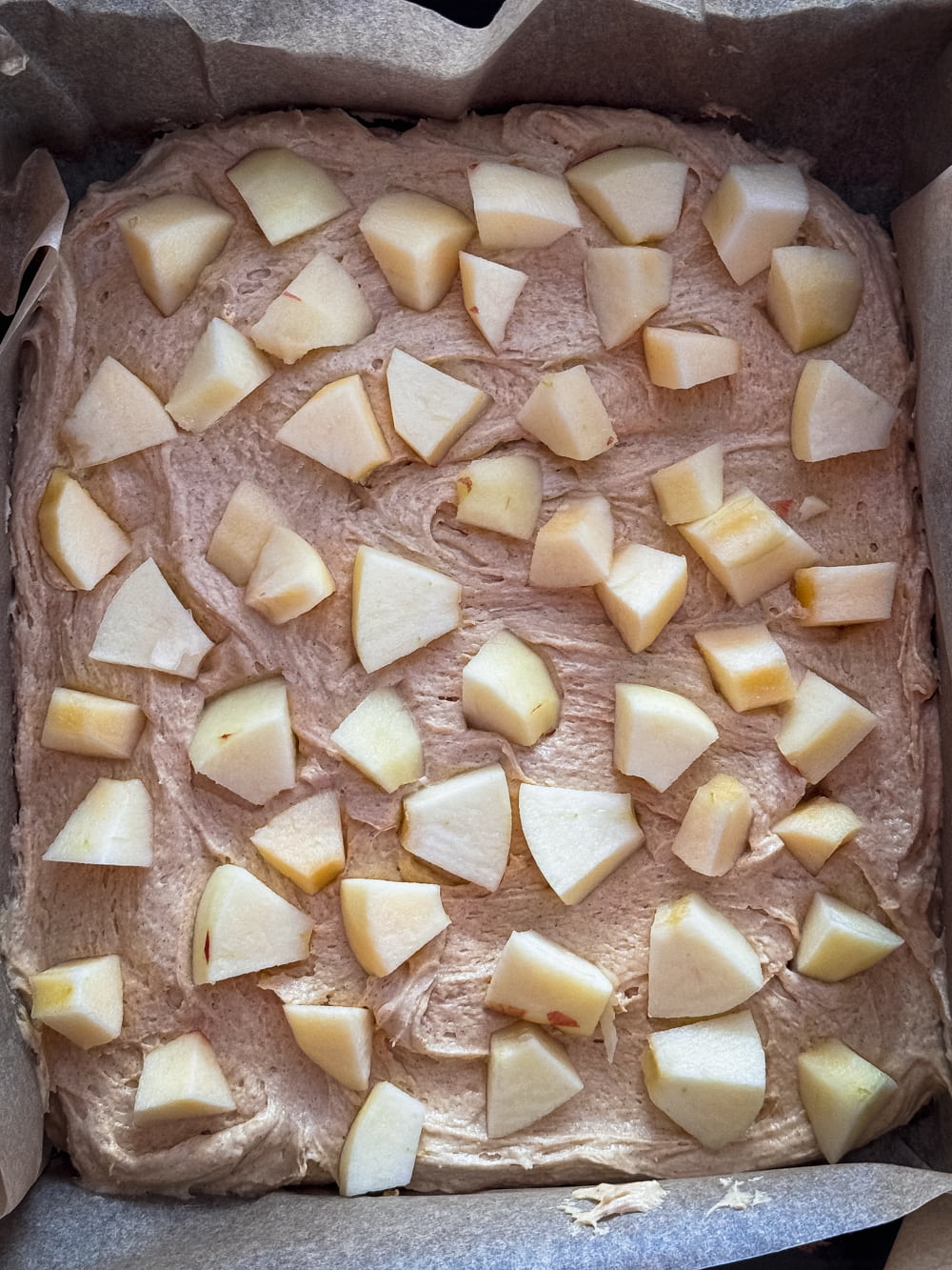 Ciasto przekładamy do wyłożonej papierem do pieczenia blaszki (21×28 cm). Na wierzchu układamy obrane i pokrojone w kostkę jabłko (można je delikatnie oprószyć mąką lub bułką tartą).