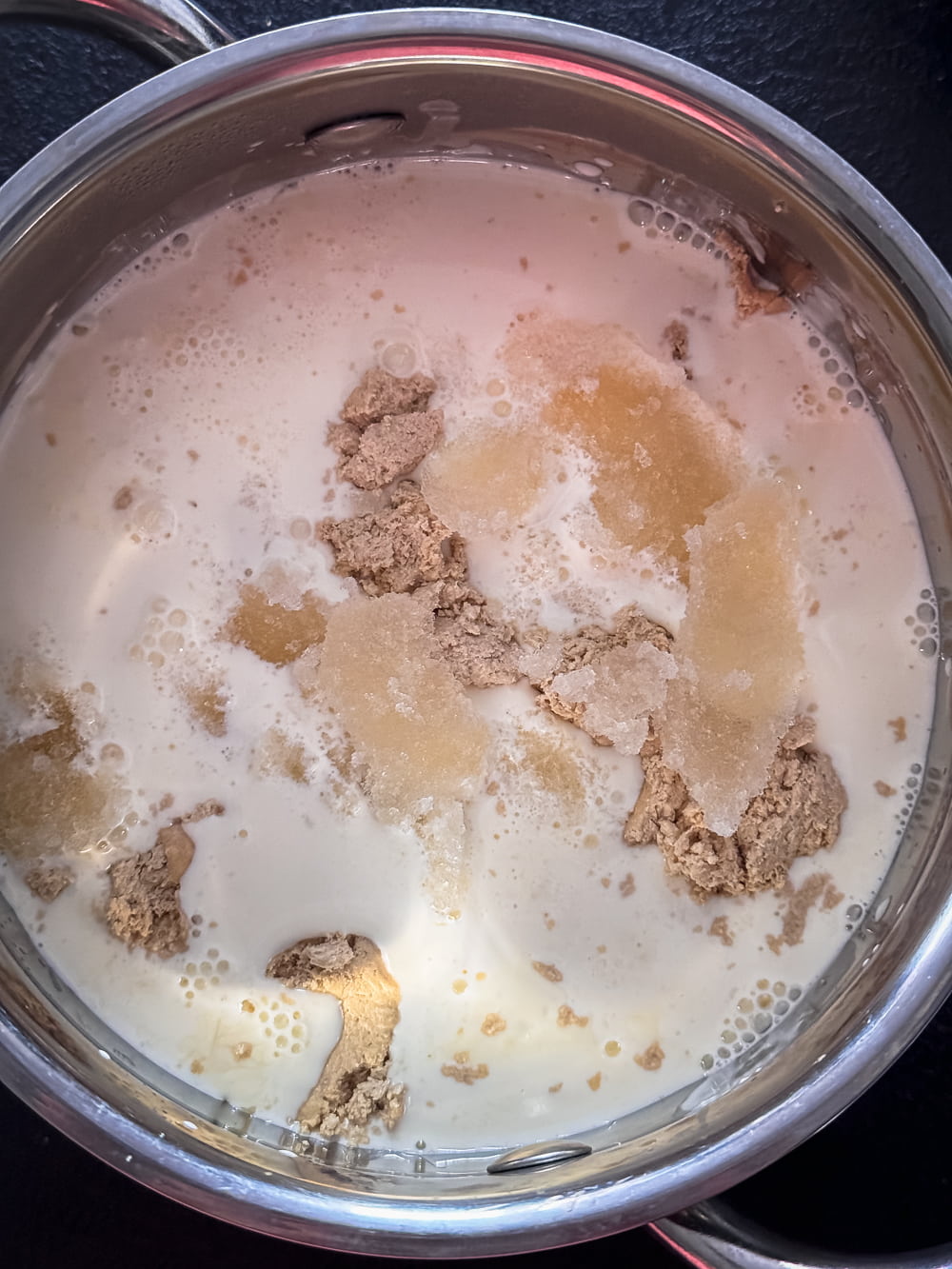 Do ciepłej śmietanki dodajemy połamaną na kostki czekoladę, pokruszoną chałwę oraz napęczniałą żelatynę.