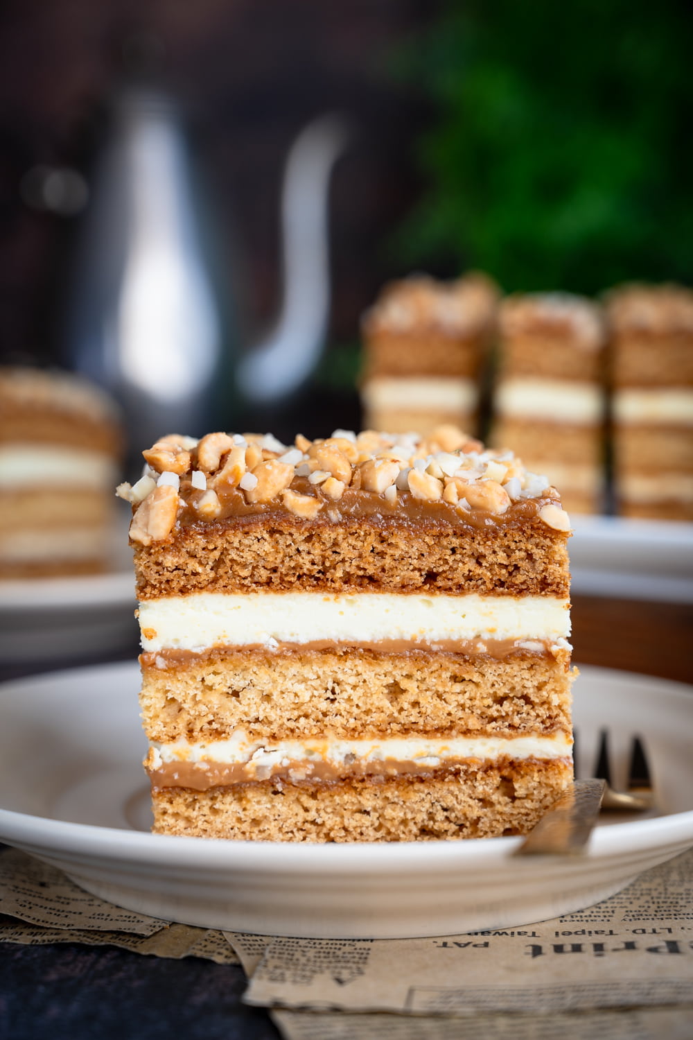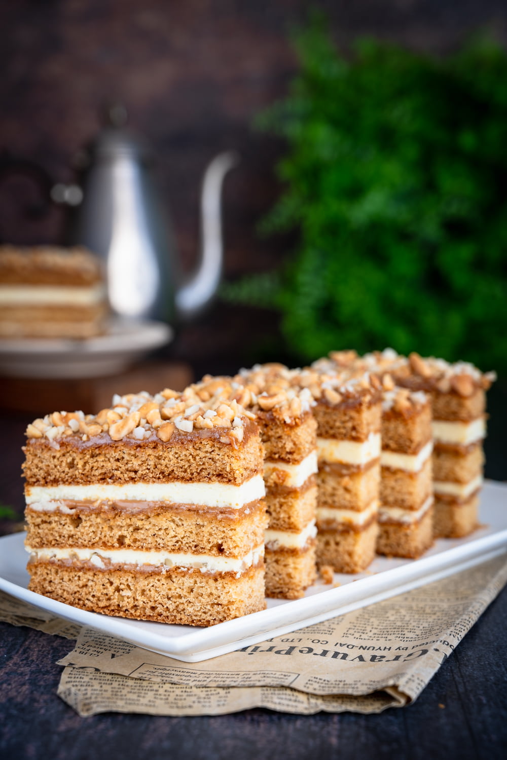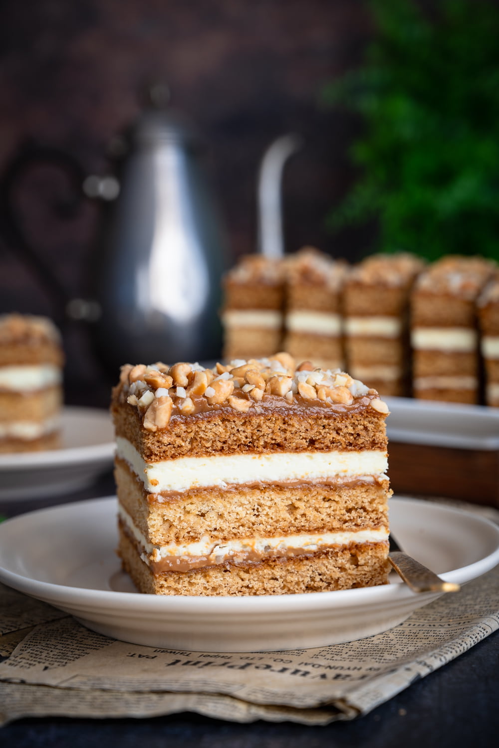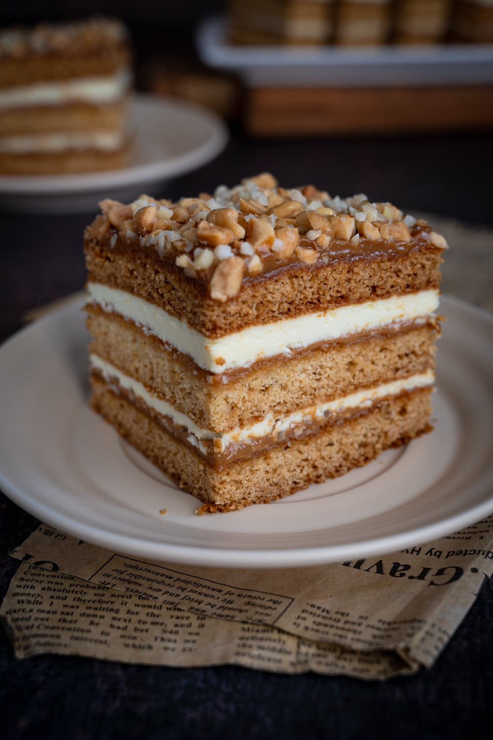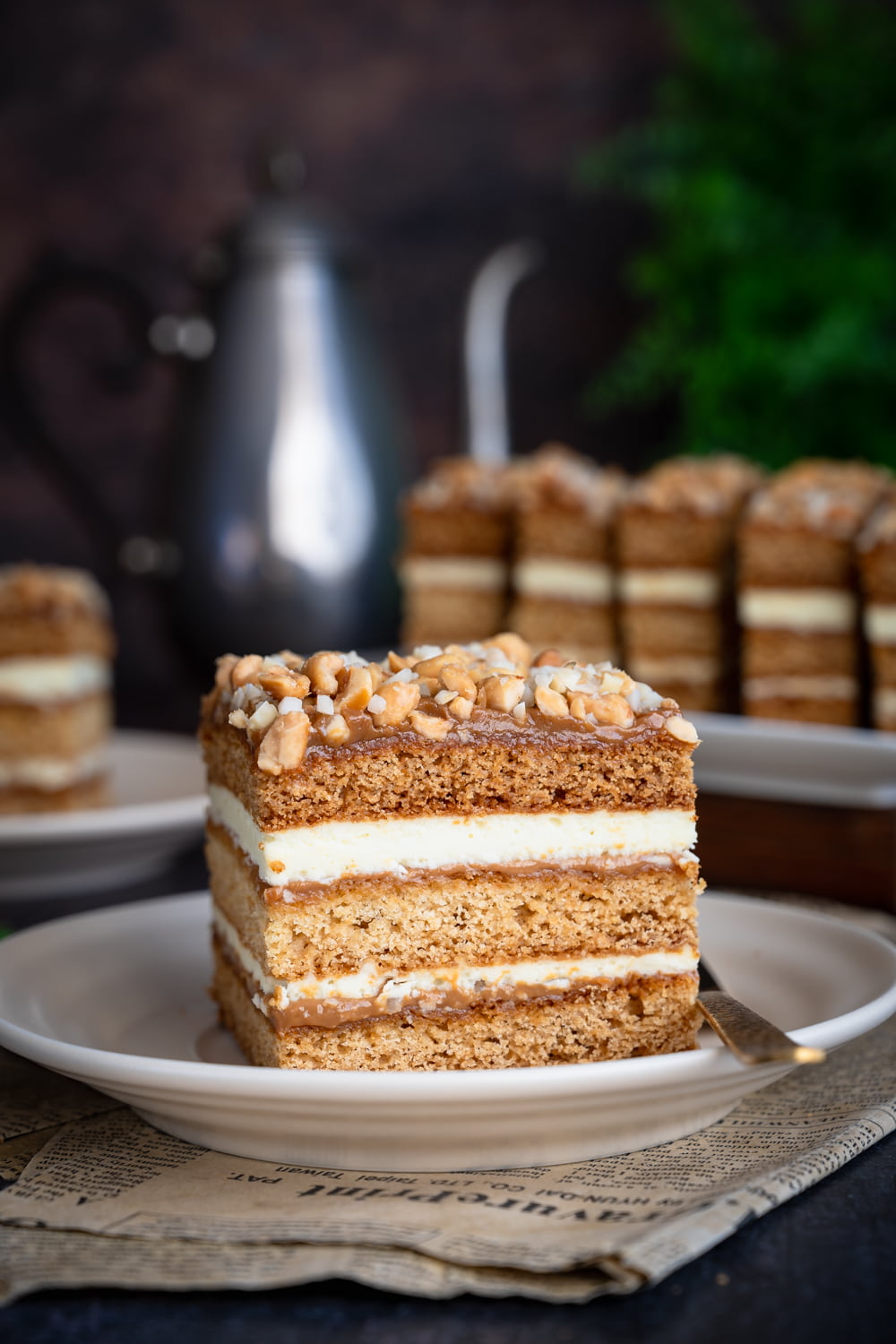 Jeden z blatów miodowych smarujemy 1/3 części kajmaku (lub tylko symboliczną ilością jeśli wolisz mniej słodkie wypieki). Rozprowadzamy połowę kremu mlecznego (krem początkowo może być dość lejący, zgęstnieje po czasie). Następnie dajemy drugi blat miodowy, który również smarujemy kajmakiem i pozostałym kremem mlecznym. Całość przykrywamy 3 blatem miodowym. Wierzch smarujemy pozostałym kajmakiem. Posypujemy posiekanymi orzeszkami ziemnymi (plus u mnie dodatkowo siekane migdały).