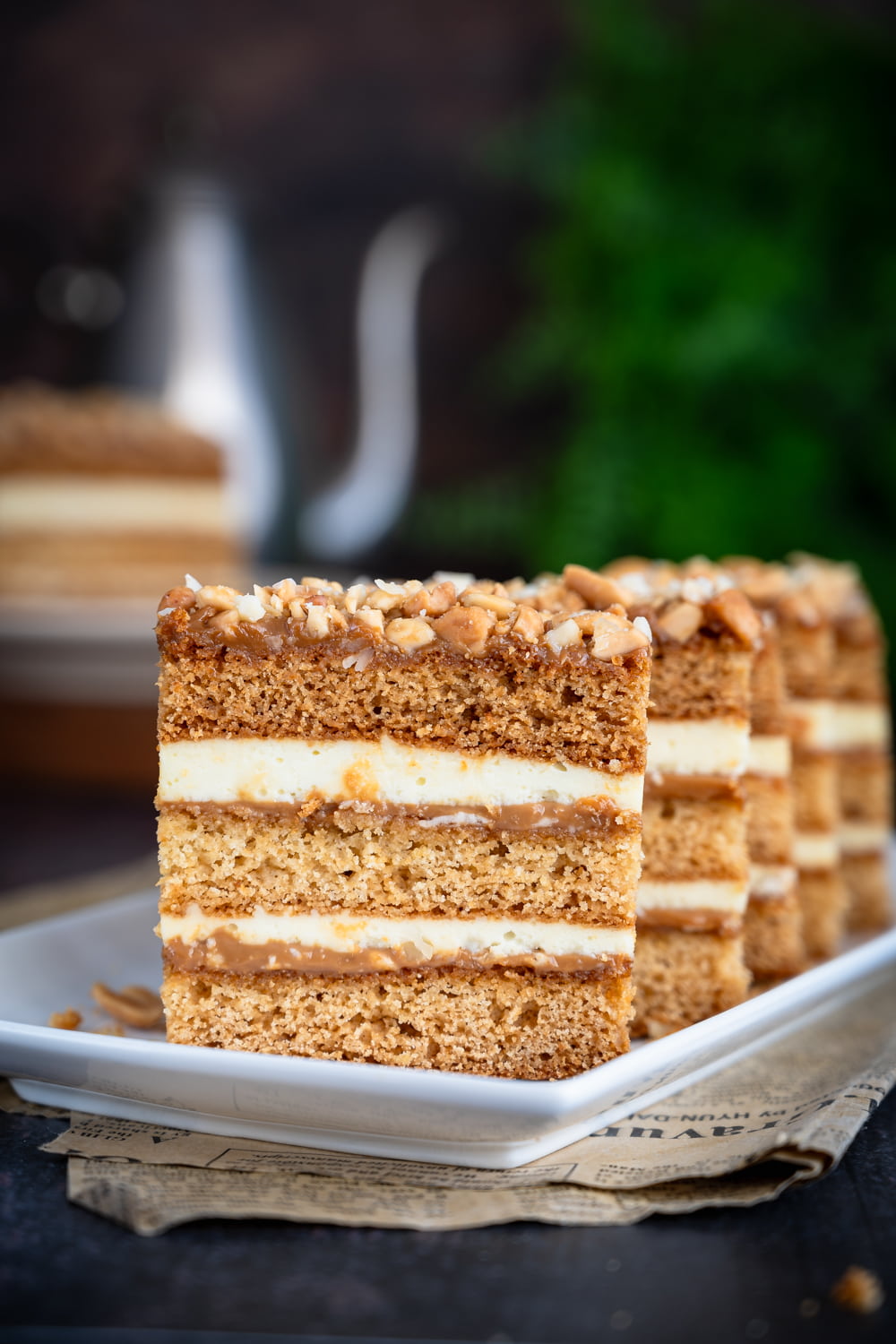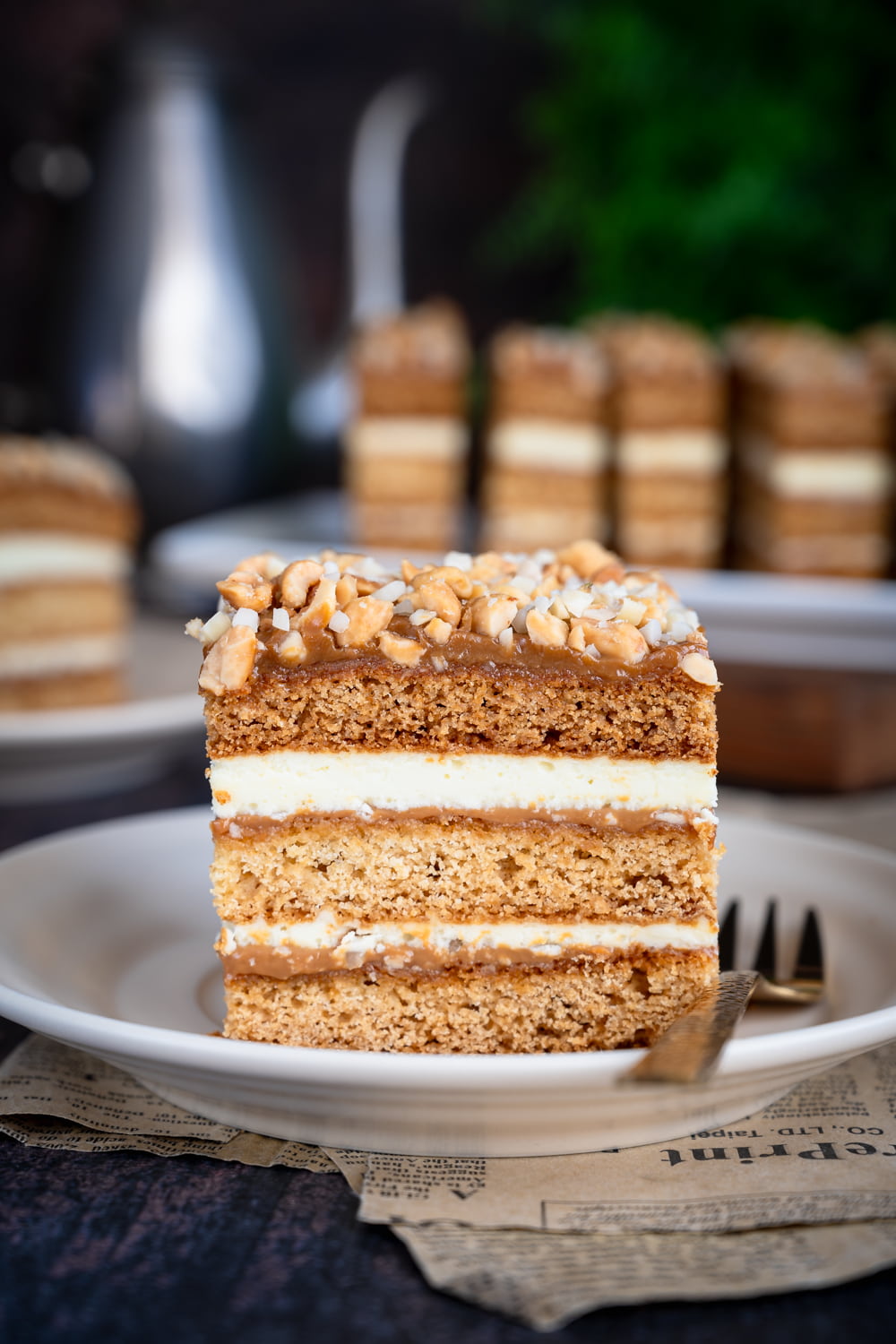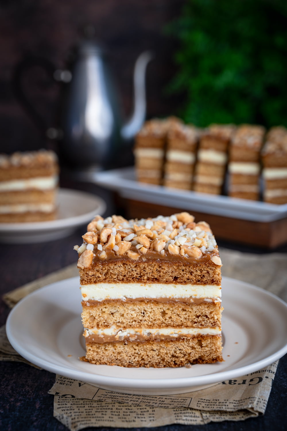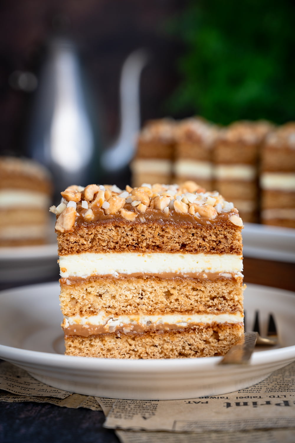 Jeden z blatów miodowych smarujemy 1/3 części kajmaku (lub tylko symboliczną ilością jeśli wolisz mniej słodkie wypieki). Rozprowadzamy połowę kremu mlecznego (krem początkowo może być dość lejący, zgęstnieje po czasie). Następnie dajemy drugi blat miodowy, który również smarujemy kajmakiem i pozostałym kremem mlecznym. Całość przykrywamy 3 blatem miodowym. Wierzch smarujemy pozostałym kajmakiem. Posypujemy posiekanymi orzeszkami ziemnymi (plus u mnie dodatkowo siekane migdały).