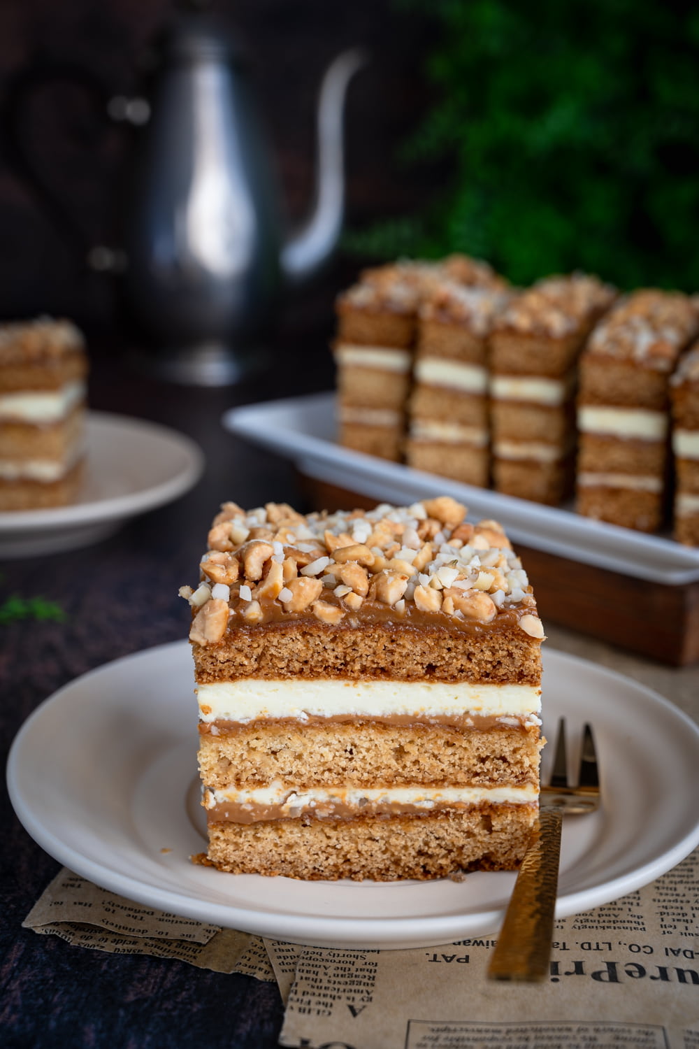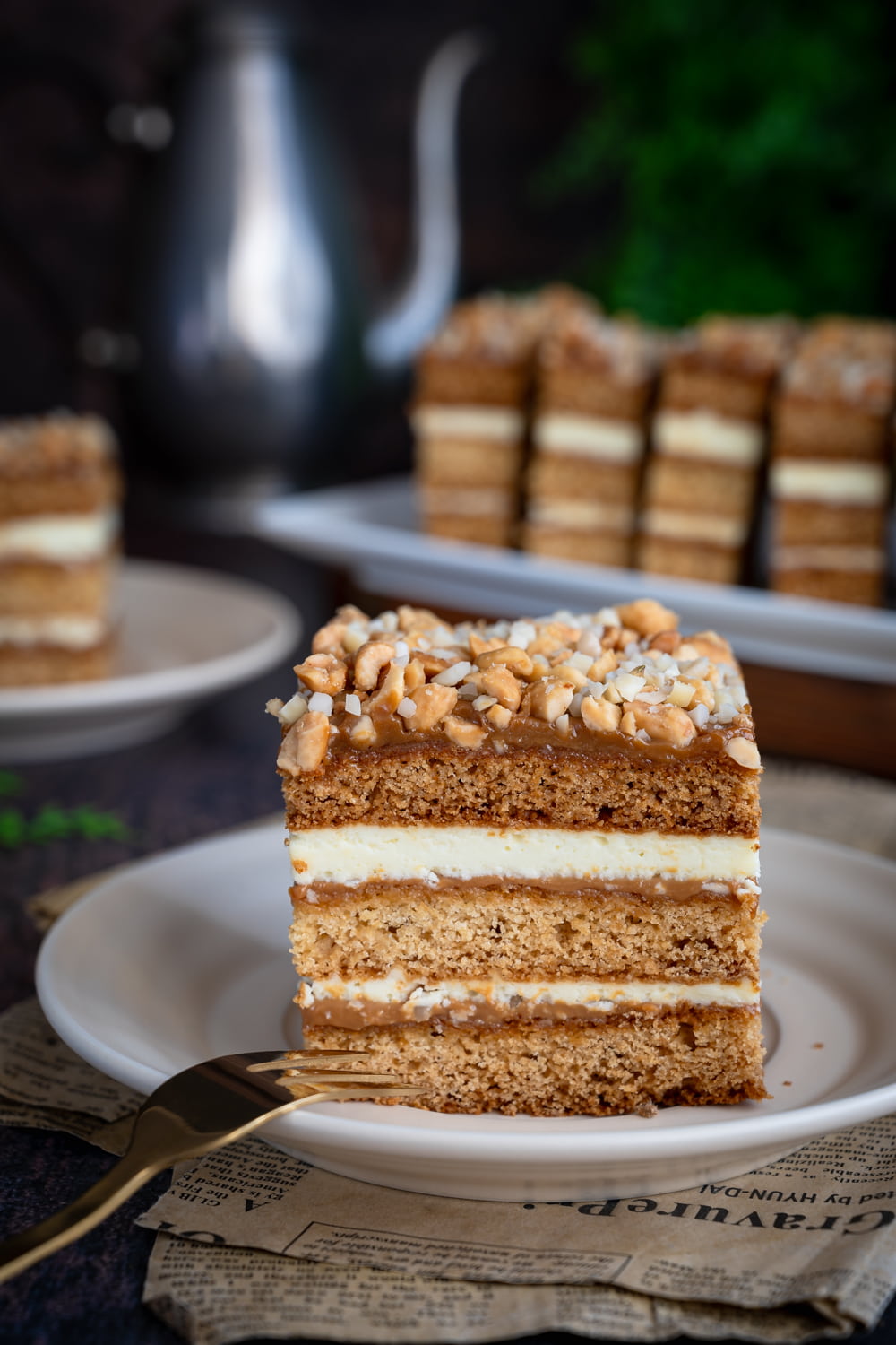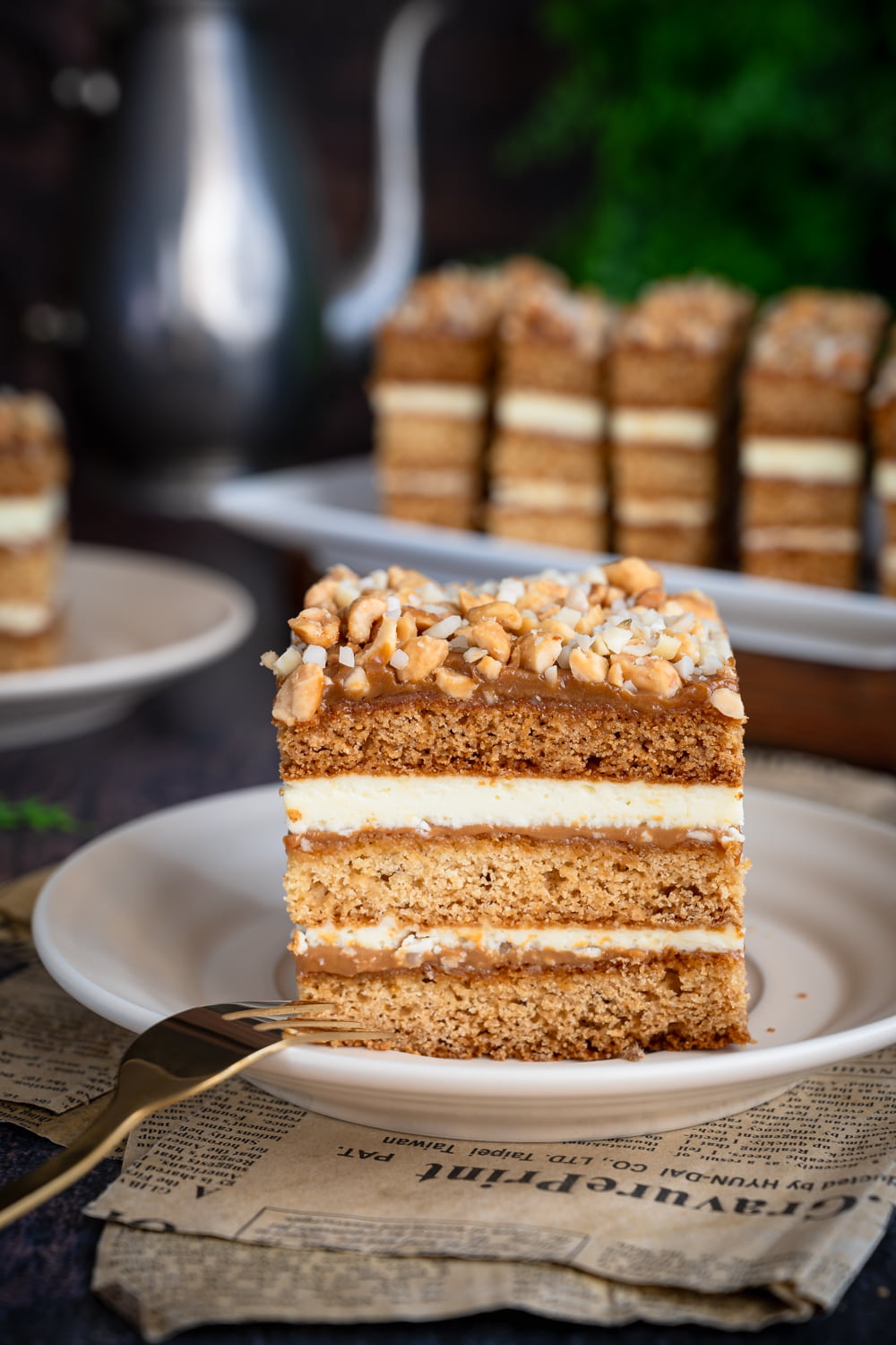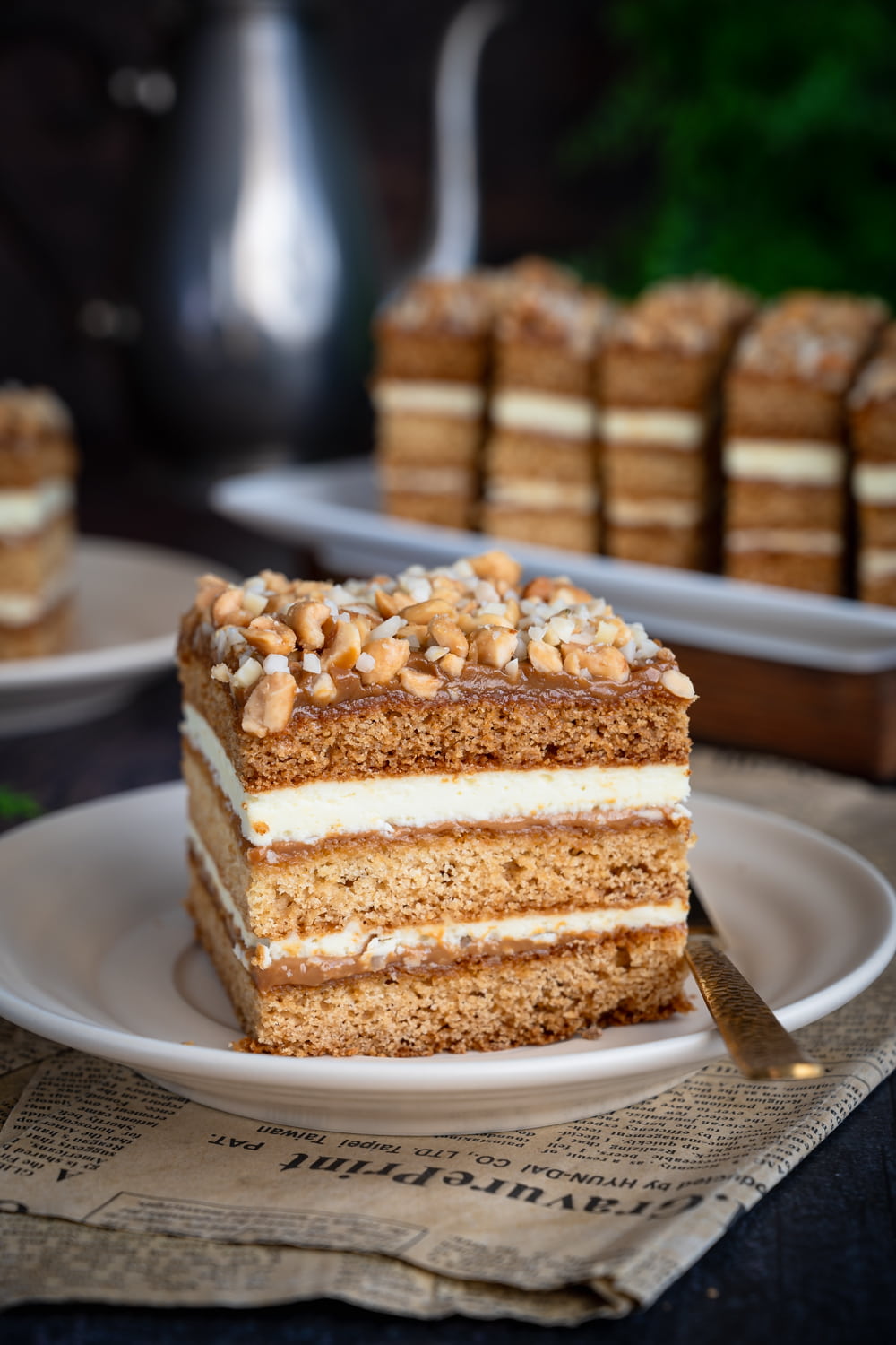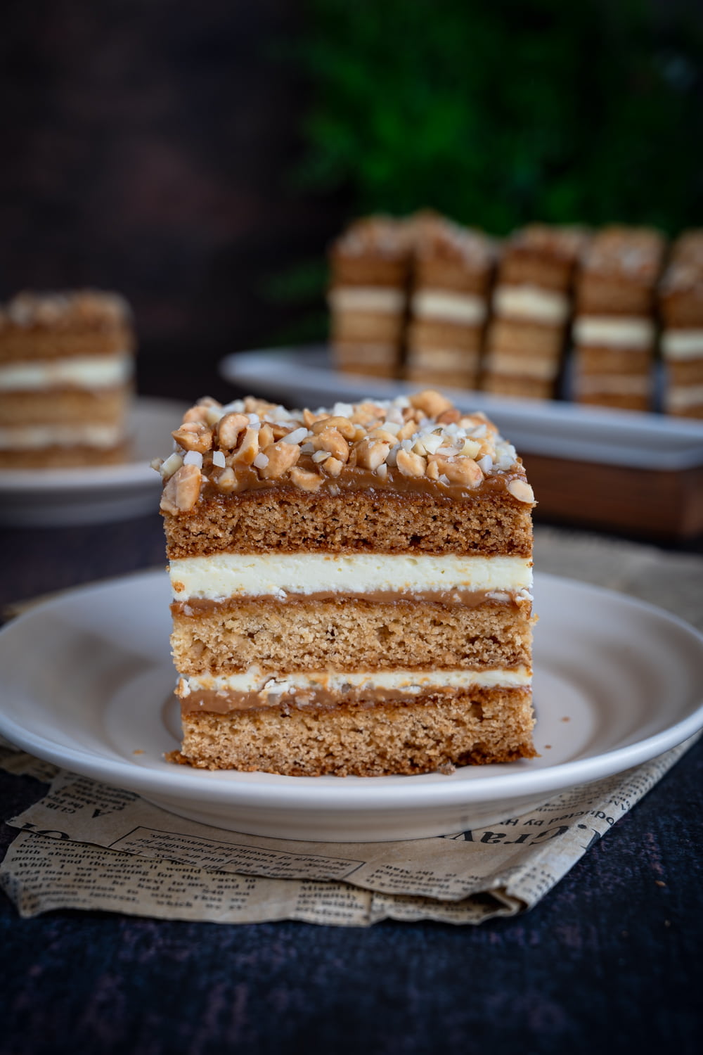 Jeden z blatów miodowych smarujemy 1/3 części kajmaku (lub tylko symboliczną ilością jeśli wolisz mniej słodkie wypieki). Rozprowadzamy połowę kremu mlecznego (krem początkowo może być dość lejący, zgęstnieje po czasie). Następnie dajemy drugi blat miodowy, który również smarujemy kajmakiem i pozostałym kremem mlecznym. Całość przykrywamy 3 blatem miodowym. Wierzch smarujemy pozostałym kajmakiem. Posypujemy posiekanymi orzeszkami ziemnymi (plus u mnie dodatkowo siekane migdały).