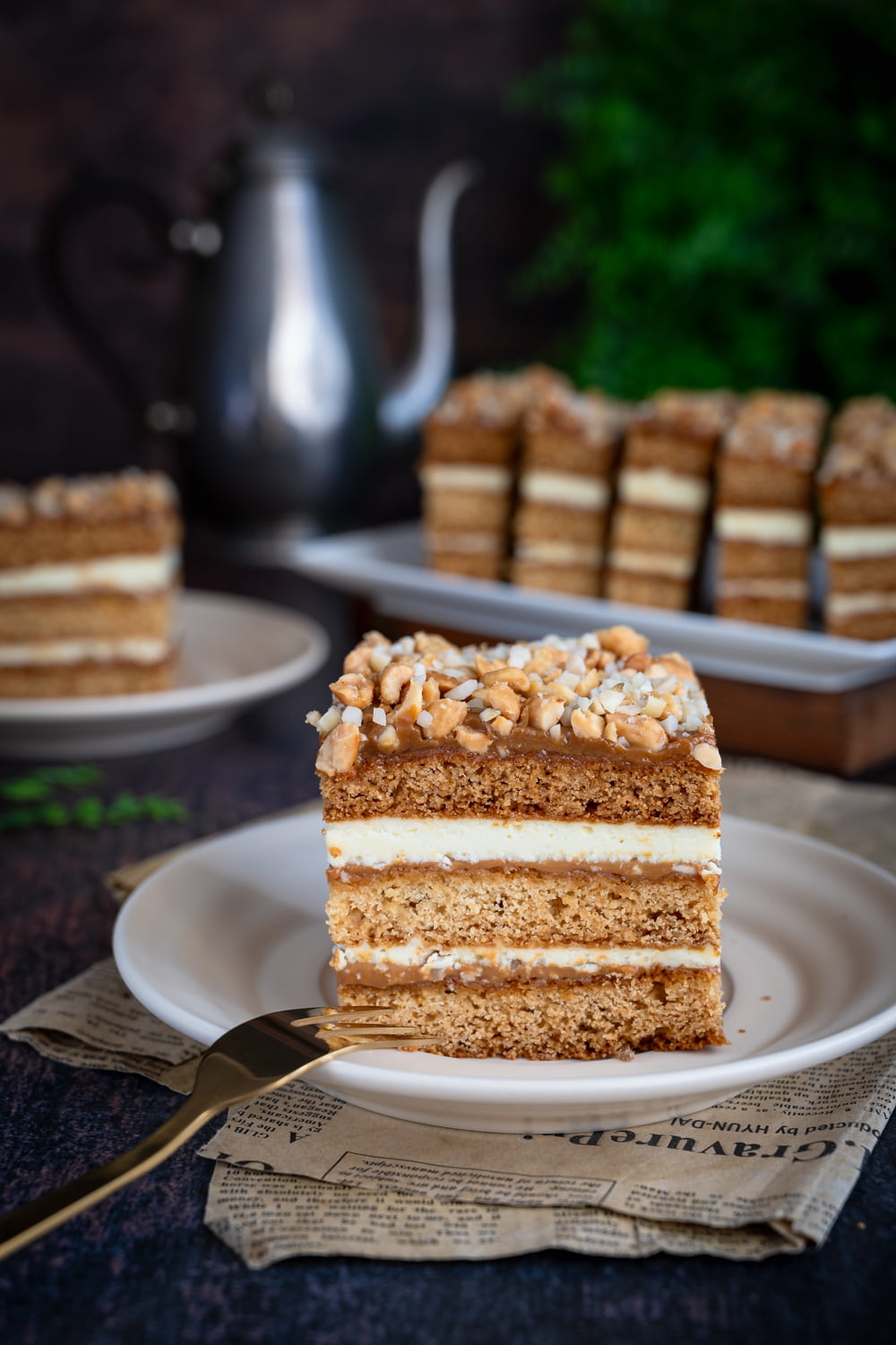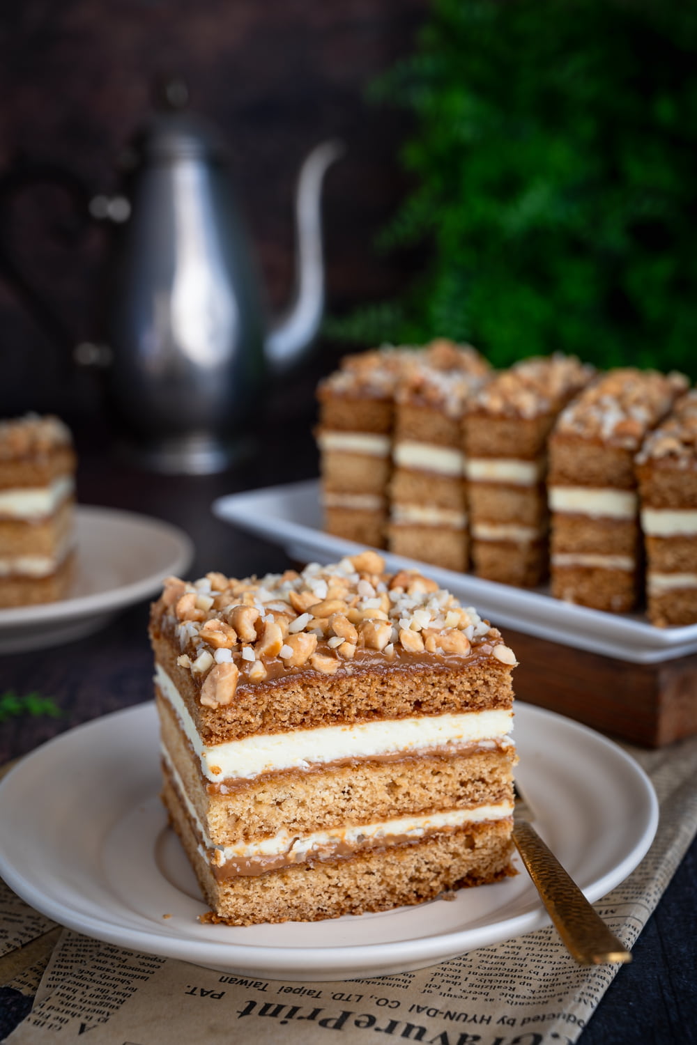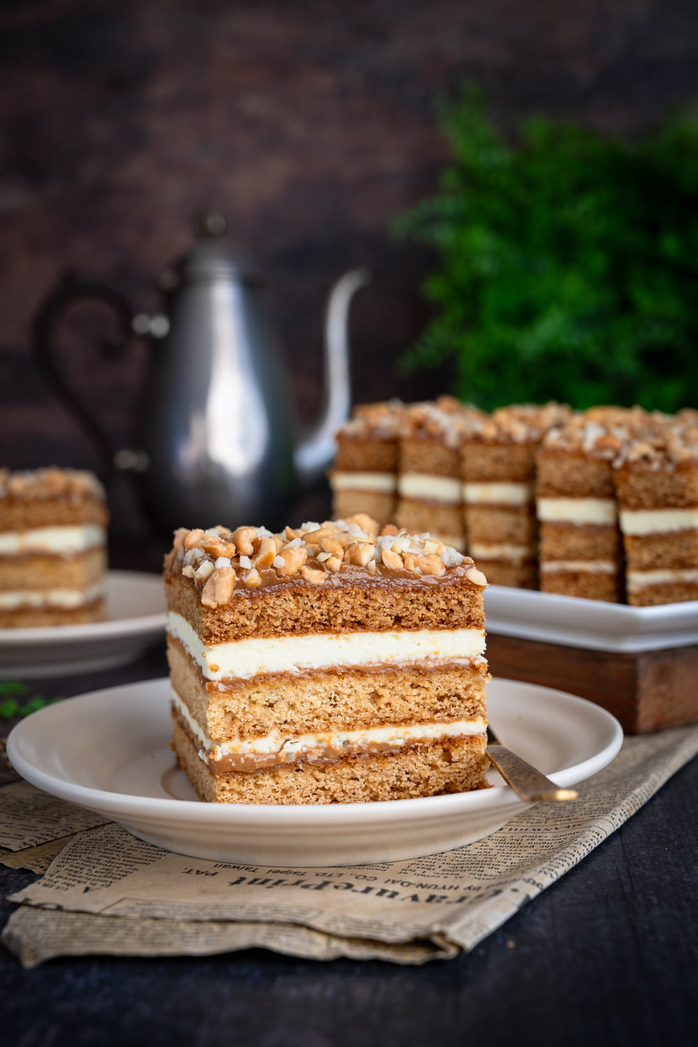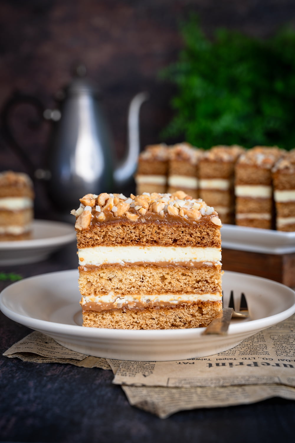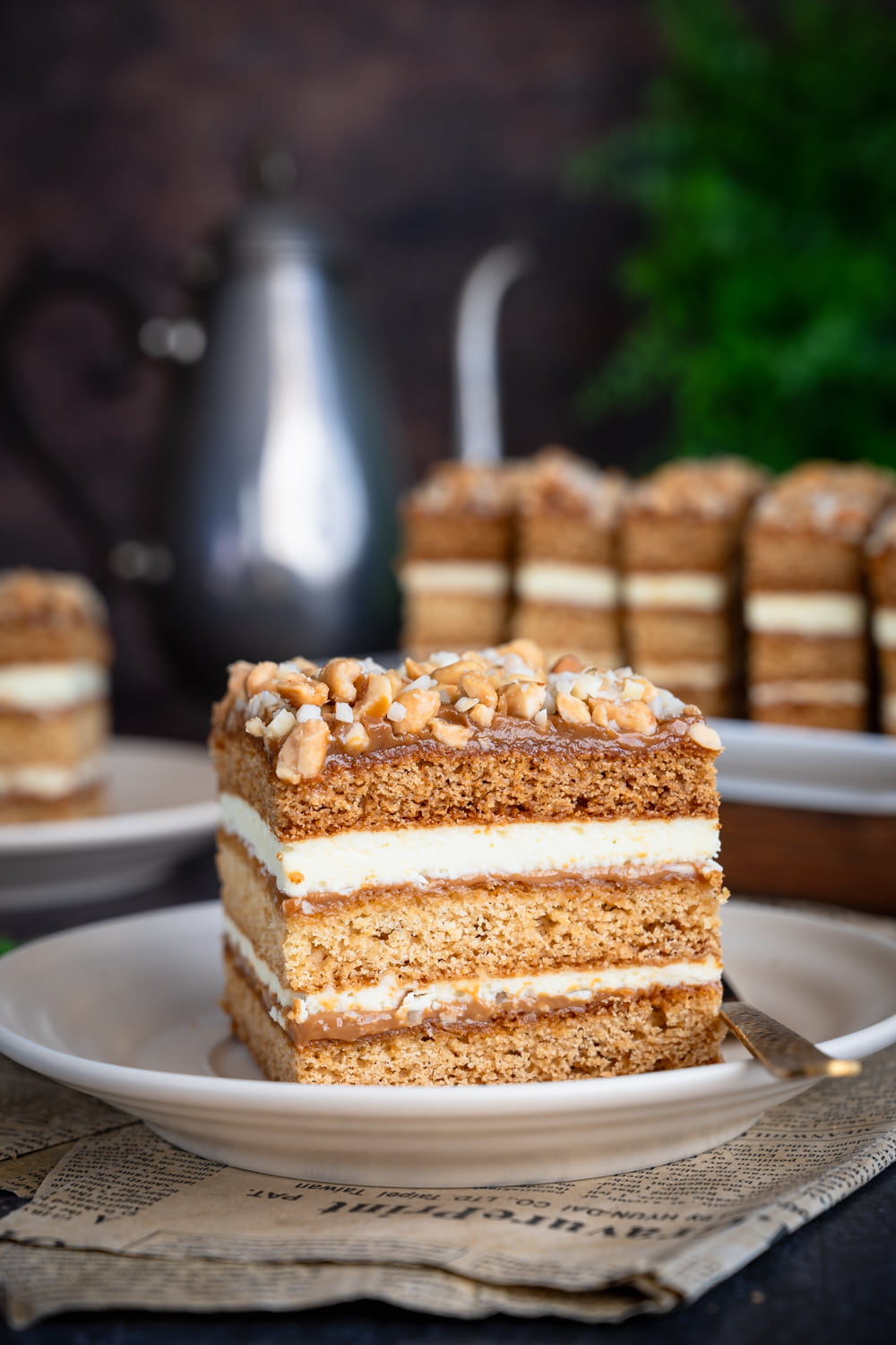 No właśnie, ten miodownik to ciasto dla prawdziwych łasuchów. Użyłam całej puszki kajmaku (400 g), a zazwyczaj tego nie robię. I już po pierwszym kęsie przypomniałam sobie, dlaczego 😅 Jeśli lubisz mocno słodkie wypieki, będziesz zachwycon*. Ale jeśli wolisz delikatniejsze smaki, możesz spokojnie zredukować ilość kajmaku. Myślę, że wystarczy symboliczna warstwa na każdym blacie, żeby zachować ten słodki akcent, ale nie przesłodzić całości.
