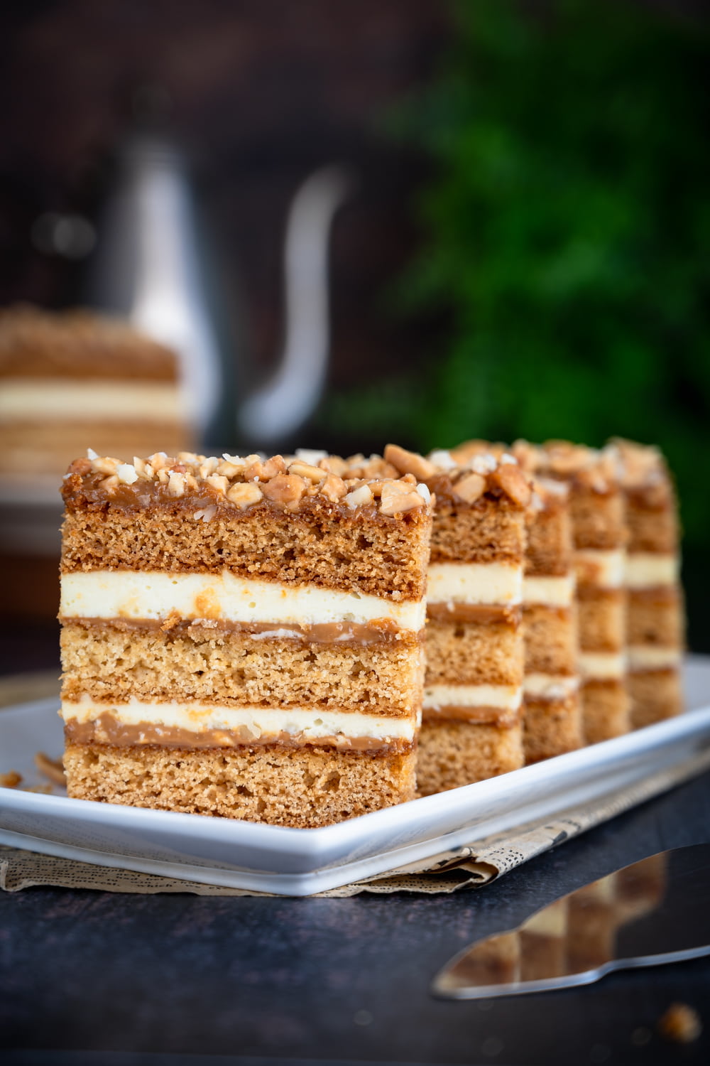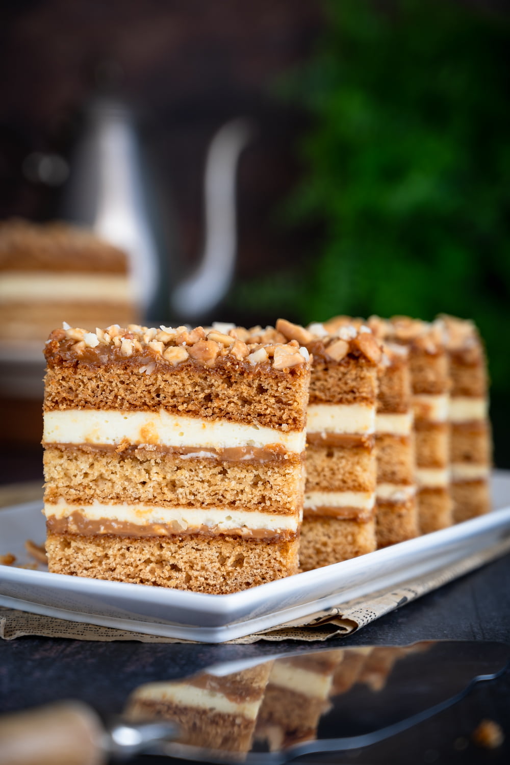 Uwagi: *Jako, że krem mleczy początkowo jest dosyć rzadki, możesz wcześniej posmarować kajmakiem blaty miodowe, dzięki czemu podczas składania ciasta krem nie wypłynie bokiem. Możesz też wstawić krem mleczny na chwilę do lodówki, by nieco zgęstniał.