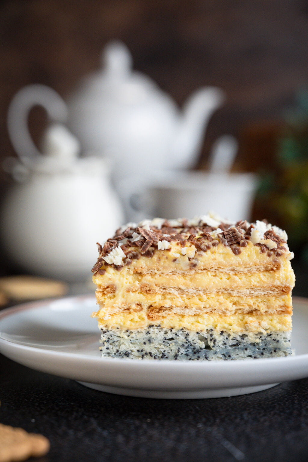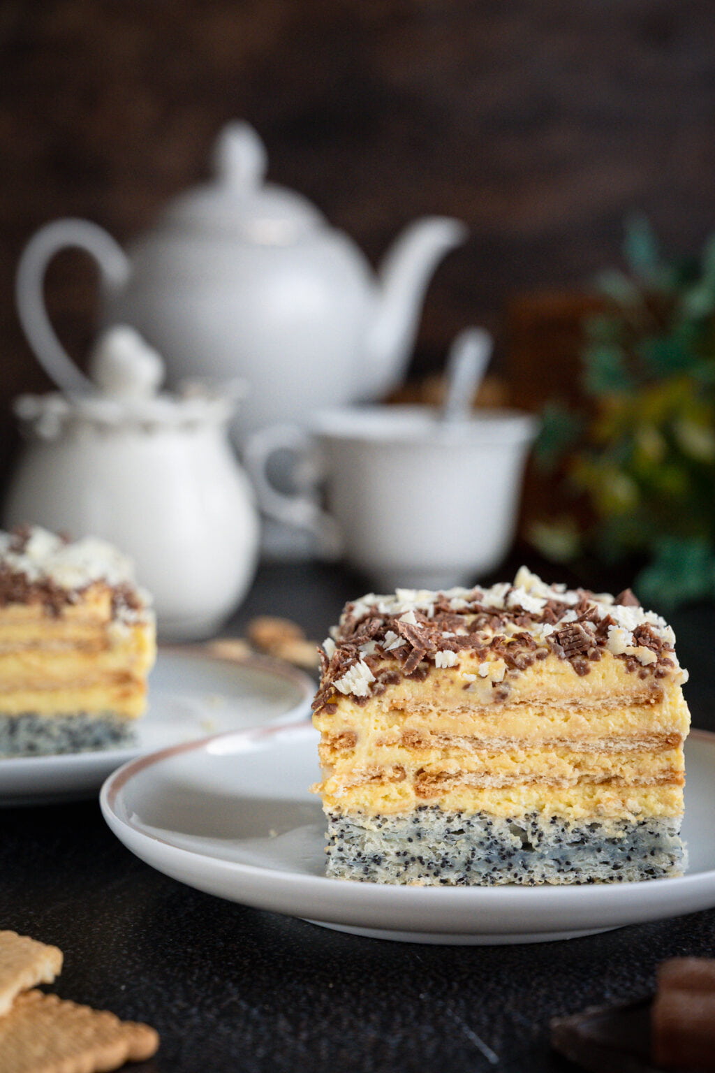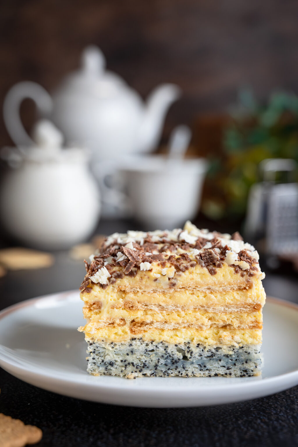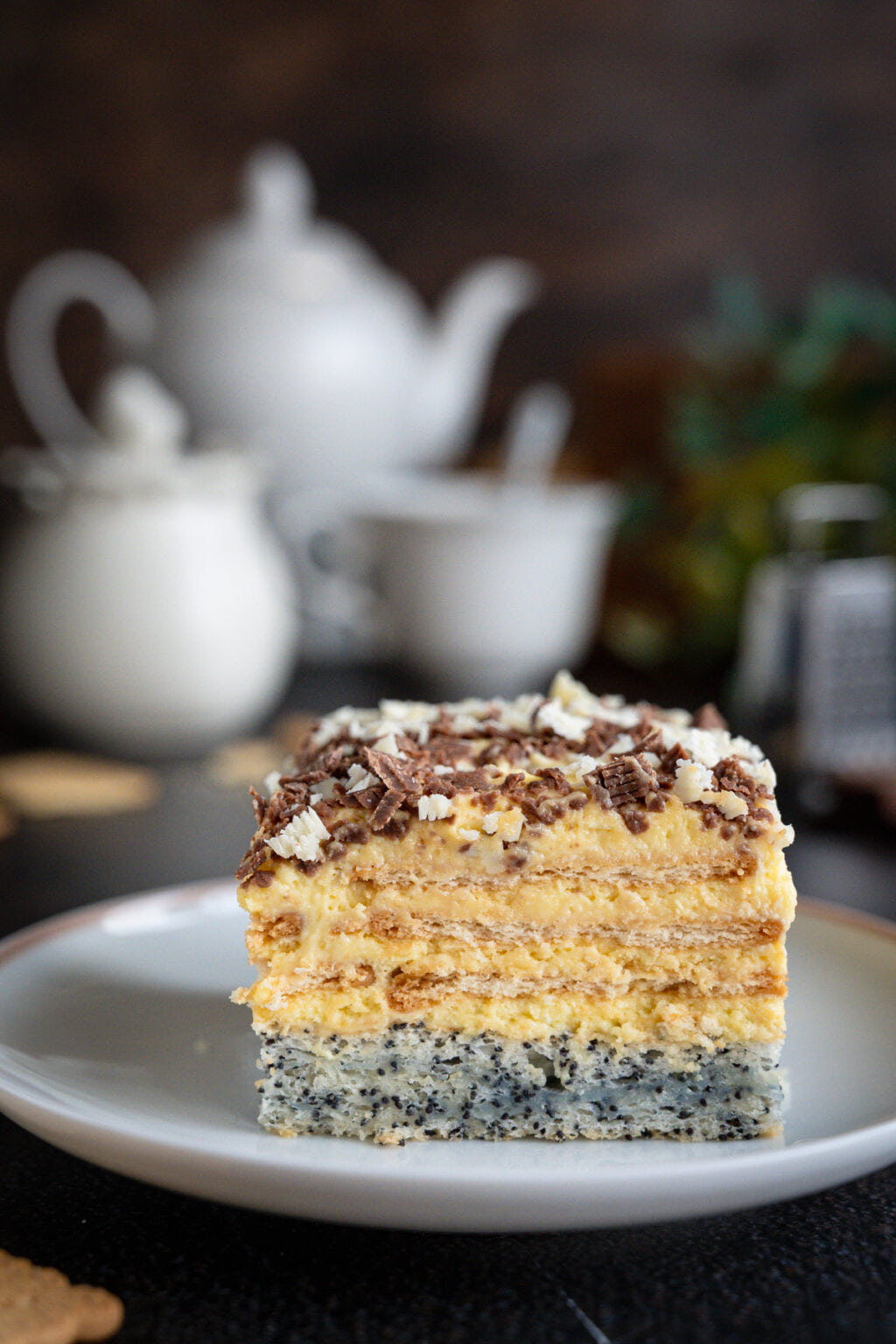 Muszę jednak uczciwie przyznać, to ciasto jest dla osób, które mają w pieczeniu już lekkie obycie, lubią chwilę pomieszać, poczekać czy dopilnować odpowiedniej temperatury. Zarówno ciasto z makiem, jak i krem wymagają odrobiny doświadczenia i lekkiego wyczucia, ale za to odpłacają się spektakularnym efektem. Każda warstwa ma tutaj znaczenie: sprężysty makowy blat, aksamitny krem, maślane herbatniki i odrobina czekolady na wierzchu. Całość wychodzi stabilna, gładka i przepyszna. Najlepsza po całonocnym schłodzeniu, gdy krem osiąga właściwą konsystencję.