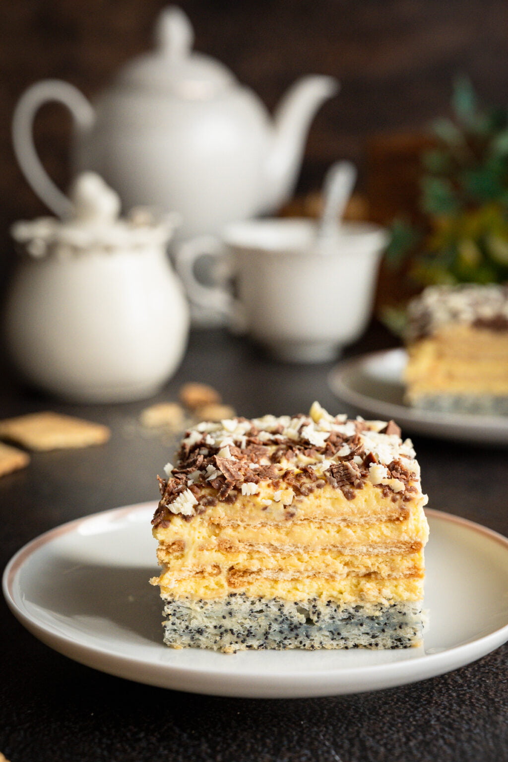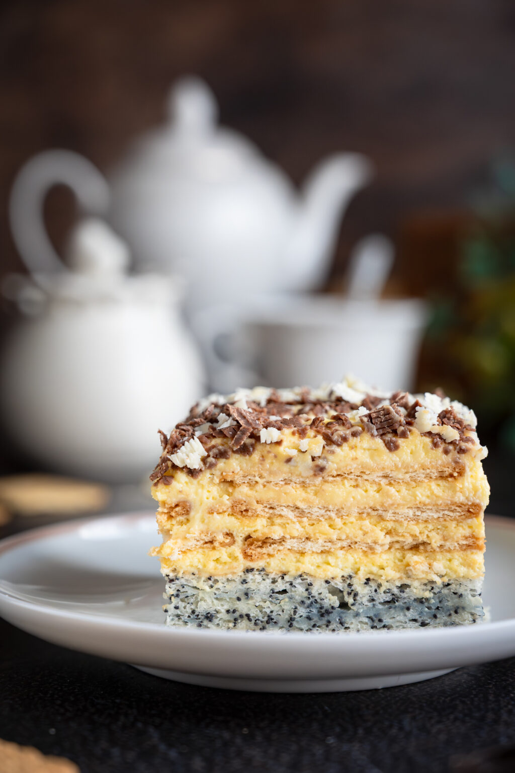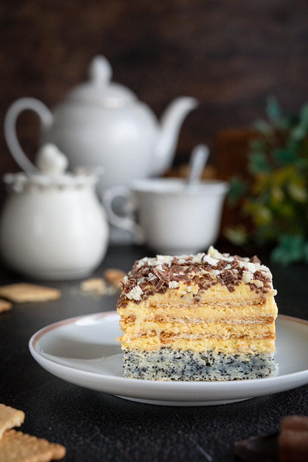 Muszę jednak uczciwie przyznać, to ciasto jest dla osób, które mają w pieczeniu już lekkie obycie, lubią chwilę pomieszać, poczekać czy dopilnować odpowiedniej temperatury. Zarówno ciasto z makiem, jak i krem wymagają odrobiny doświadczenia i lekkiego wyczucia, ale za to odpłacają się spektakularnym efektem. Każda warstwa ma tutaj znaczenie: sprężysty makowy blat, aksamitny krem, maślane herbatniki i odrobina czekolady na wierzchu. Całość wychodzi stabilna, gładka i przepyszna. Najlepsza po całonocnym schłodzeniu, gdy krem osiąga właściwą konsystencję.