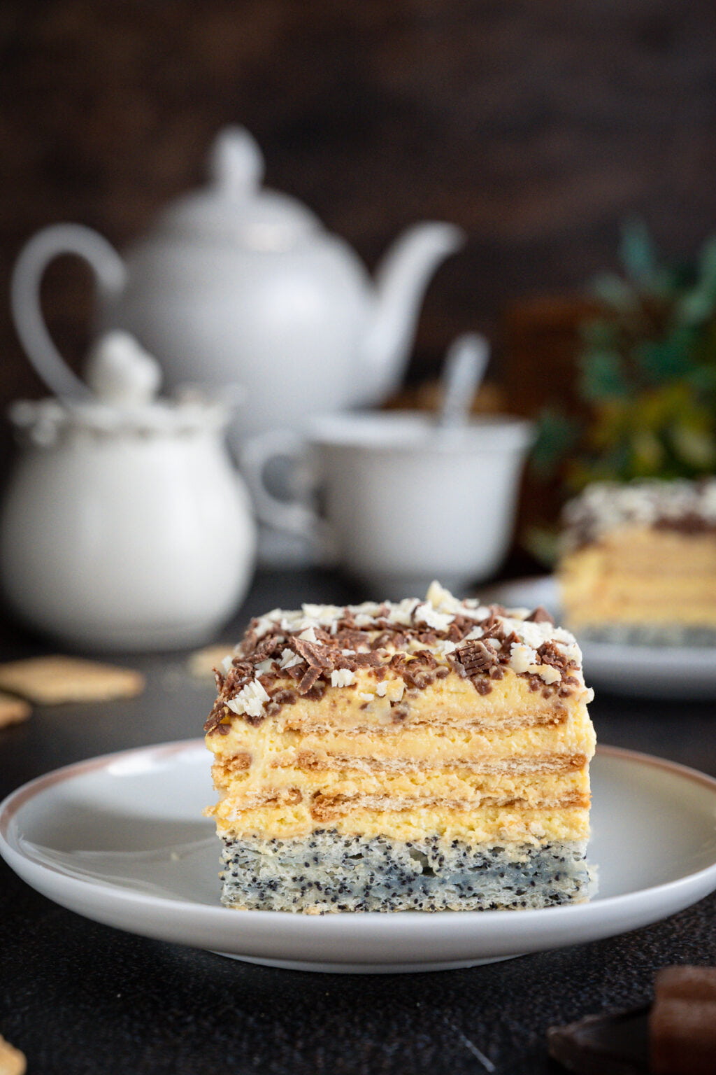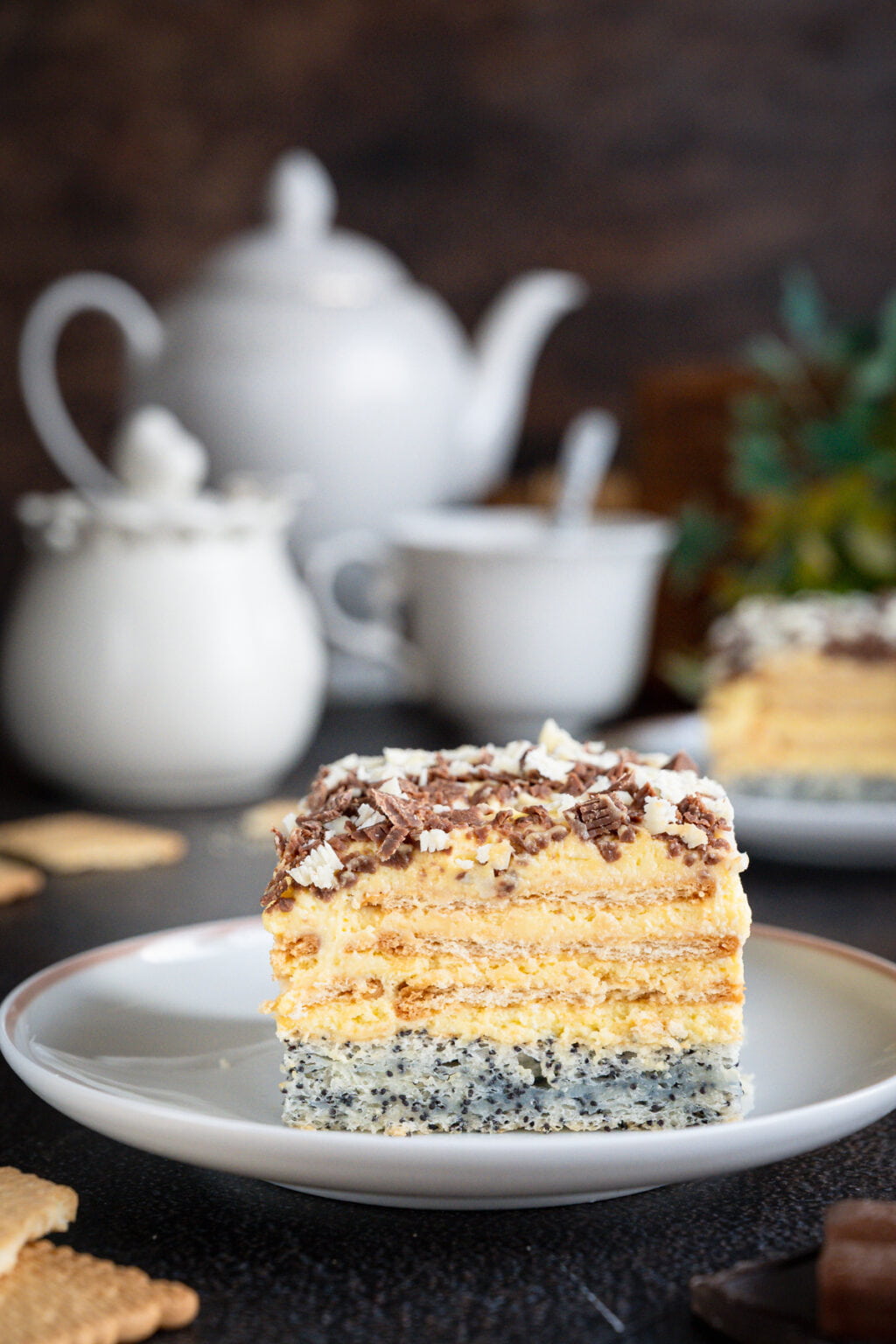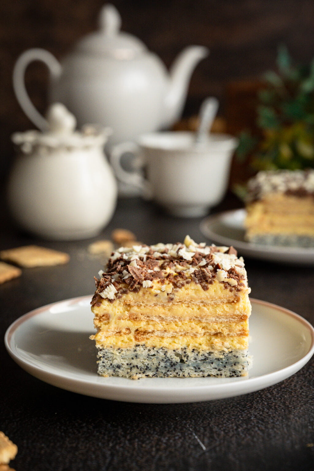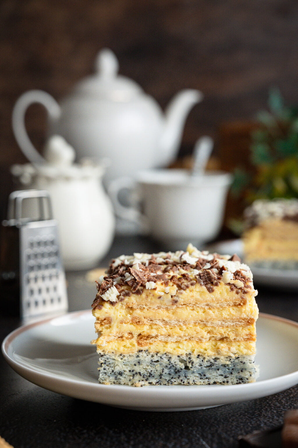 Muszę jednak uczciwie przyznać, to ciasto jest dla osób, które mają w pieczeniu już lekkie obycie, lubią chwilę pomieszać, poczekać czy dopilnować odpowiedniej temperatury. Zarówno ciasto z makiem, jak i krem wymagają odrobiny doświadczenia i lekkiego wyczucia, ale za to odpłacają się spektakularnym efektem. Każda warstwa ma tutaj znaczenie: sprężysty makowy blat, aksamitny krem, maślane herbatniki i odrobina czekolady na wierzchu. Całość wychodzi stabilna, gładka i przepyszna. Najlepsza po całonocnym schłodzeniu, gdy krem osiąga właściwą konsystencję.