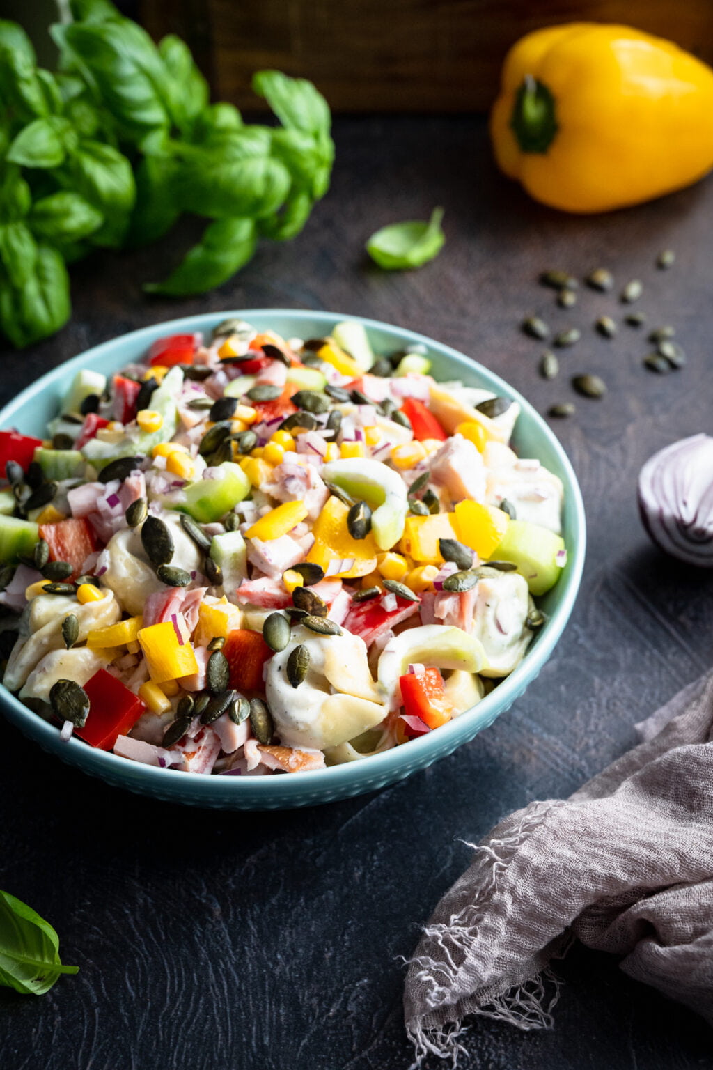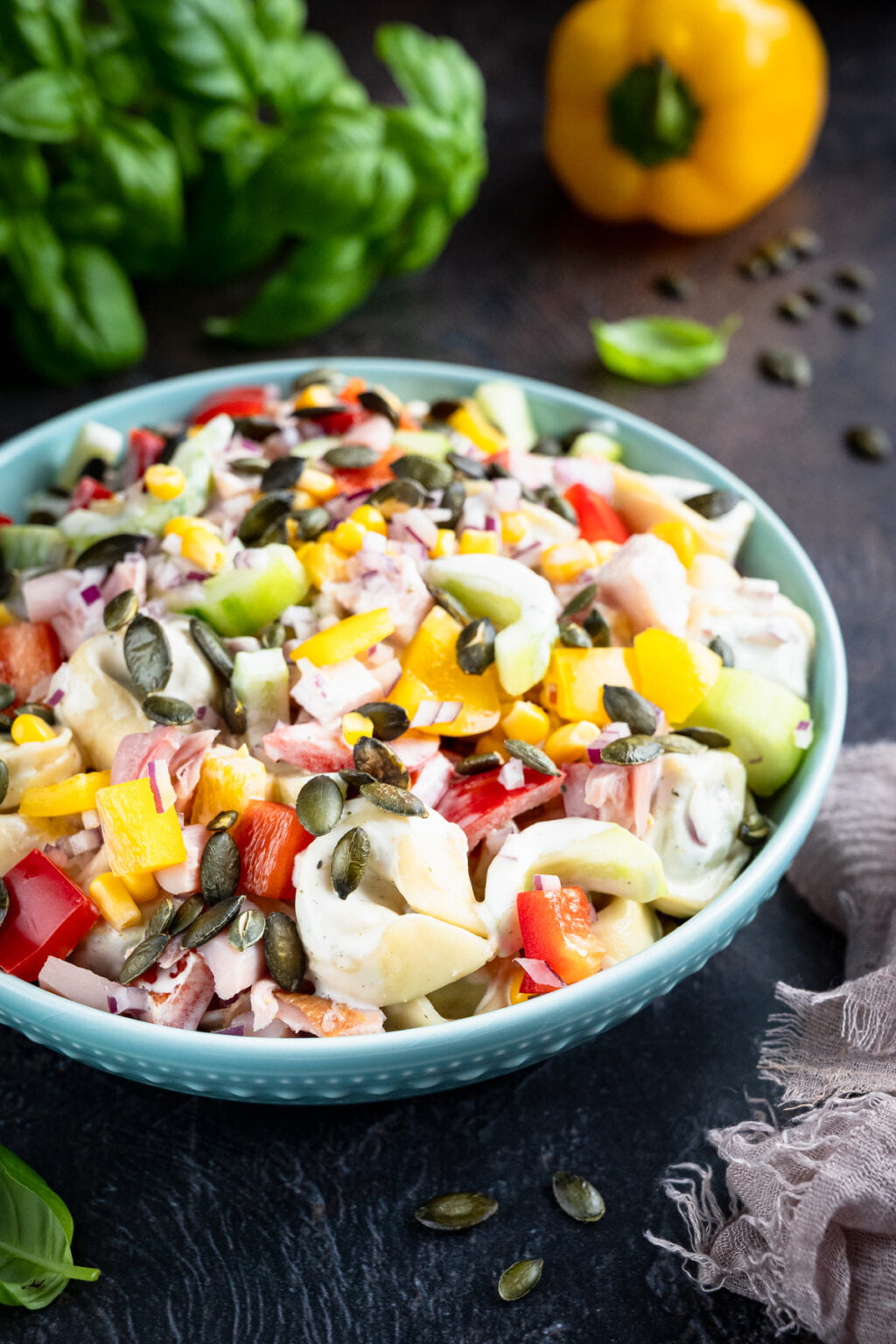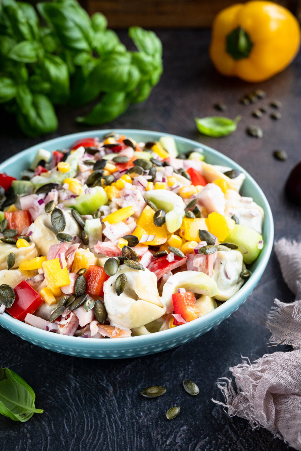 W misce umieszczamy: tortellini, kurczaka, paprykę, cebulę, ogórka oraz kukurydzę. Dodajemy sos i delikatnie mieszamy (jeśli sosu wydaje Ci się za dużo, możesz nie dodawać go całego). Wierzch posypujemy pestkami dyni lub słonecznika.