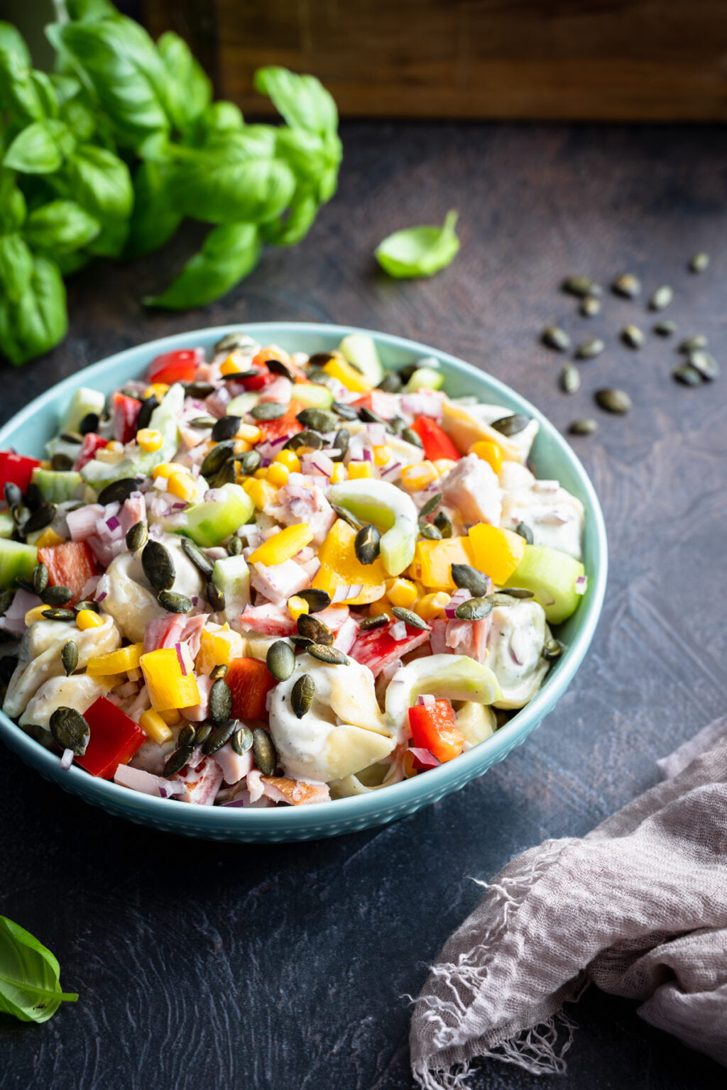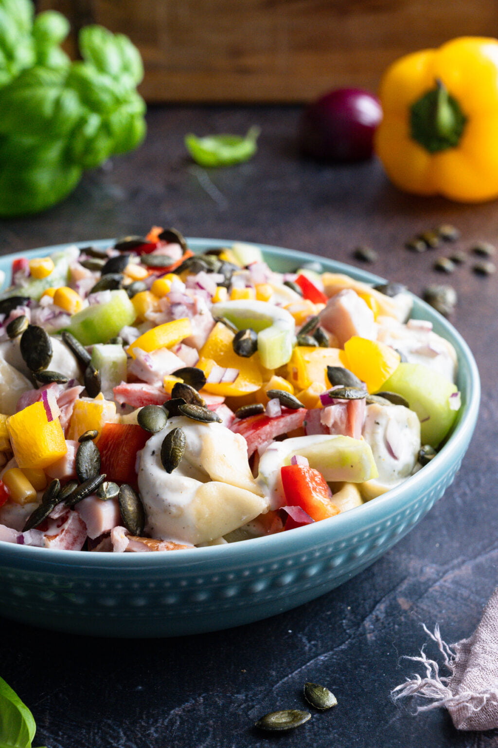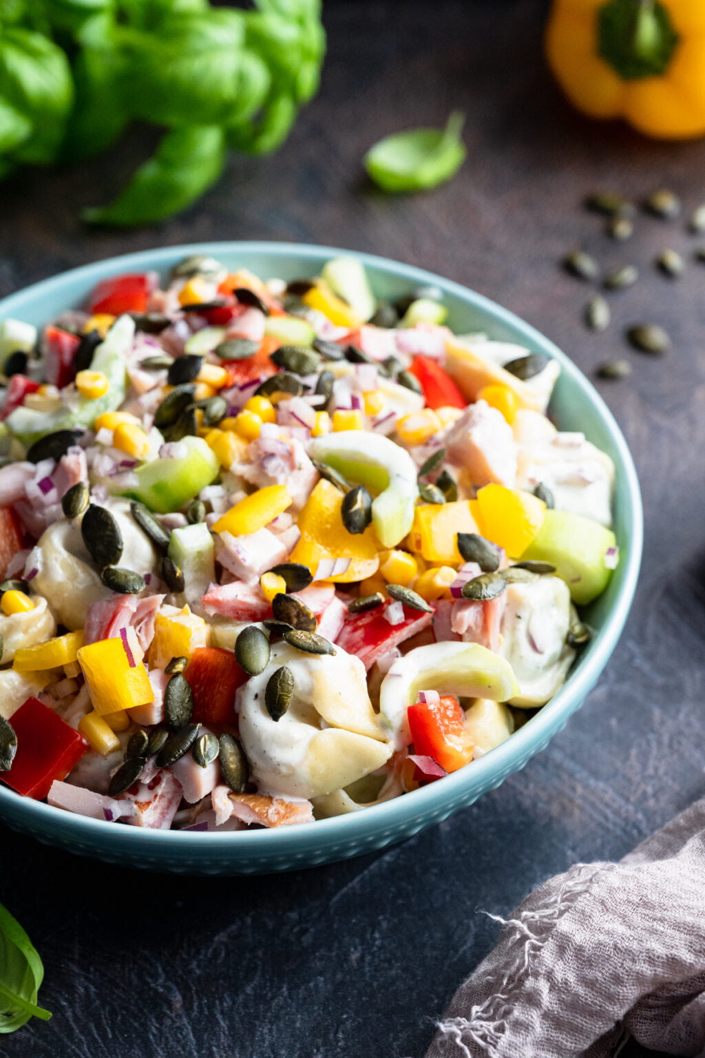 W misce umieszczamy: tortellini, kurczaka, paprykę, cebulę, ogórka oraz kukurydzę. Dodajemy sos i delikatnie mieszamy (jeśli sosu wydaje Ci się za dużo, możesz nie dodawać go całego). Wierzch posypujemy pestkami dyni lub słonecznika.
