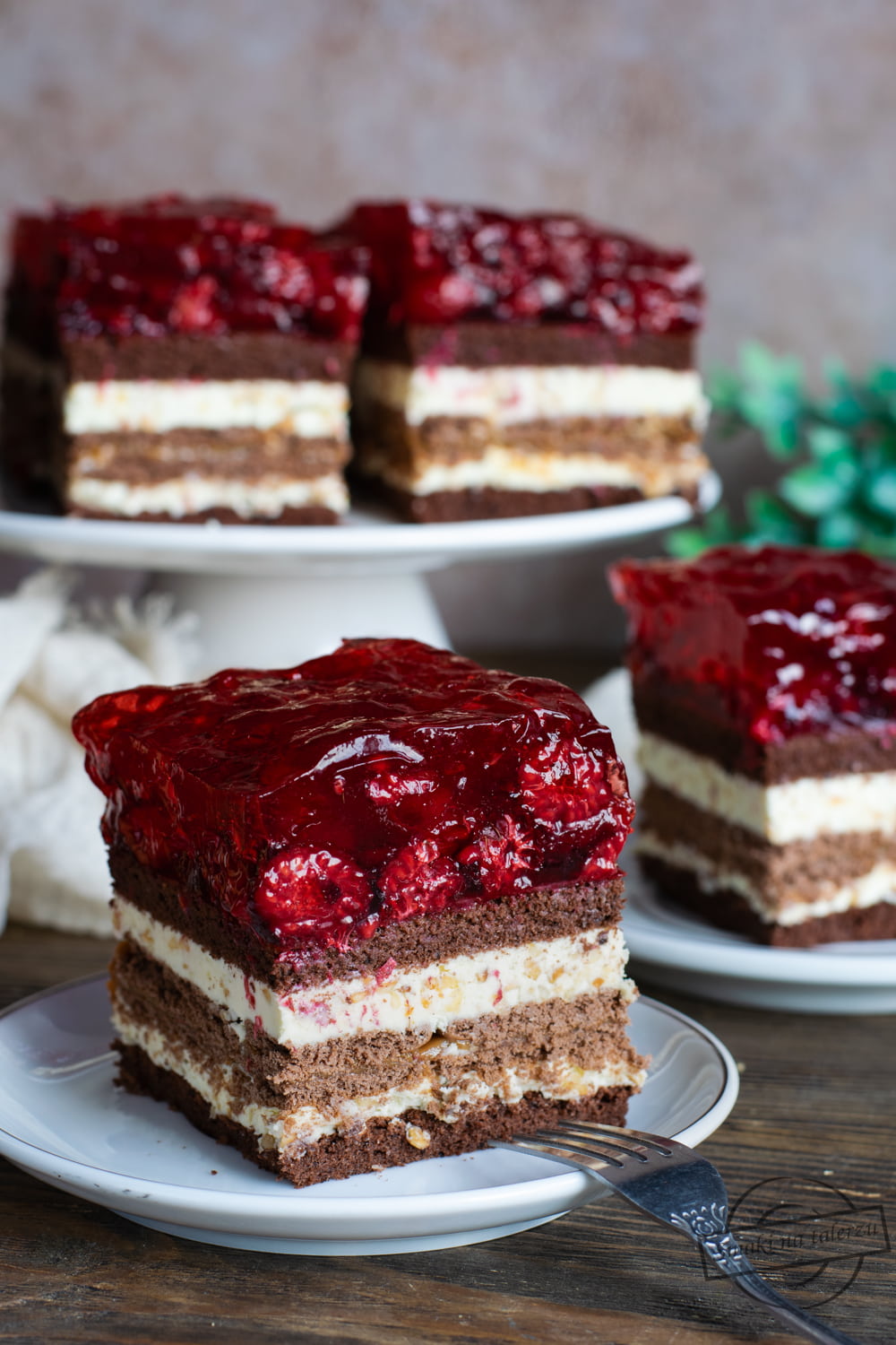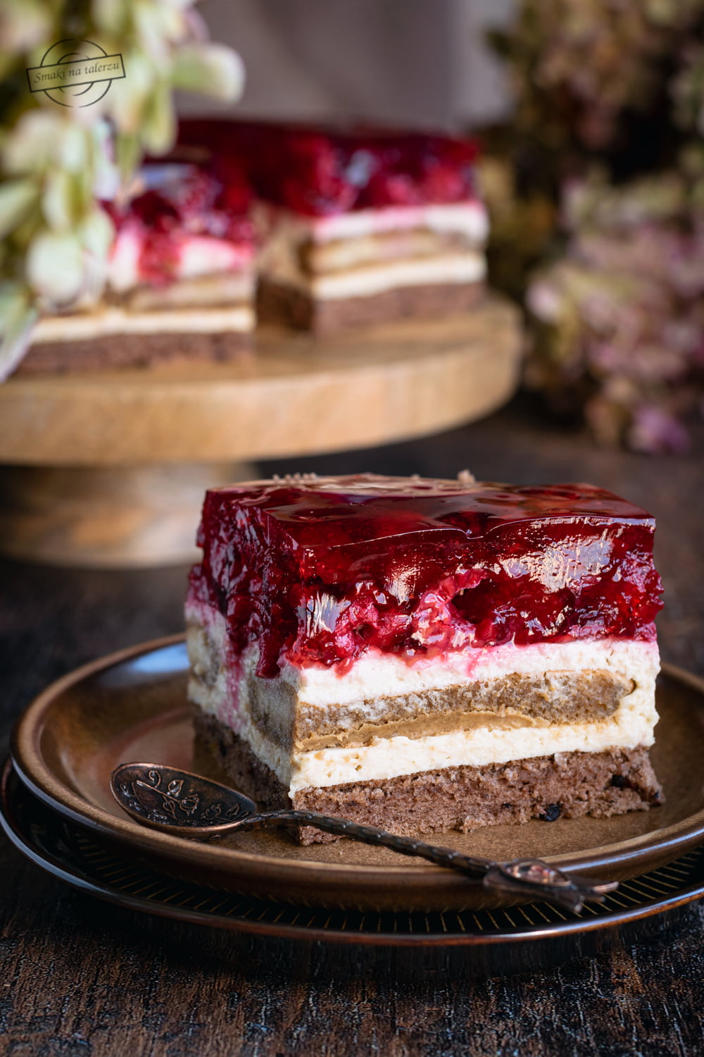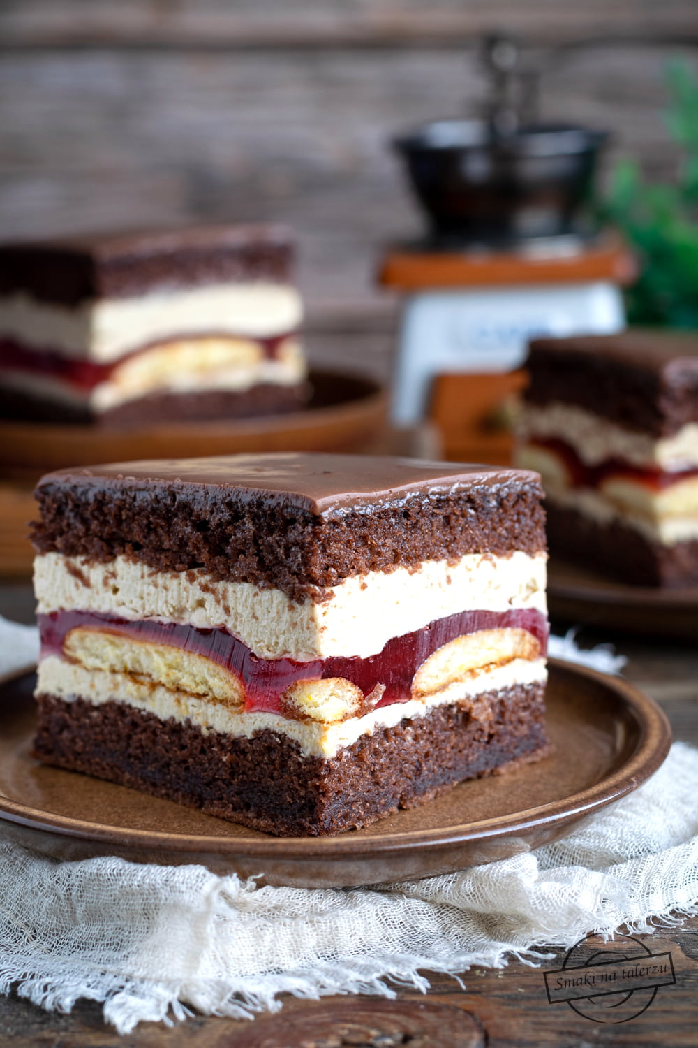Ciasto z kawowym kremem, biszkoptami i malinami