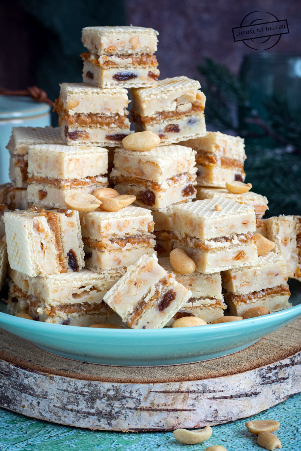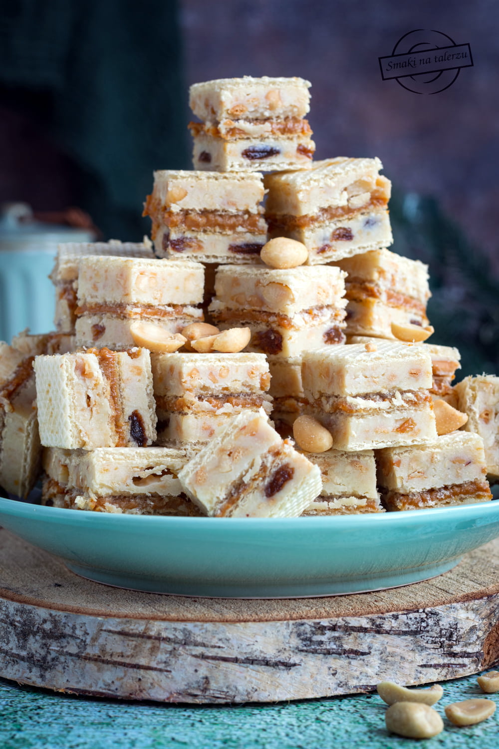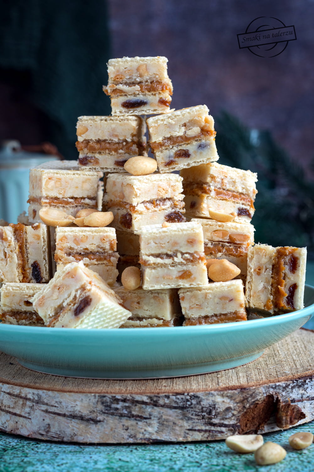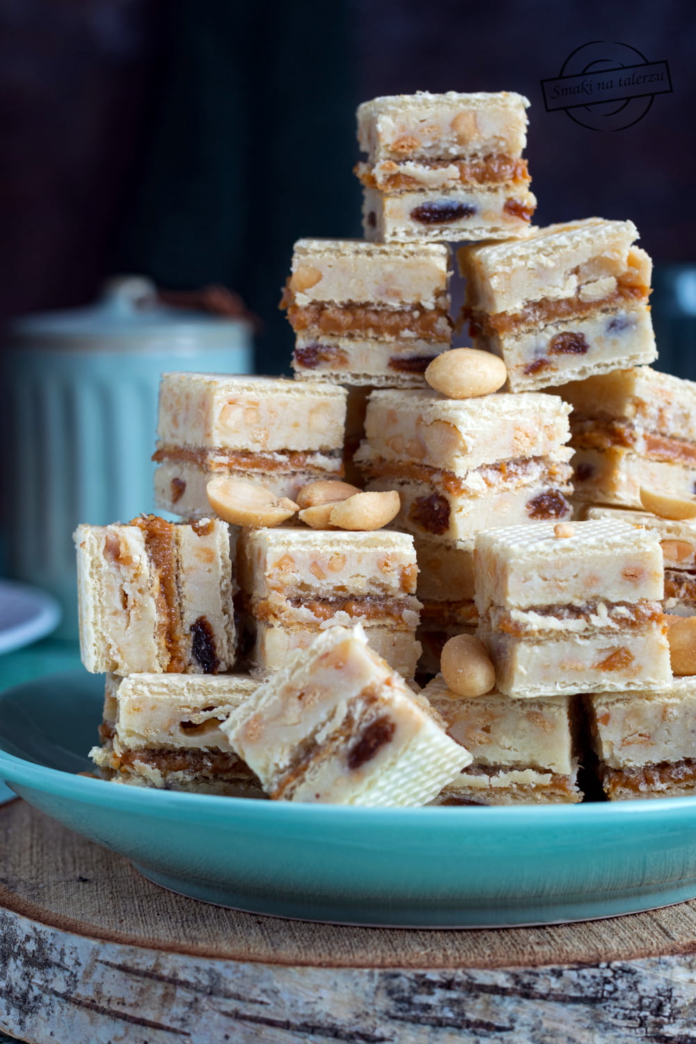 Dziś mam dla Was coś absolutnie pysznego! Wafle przekładane mleczną masą z orzeszkami ziemnymi i rodzynkami oraz warstwą kajmaku. To słodka, mleczna kostka z przyjemnie chrupiącym waflem i miękkim, kremowym wnętrzem, które rozpływa się w ustach.