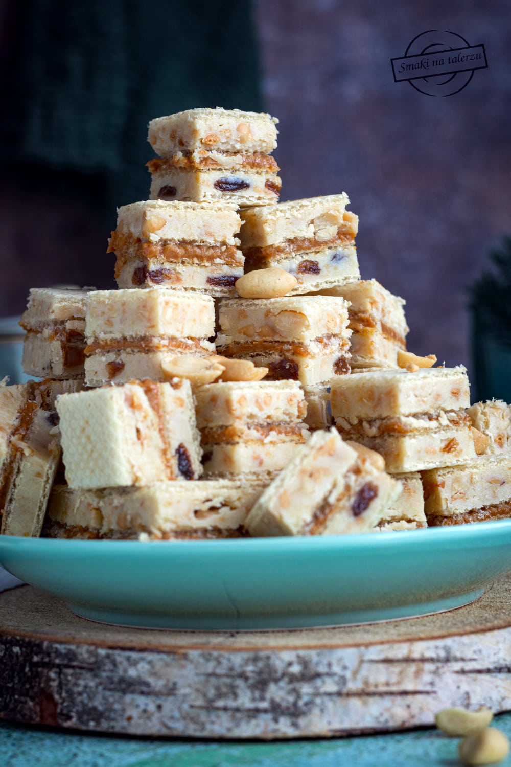 Uwielbiam te wafle za to, że są szybkie, wydajne i zawsze robią wrażenie. Pokrojone w małe kosteczki świetnie sprawdzają się na świątecznym stole, podczas spotkań rodzinnych, imprez czy jako słodki, domowy prezent. Każda warstwa wnosi coś innego: orzeszki dodają cudownej chrupkości i delikatnie słonego akcentu, rodzynki subtelnej słodyczy, a kajmak idealnie wszystko spina.