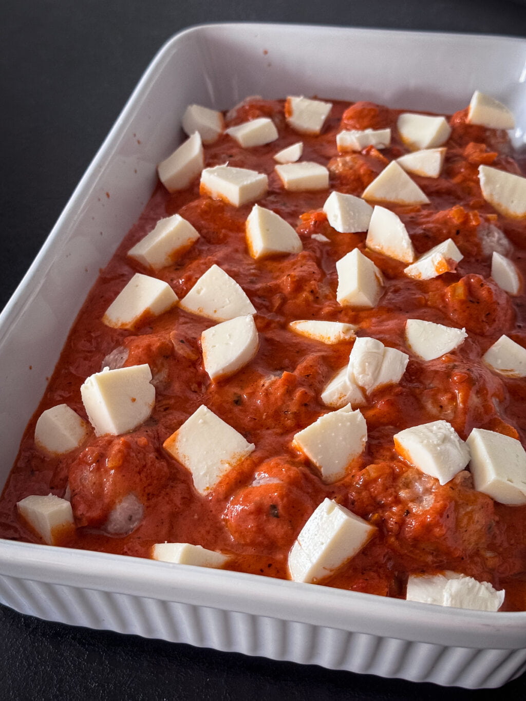 Przygotowanym sosem zalewamy pulpety. Wierzch posypujemy pokrojoną na mniejsze kawałki mozzarellą.