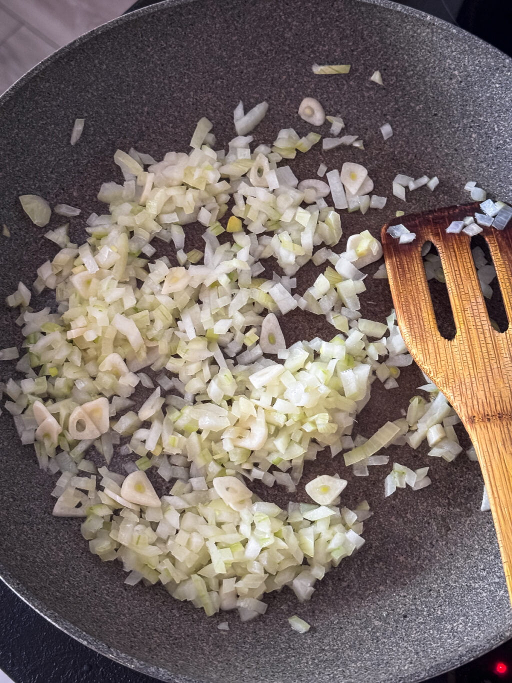 Na patelni rozgrzewamy 1-2 łyżki oliwy, wrzucamy pokrojoną w drobną kostkę cebulę oraz posiekany na cienkie plasterki czosnek. Chwilę smażymy, aż do zeszklenia.