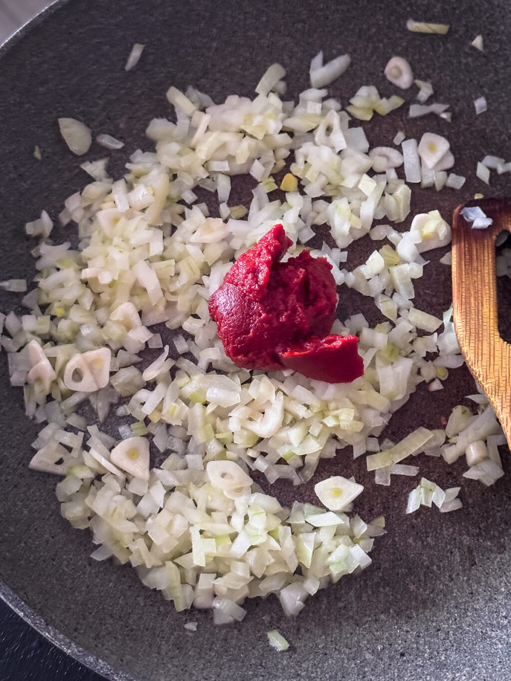 Dodajemy łyżkę koncentratu i, mieszając, smażymy przez chwilę.
