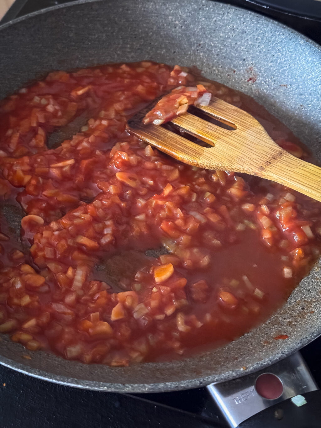 Sos pomidorowy zrobiłam z dodatkiem soku jabłkowego, ale jeśli chcesz, możesz zastąpić go zwykłą wodą.