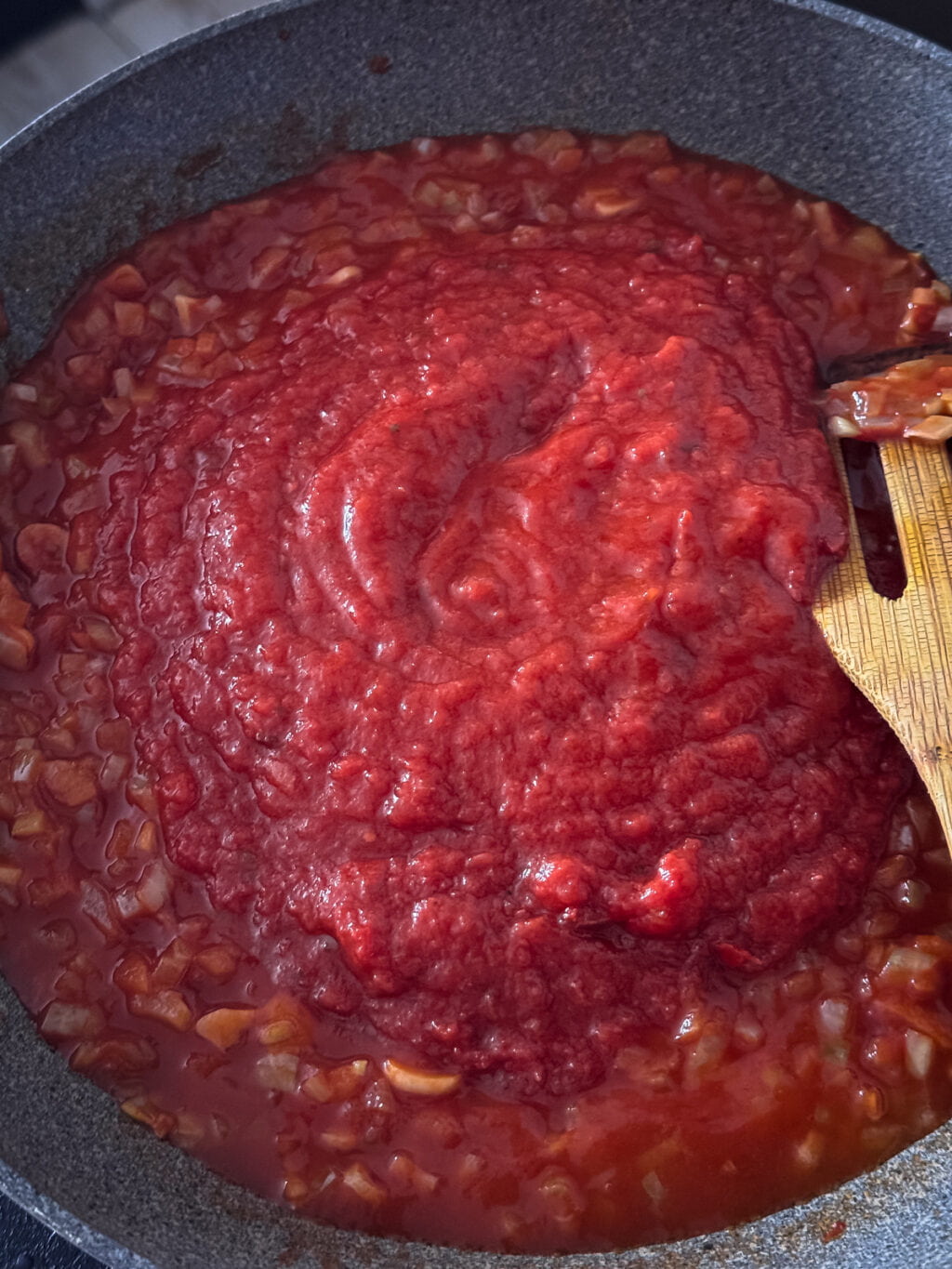 Dodajemy passatę pomidorową. Doprowadzamy do wrzenia.