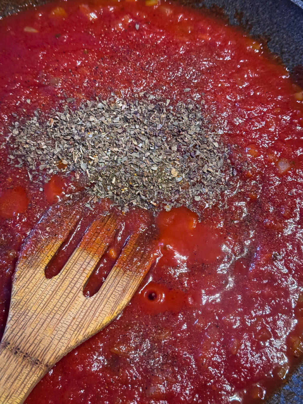 Doprawiamy do smaku solą, pieprzem, odrobiną cukru, suszoną bazylią oraz ziołami prowansalskimi (lub oregano).