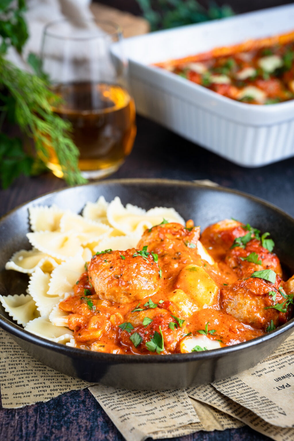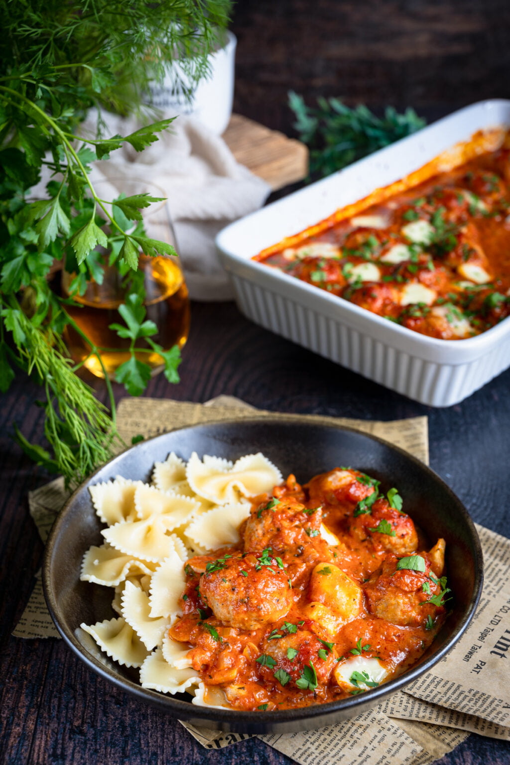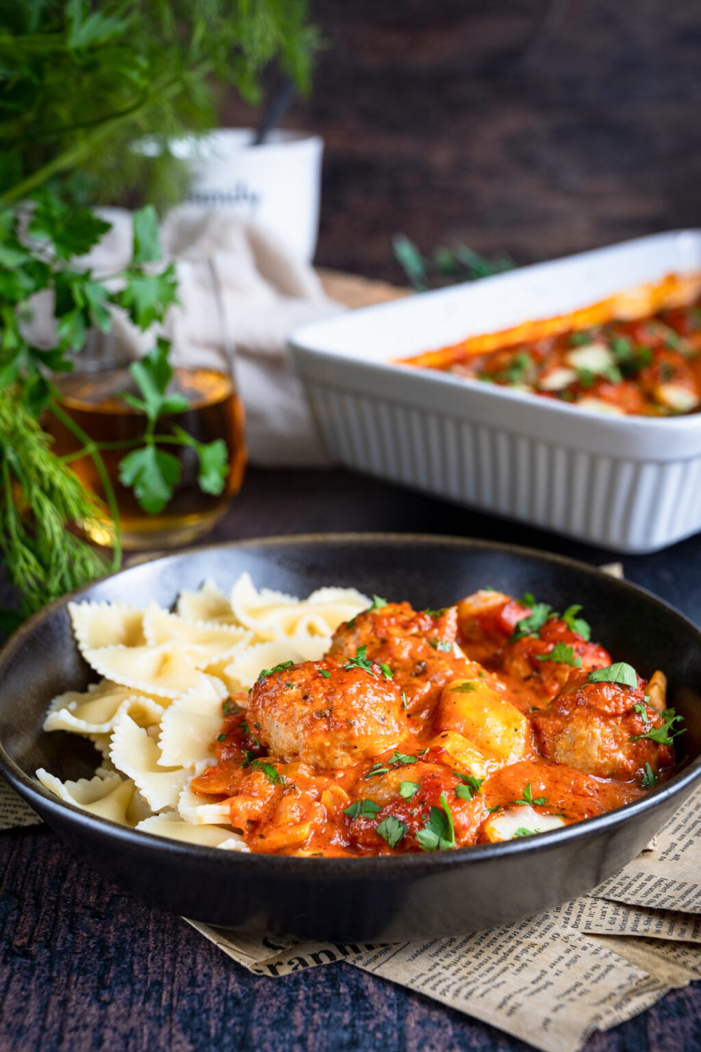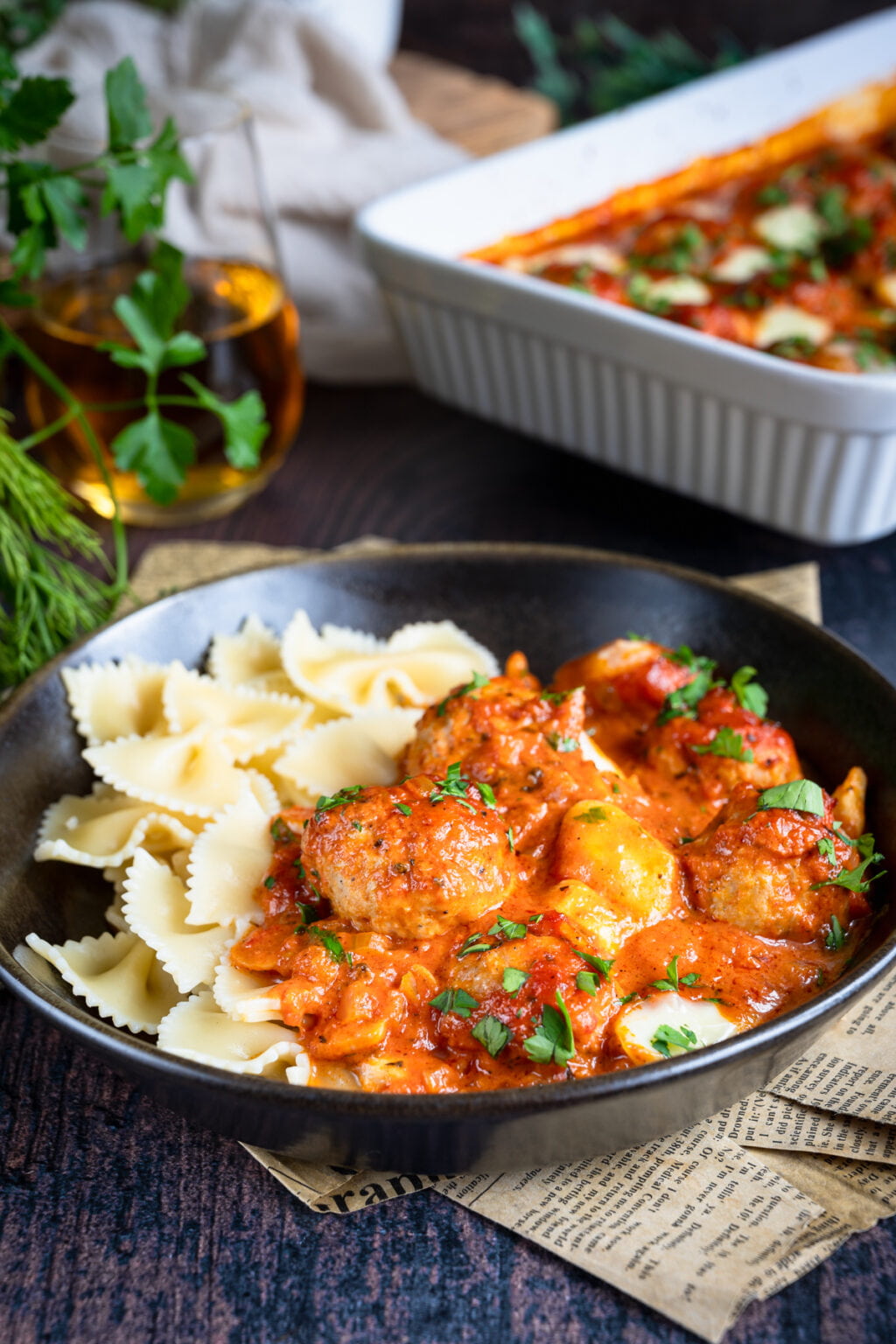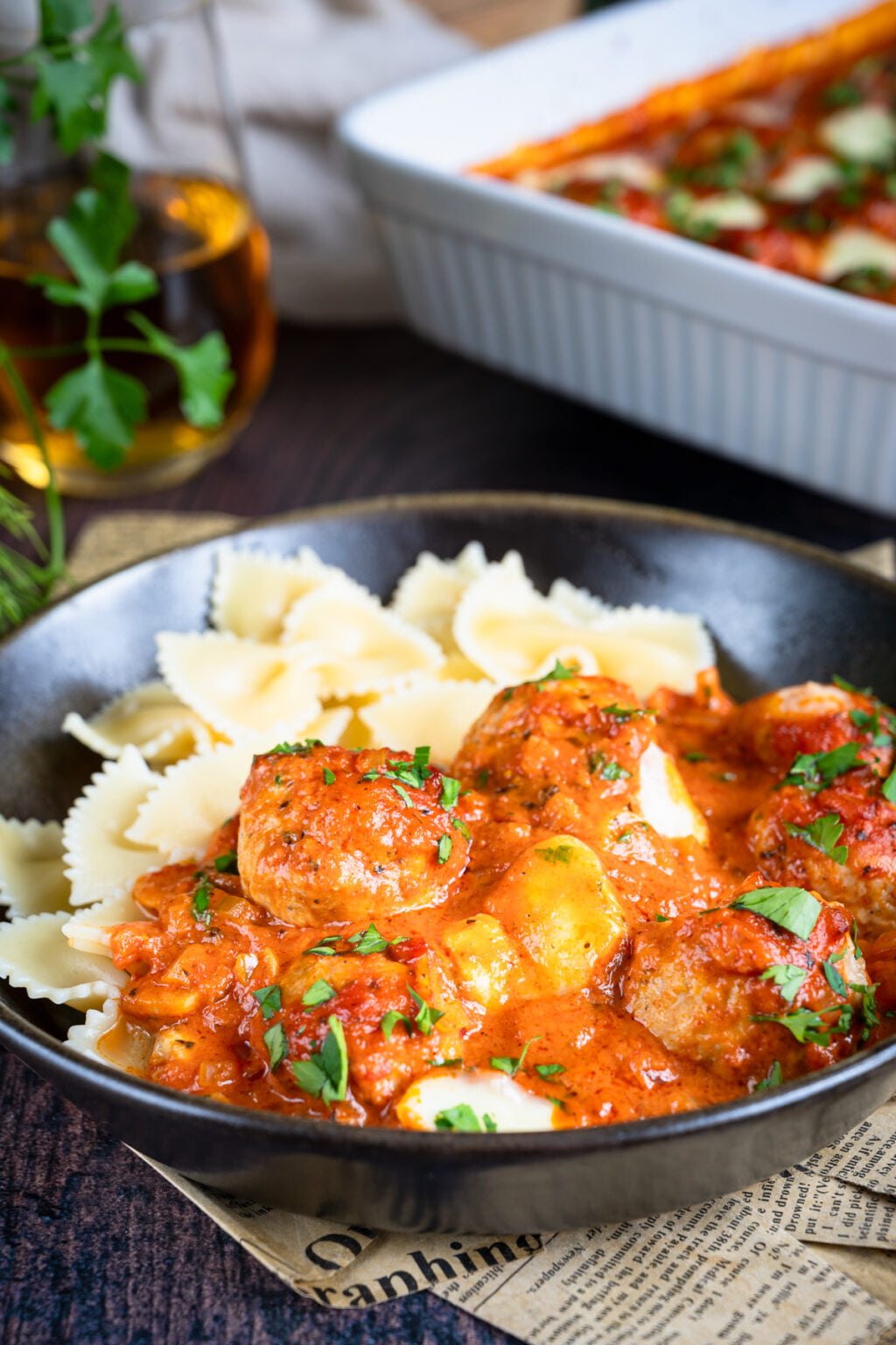 Niezwykle delikatne drobiowe pulpety pieczone w sosie pomidorowym, podane razem z ugotowanym makaronem. Co powiesz na taki obiad?