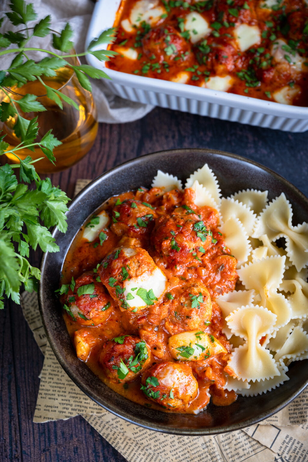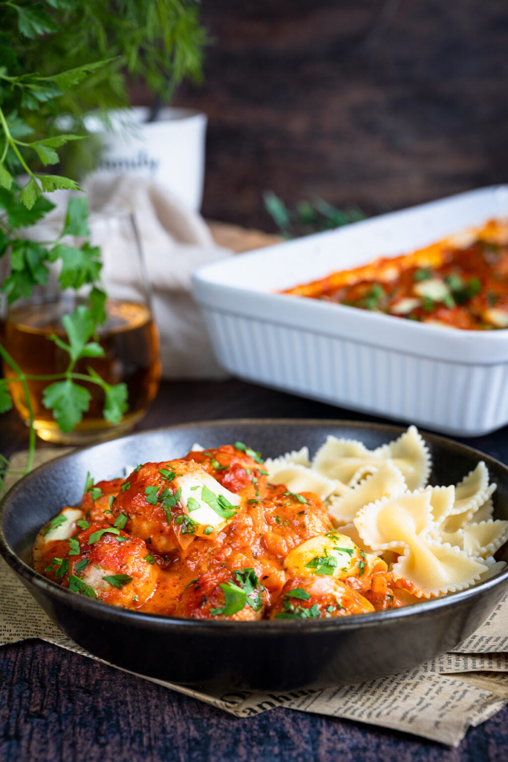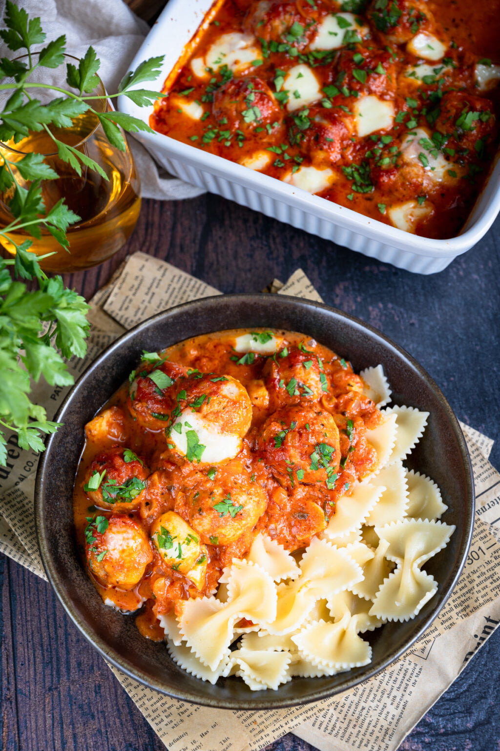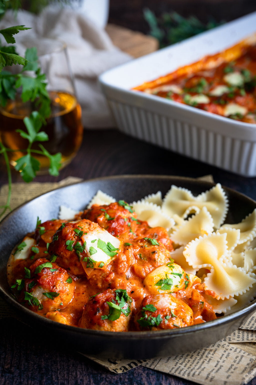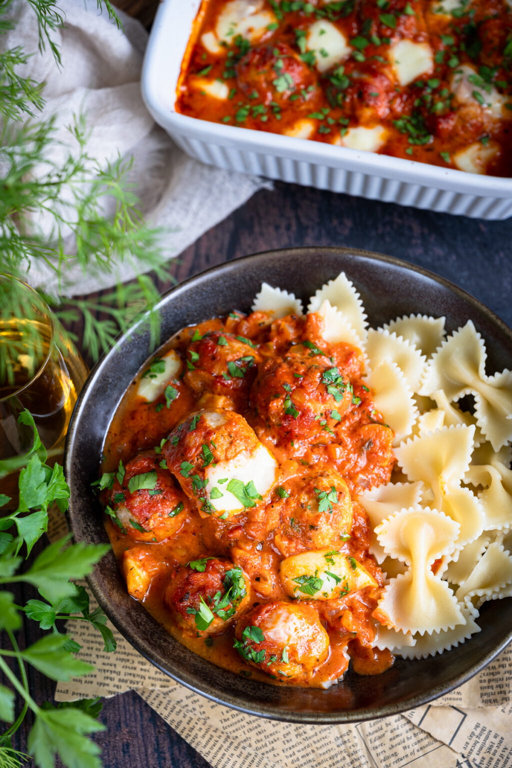 Niezwykle delikatne drobiowe pulpety pieczone w sosie pomidorowym, podane razem z ugotowanym makaronem. Co powiesz na taki obiad?