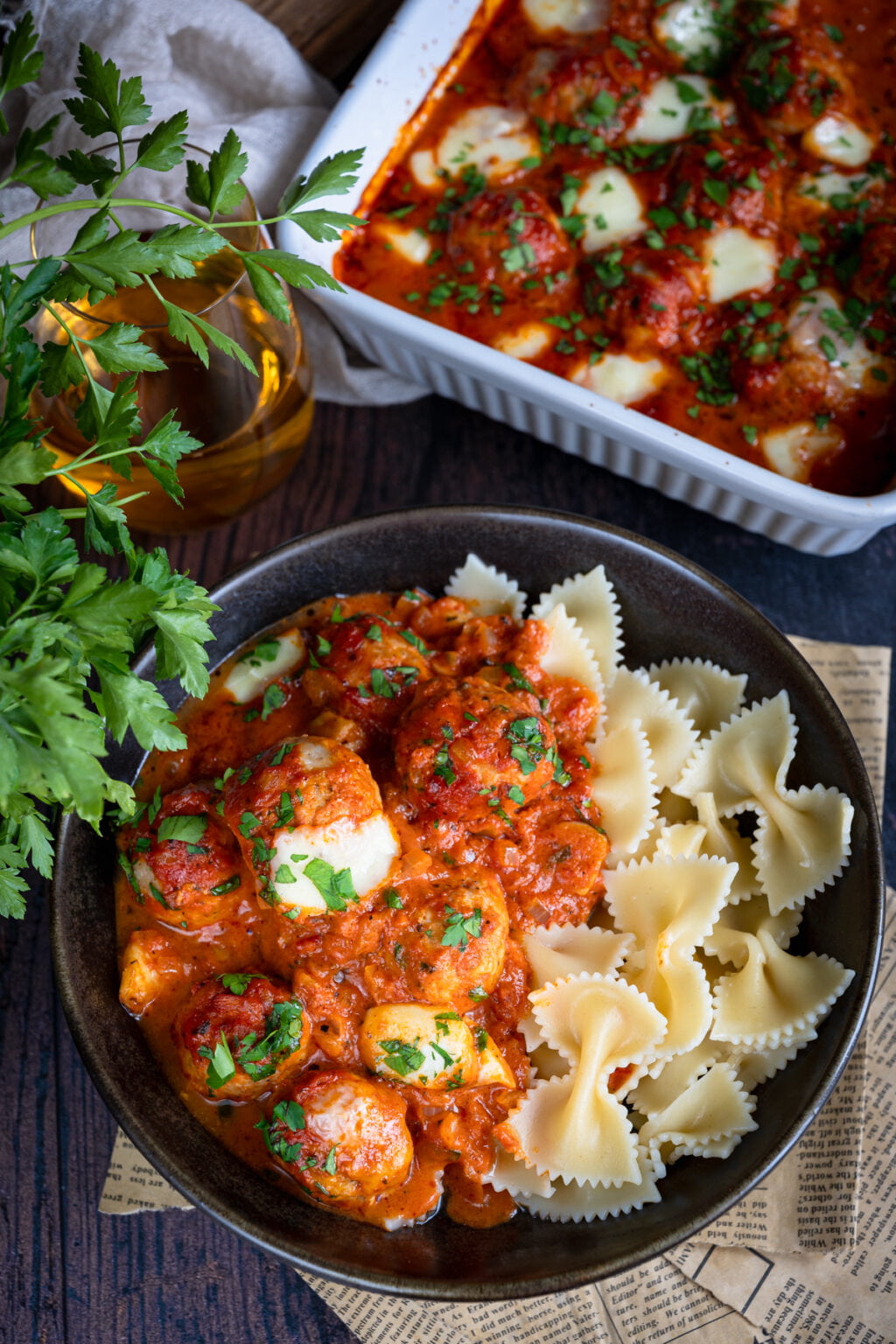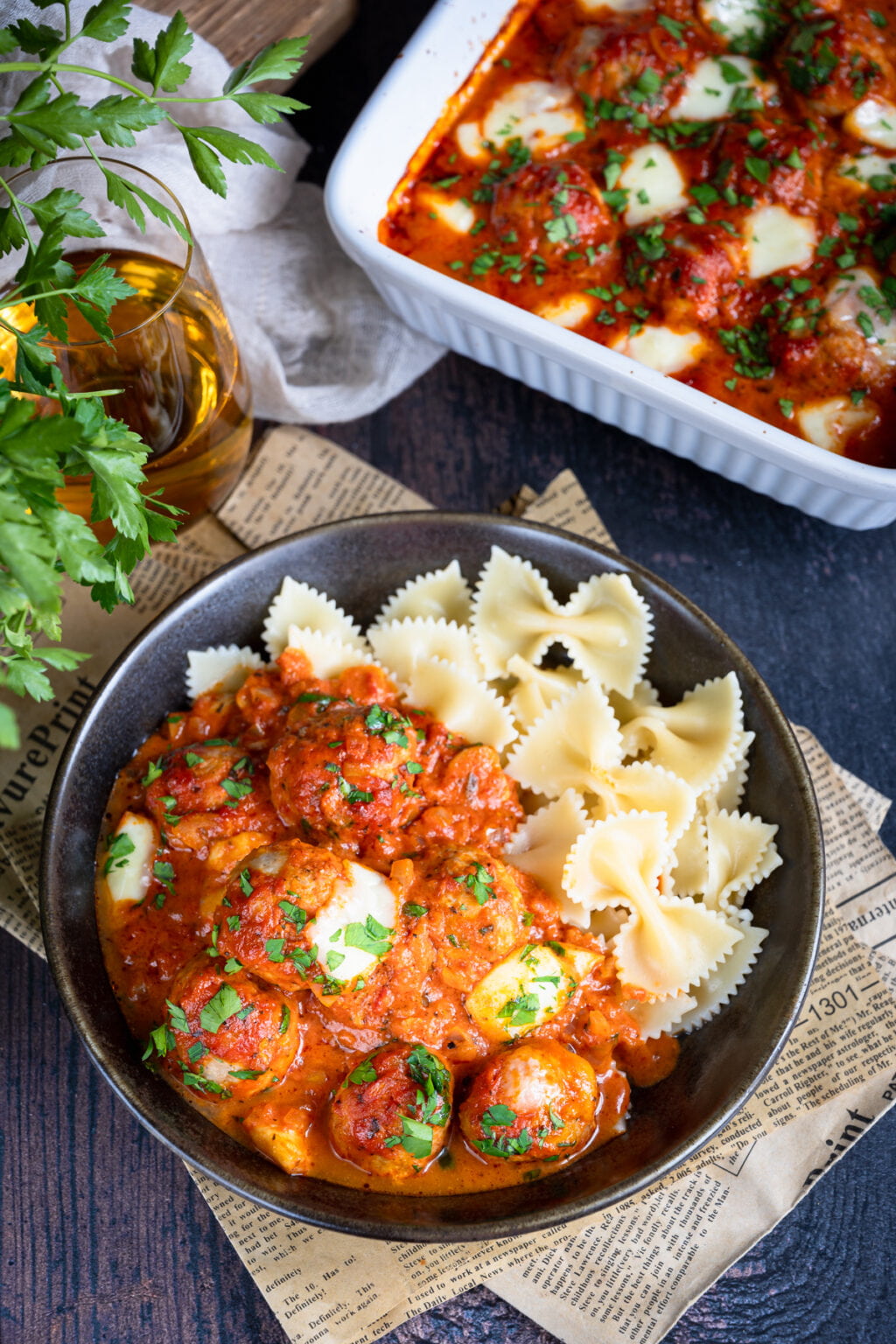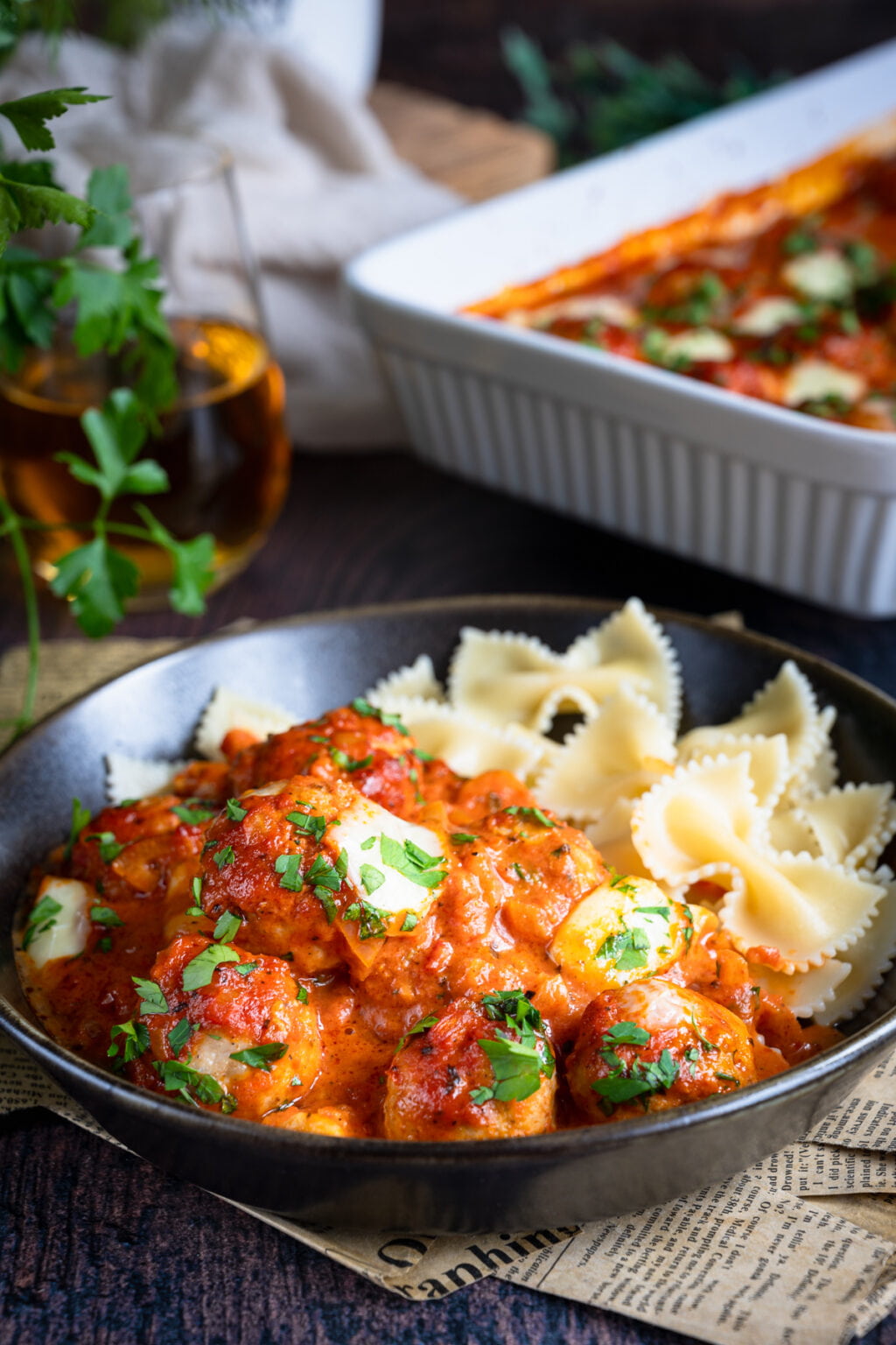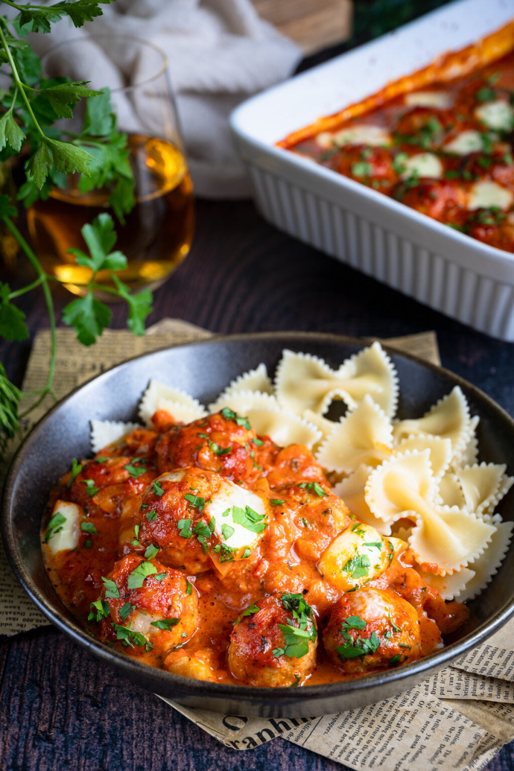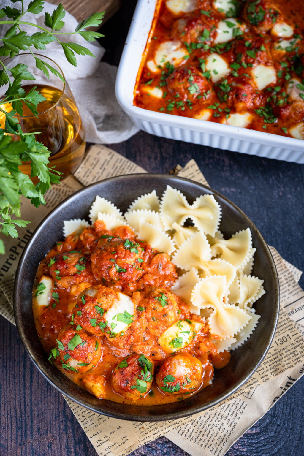 Niezwykle delikatne drobiowe pulpety pieczone w sosie pomidorowym, podane razem z ugotowanym makaronem. Co powiesz na taki obiad?