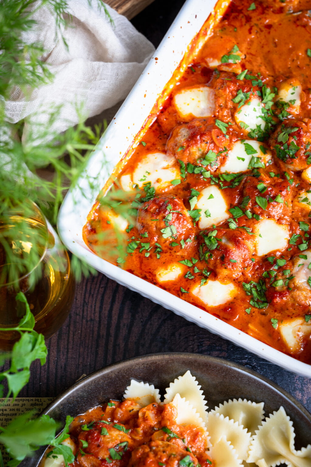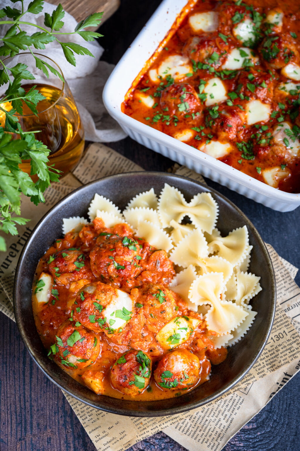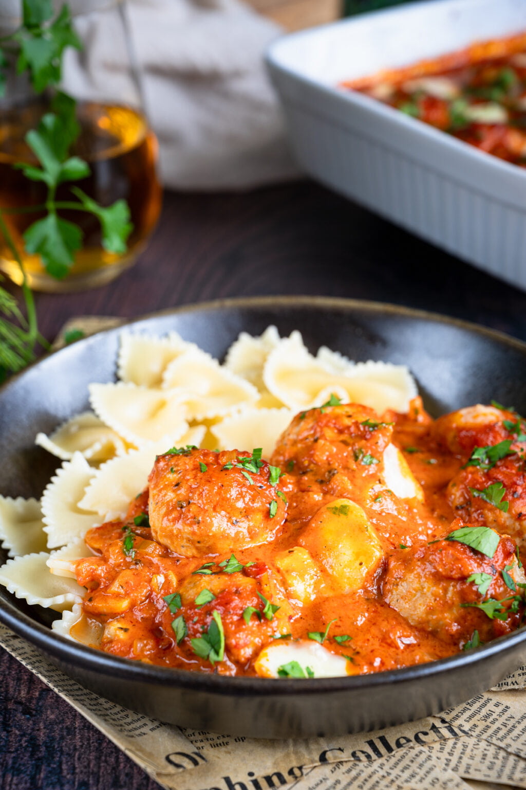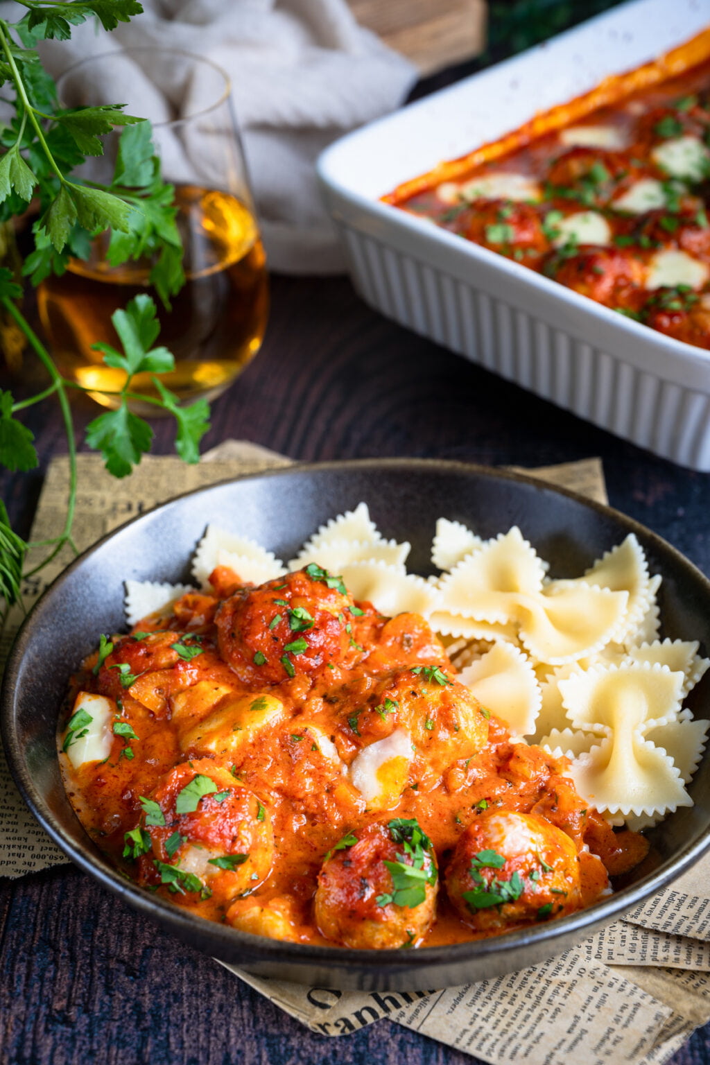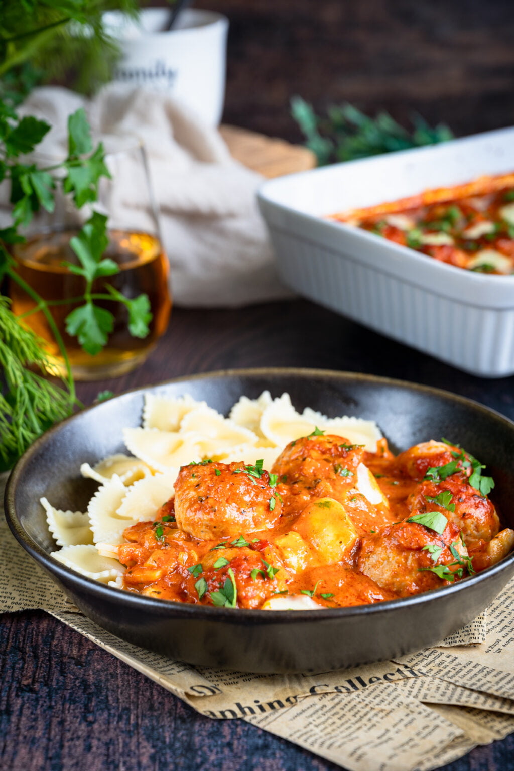 Niezwykle delikatne drobiowe pulpety pieczone w sosie pomidorowym, podane razem z ugotowanym makaronem. Co powiesz na taki obiad?