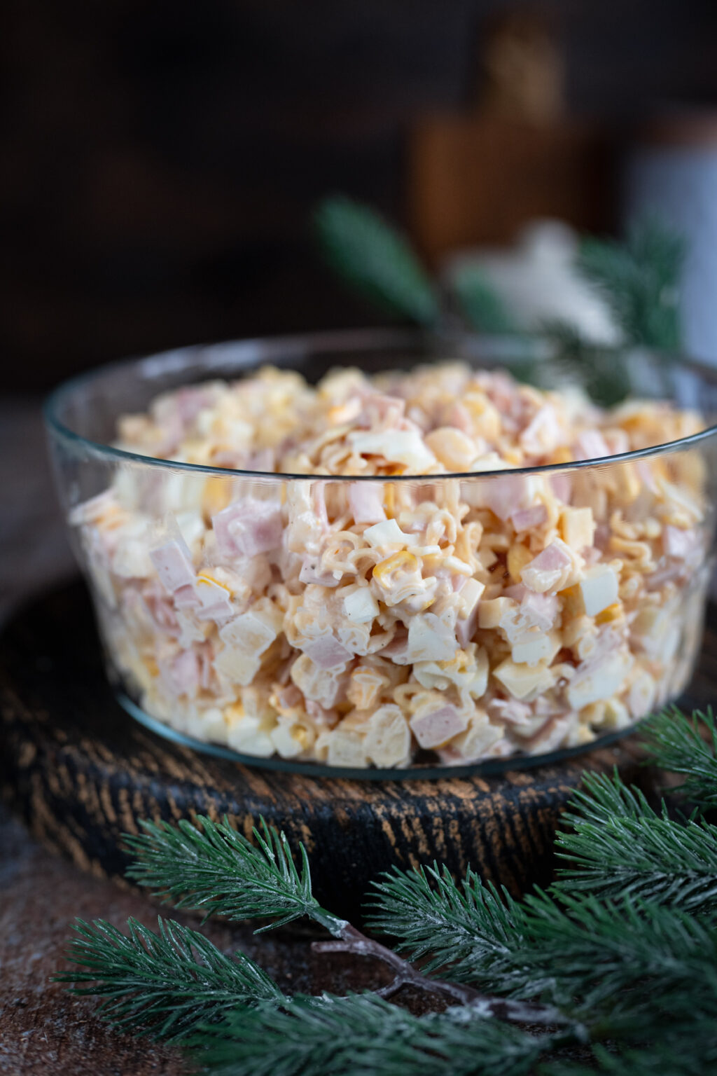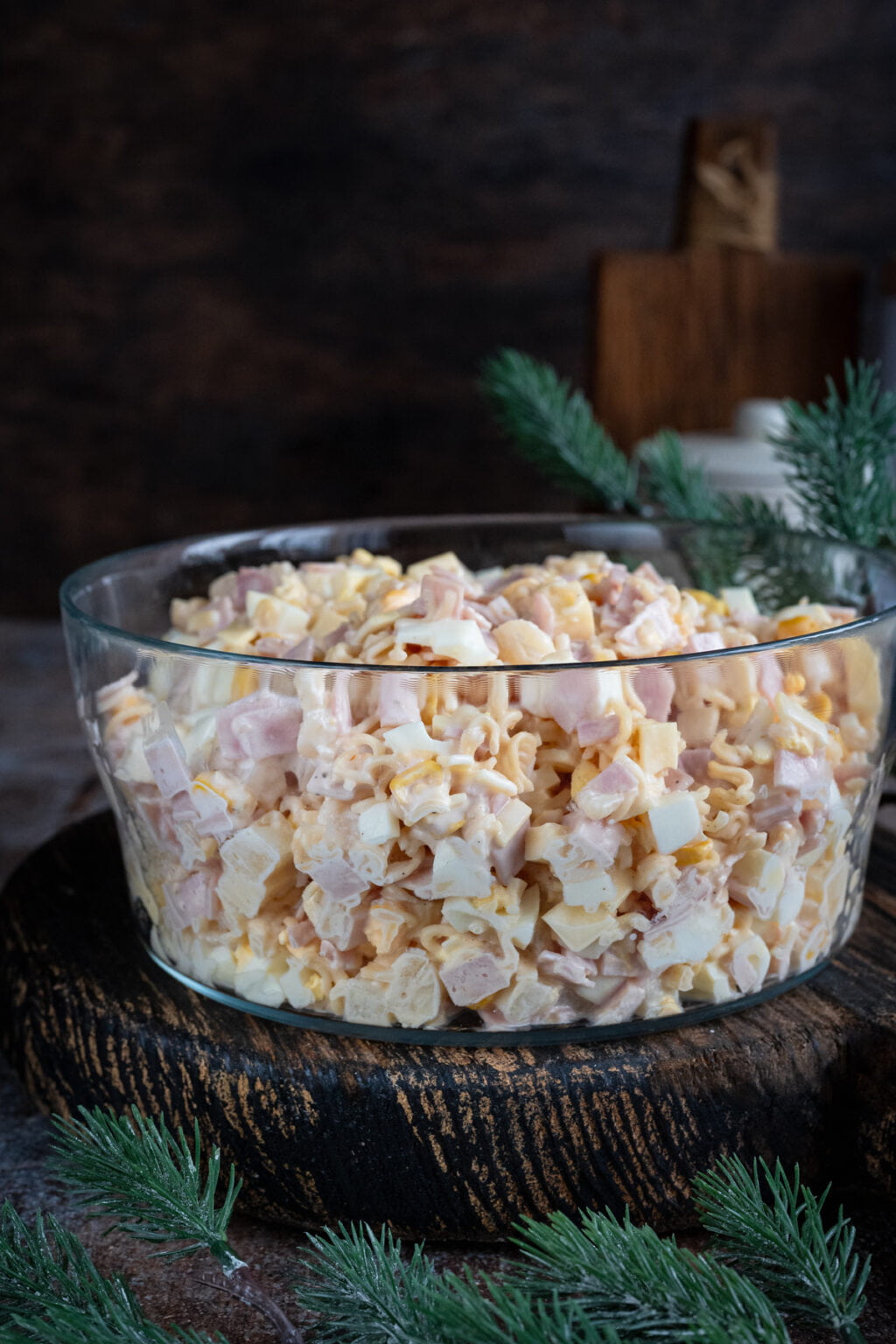 Makaron z zupki chińskiej gra tu rolę bazy, ale nie dominuje całości (dajemy tylko 1 opakowanie). Do tego szynka konserwowa, jajka, ser żółty i kukurydza tworzą znajome, bezpieczne połączenie, a ananas dodaje lekkiej słodyczy i przełamuje cięższe składniki. Sos na bazie majonezu, jogurtu i ketchupu idealnie współgra ze wszystkimi składnikami.