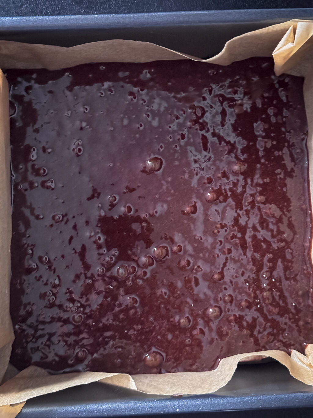 Masę czekoladową wylewamy na blaszkę (20x20cm) wyłożoną papierem do pieczenia. Wstawiamy do piekarnika nagrzanego do 175 stopni i pieczemy przez około 30-35 minut (do suchego patyczka).