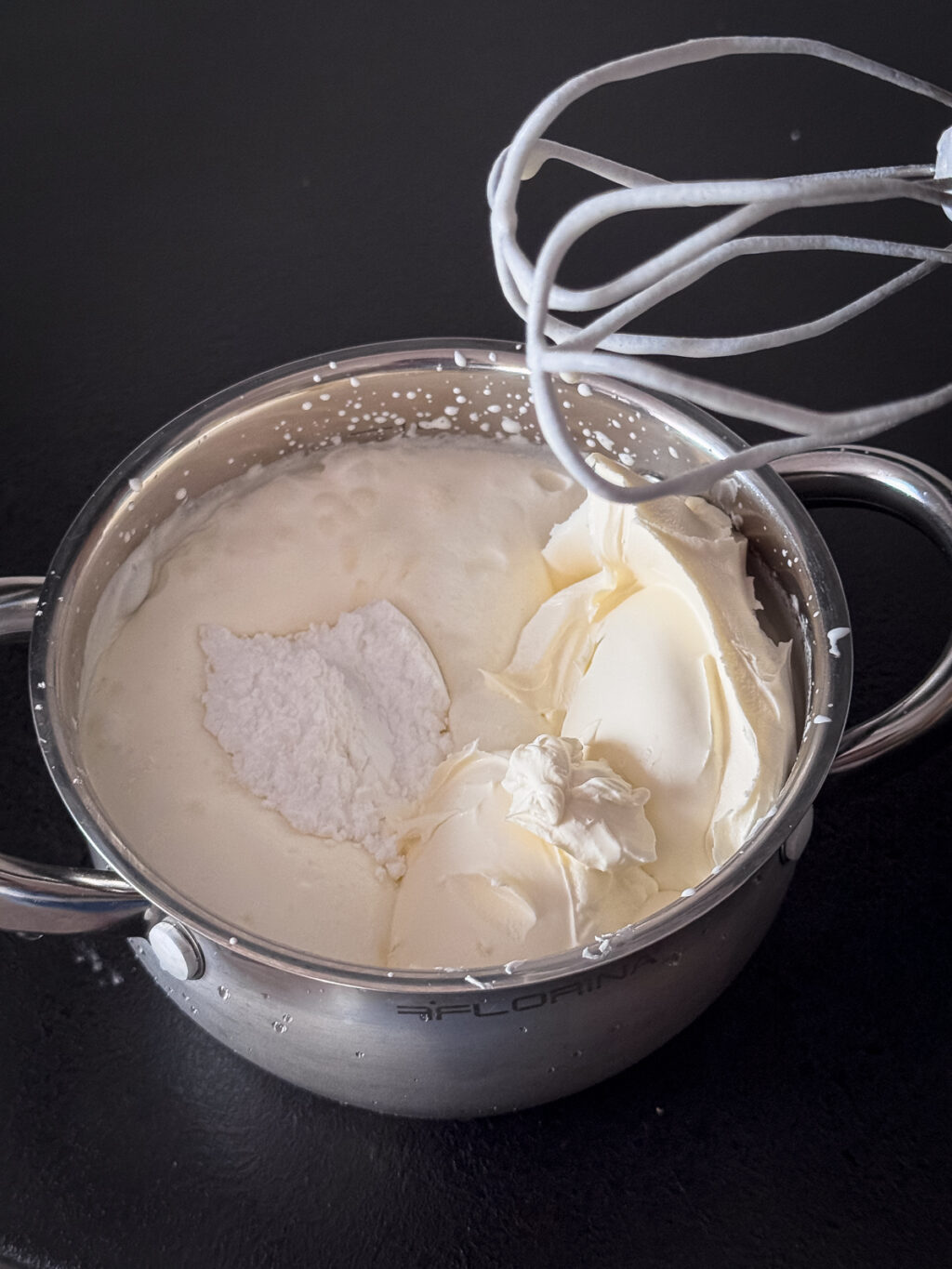 Schłodzoną śmietankę ubijamy wraz cukrem pudrem na sztywno (jeśli chcesz, możesz dla pewności dodać pod koniec 1 op. śmietan-fixu). Pod koniec dodajemy mascarpone oraz ekstrakt. Miksujemy do połączenia.