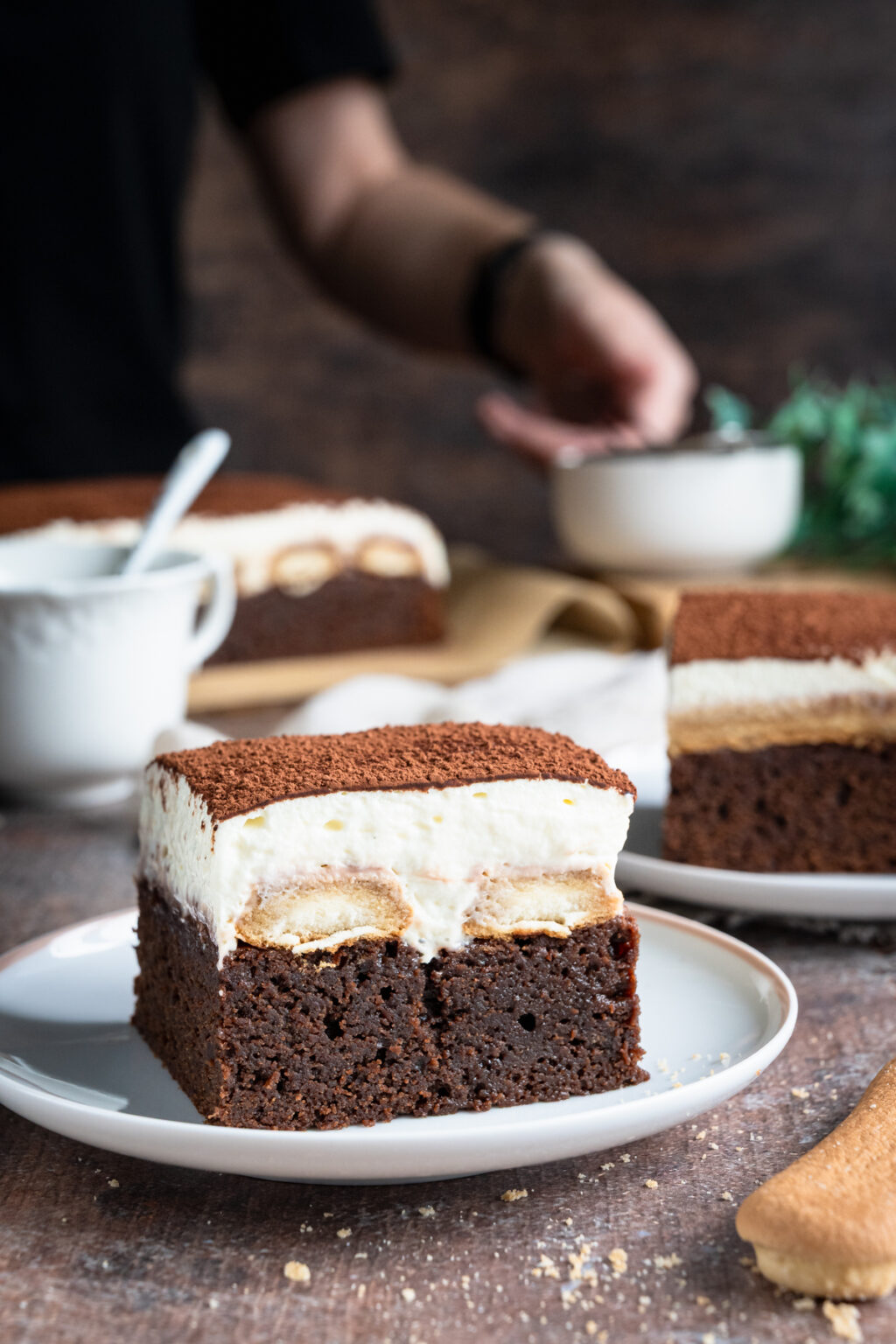 Bazą jest głębokie, lekko wilgotne brownie, przygotowane z dodatkiem gorzkiej i deserowej czekolady, ciemnego kakao oraz kawy. Na wierzchu układamy nasączone kawą podłużne biszkopty typu lady fingers. Kolejnym krokiem jest rozprowadzenie kremu śmietankowego z mascarpone, tworząc warstwę, która pięknie dopełnia całości.