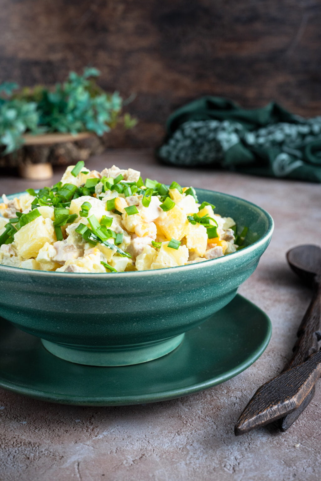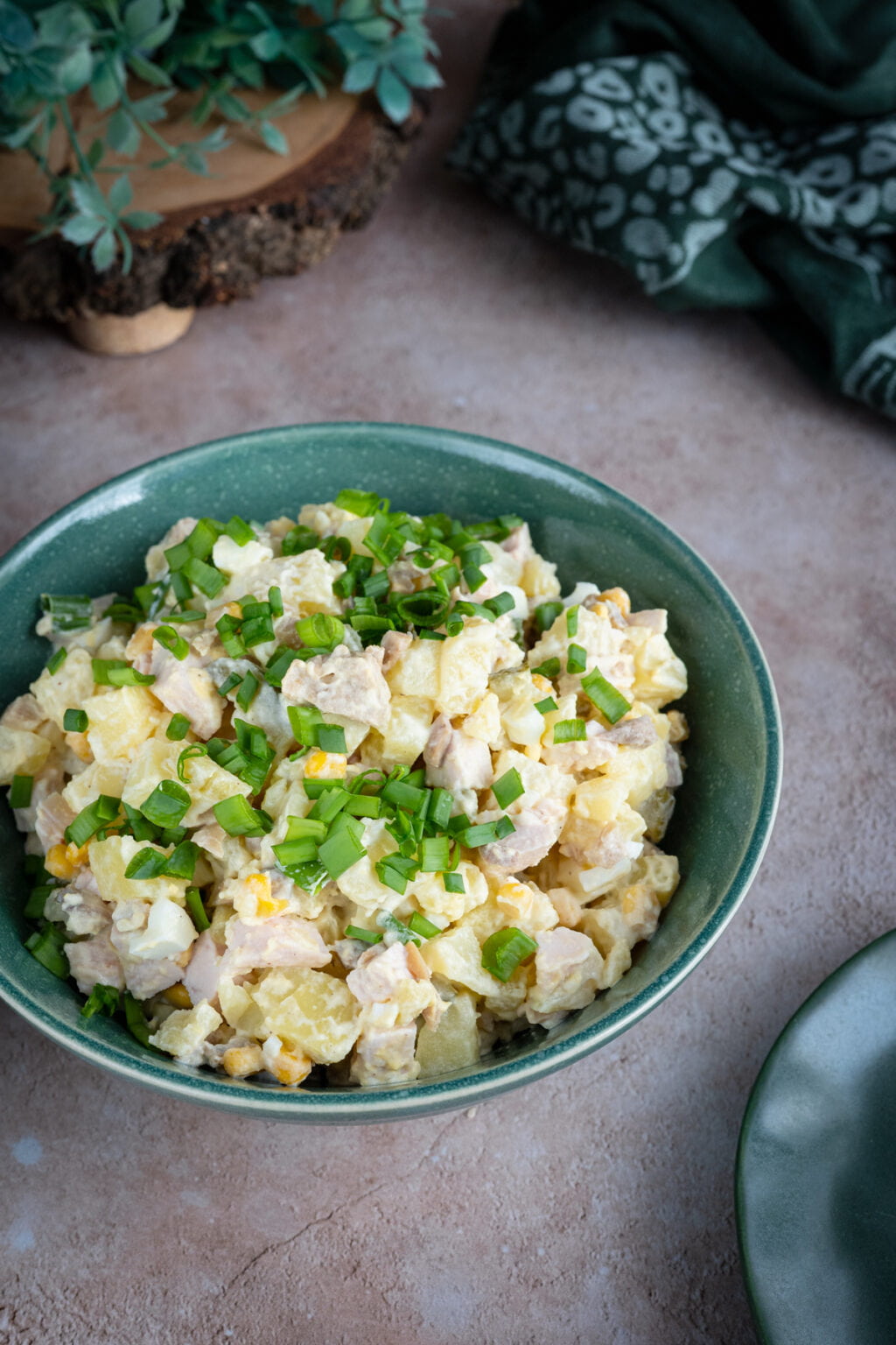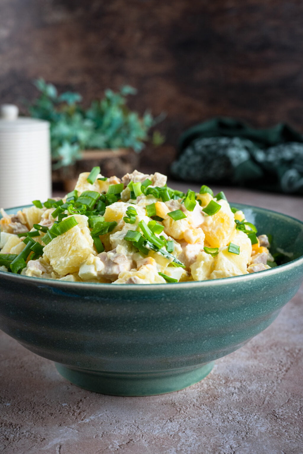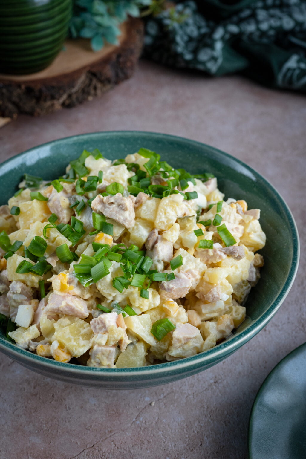 Ziemniaczana sałatka z wędzonym kurczakiem i marynowanymi pieczarkami to jedna z tych sałatek, które wyglądają niepozornie, ale zawsze szybko znikają ze stołu.