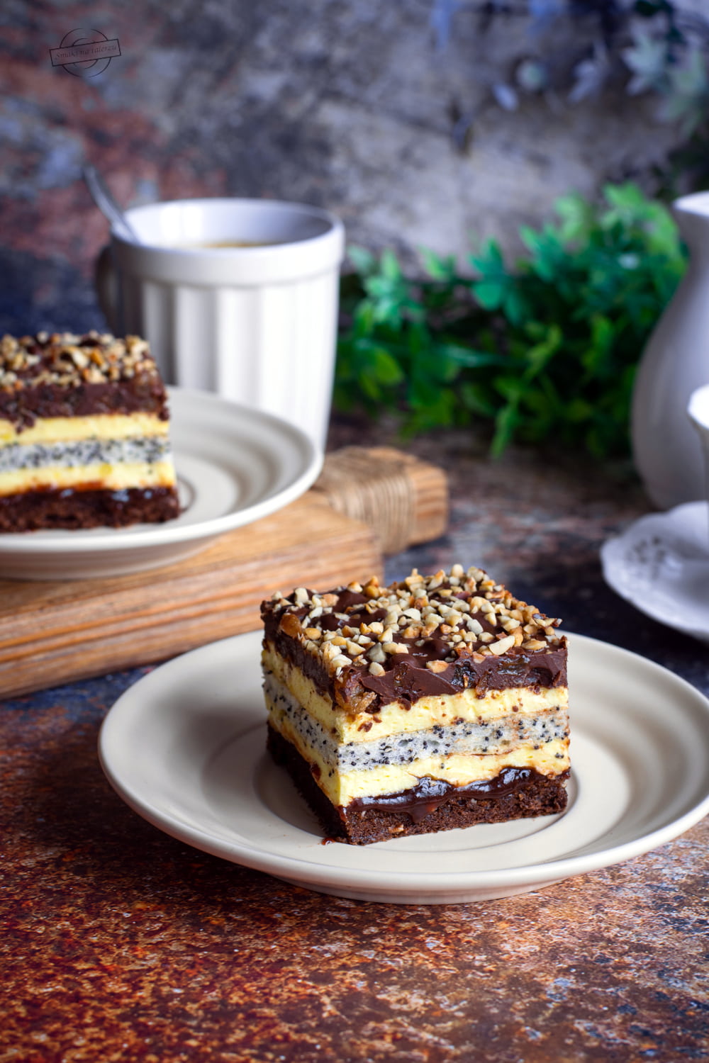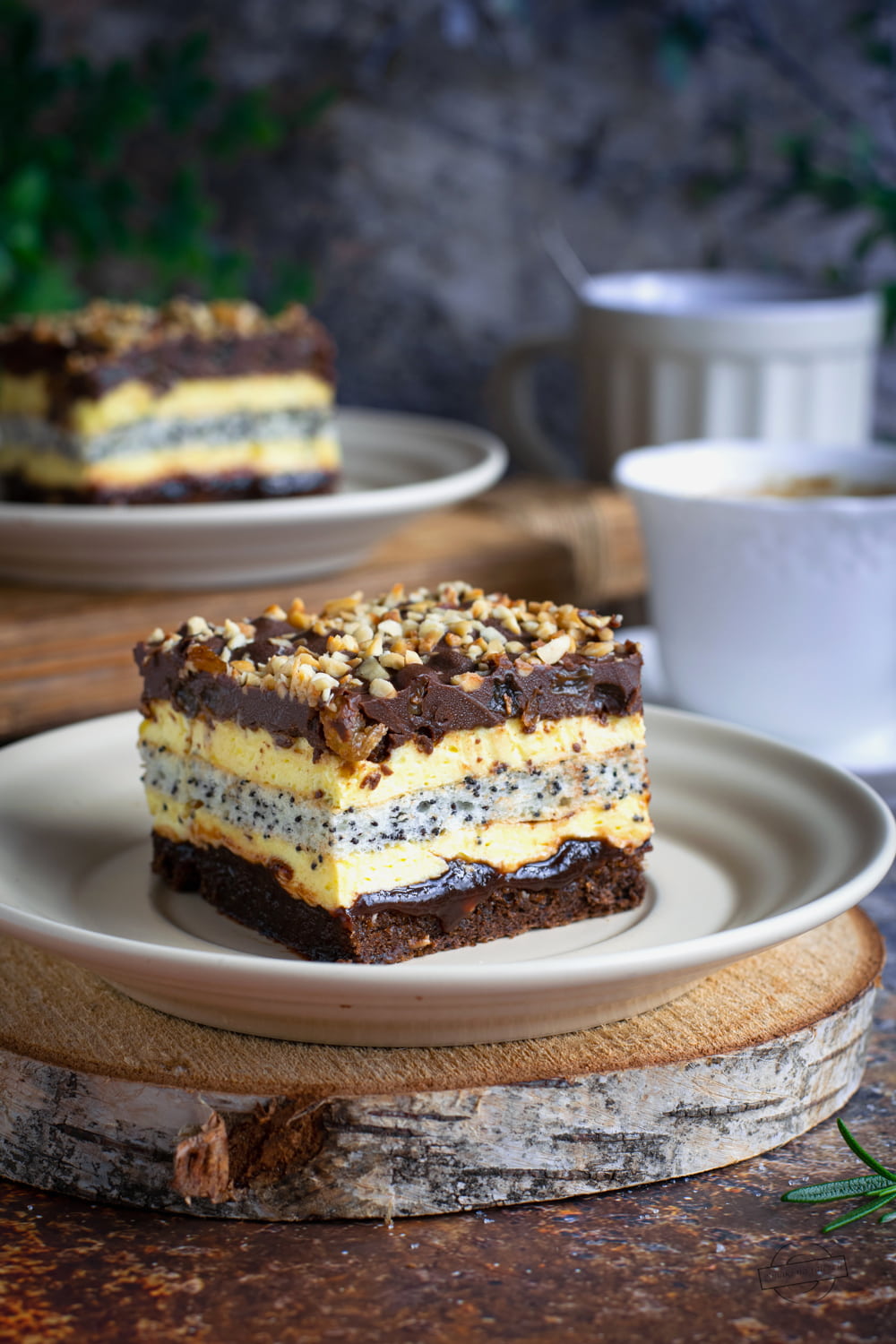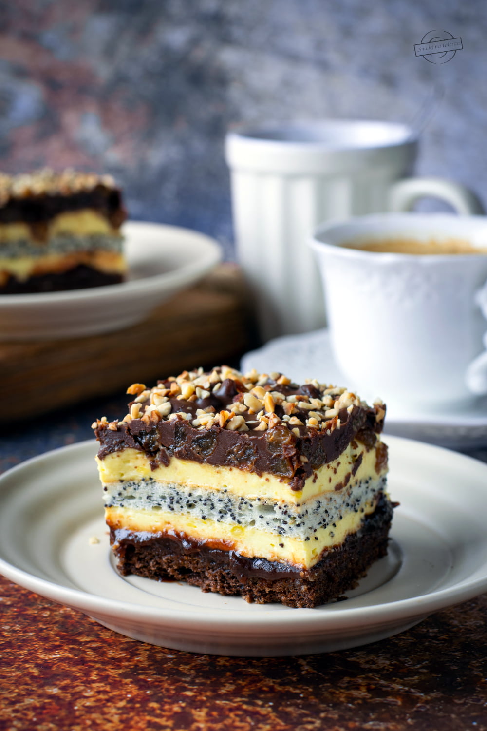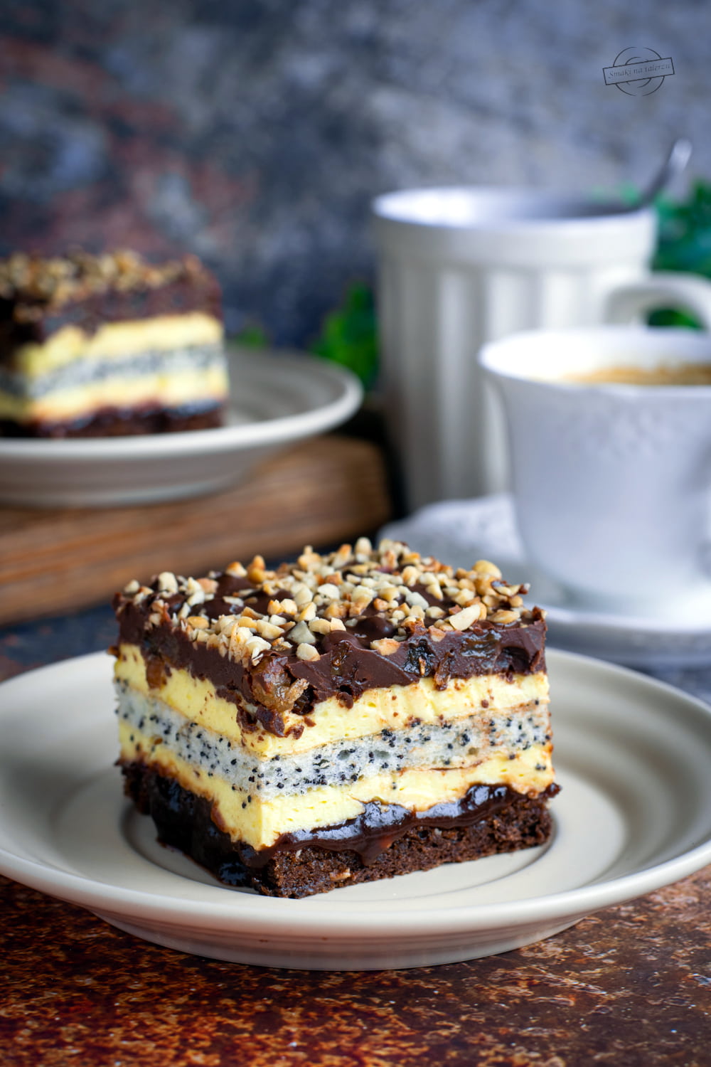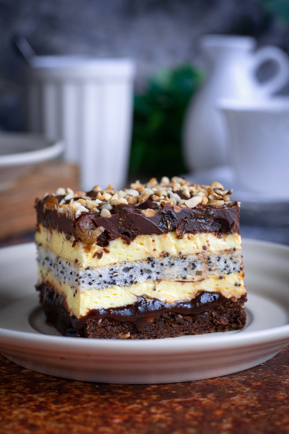 Tym razem przygotowałam ciasto na biszkopcie kakaowym, przełożone jasną masą budyniową z dodatkowym biszkoptem białkowo-makowym. Wyszło rewelacyjnie.